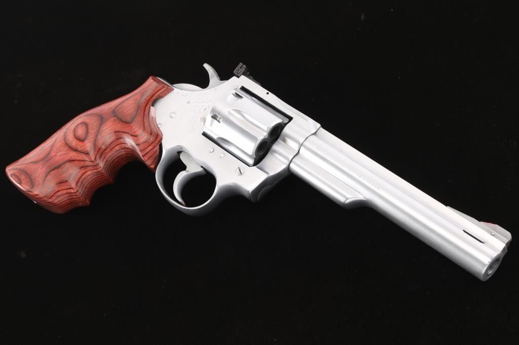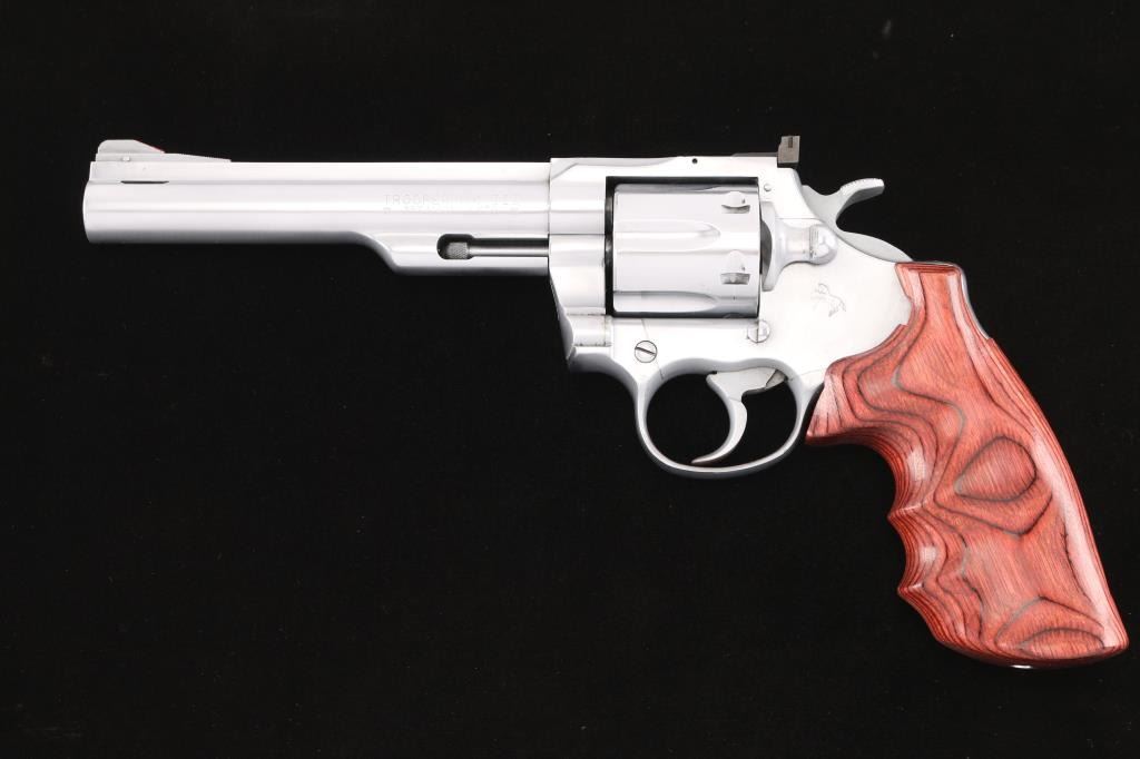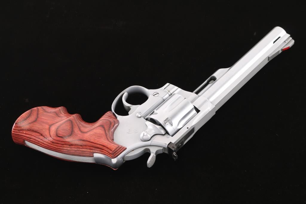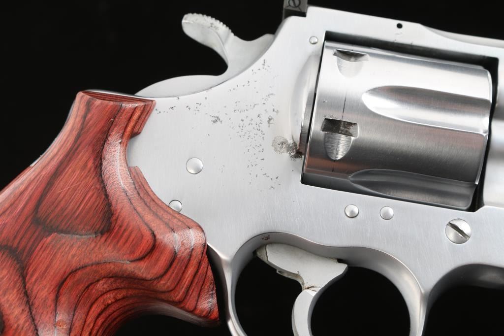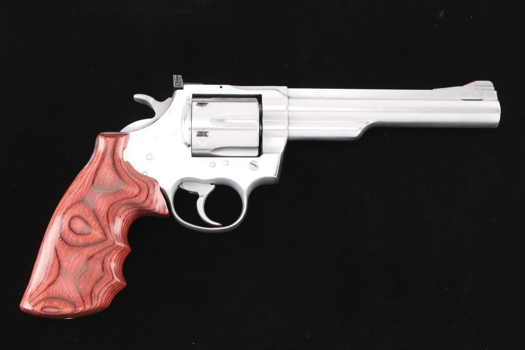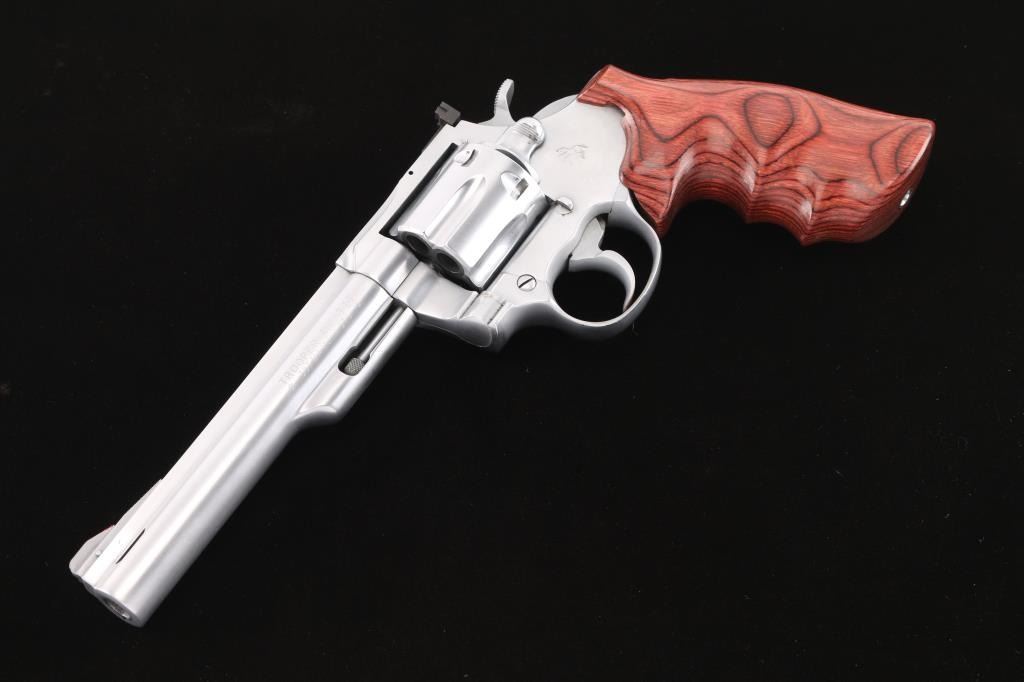American made DA/SA 6 shot revolver, circa 1976. Features an electroless nickel finish, 6" ported barrel with a full length sighting rib, pinned and raised serrated ramp front sight with red paint, pinned adjustable white square notch rear sight, shrouded extractor rod, smooth trigger and knurled wide hammer. Fluted six shot cylinder, smooth rosewood finger groove grip. Bore is bright with strong rifling. Retains approx. 75% finish with some pin prick pitting on the frame and some scattered nicks. Drag line on cylinder. Action is smooth with tight lockup. Grip is excellent. NRA condition is good+.***Modern Firearm***