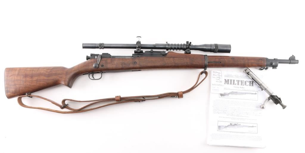This 1903 has been refurbished by Miltech and is now in 1903A1 USMC Sniper configuration. The MILTECH 1903 Springfield comes equipped with a brand new barrel, a new bolt, a new ejector and extractor, a new firing pin and sear, a new stock and a calibrated, tight rear sight to insure the extreme accuracy. Has all the original features of the M1903, matte black parkerized finish, "C" stock, barrel marked "SA Flaming Bomb 5-42" . Mounted with a J. Unertl 8X scope/rings with fine crosshair reticle, clear optics, steel lens caps. Bore is pristine, rifle is in like new condition. M1907 type brown leather sling attached. Comes with paperwork and refurbished bolt labeled "Bolt for 1903 Marine Sniper"NRA Condition-Perfect. C&R Firearm.