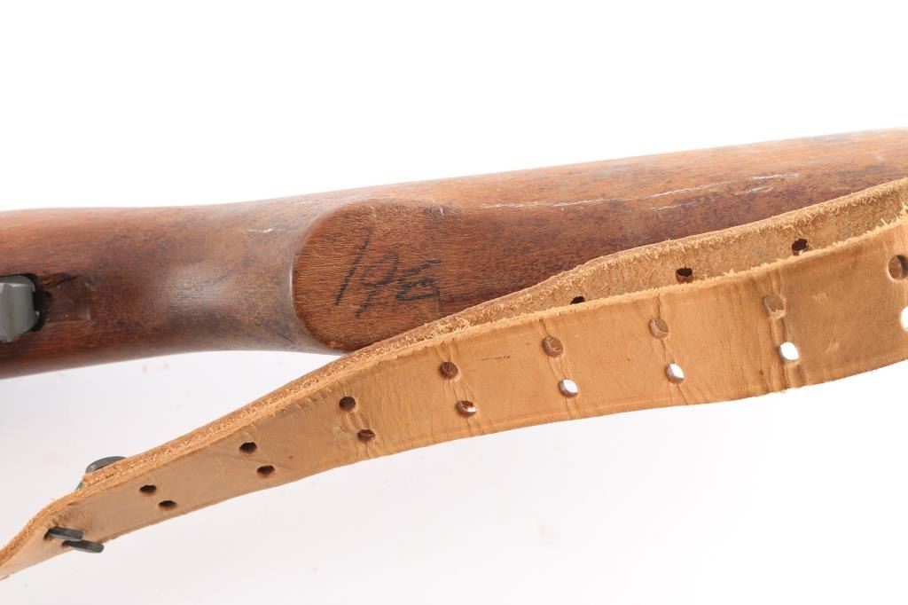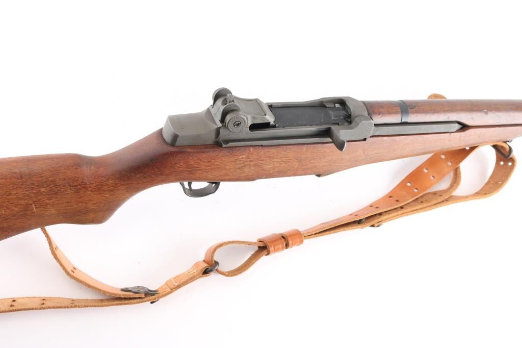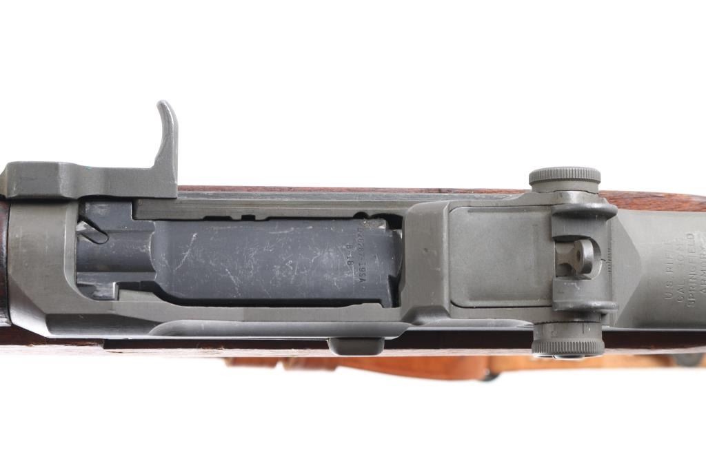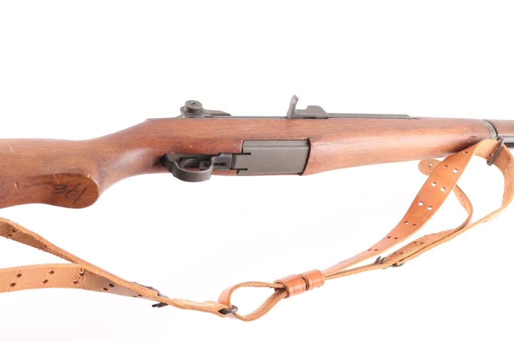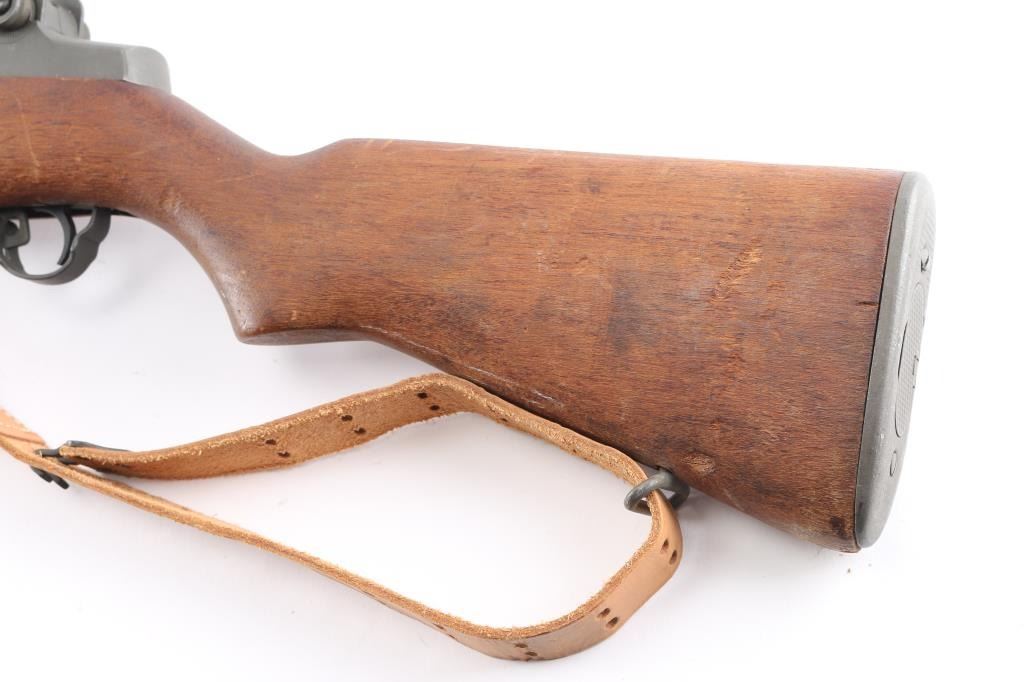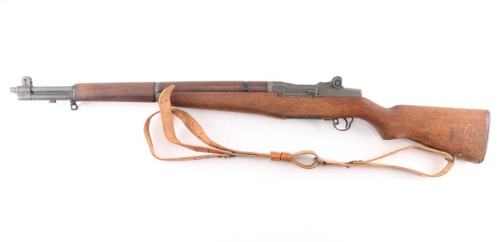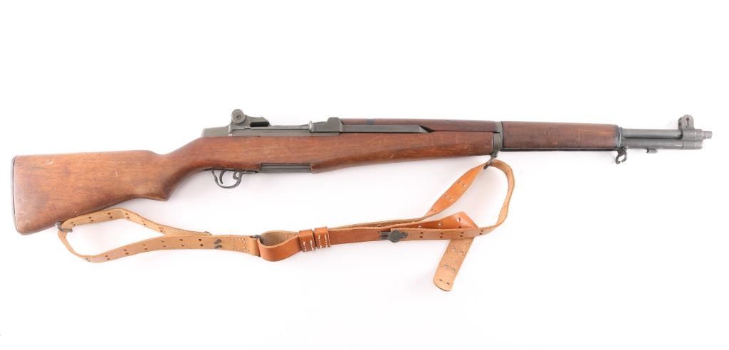 Arsenal rebuilt WWII era U.S. Military clip-fed semi-automatic service rifle chambered in .30-06 Springfield, manufactured circa 1943. Rifle has been re-imported by Blue Sky with "ARLINGTON, VA" stamped in the left side of the barrel. Features a parkerized finish, 24" barrel marked " 1 SA 3-45", shrouded blade front sight, adjustable rear aperture sight marked "DRC", bayonet lug, stacking swivel, smooth trigger, milled trigger guard, manual safety, "SA" marked operating rod, trigger housing, hammer & bolt, the receiver is marked "D28291 35". Smooth walnut handguards and semi-pistol grip shoulder stock with trapdoor metal buttplate. The stock is marked with "195" in grease pencil on the underside of the grip. No cartouches observed. Rifle retains approximately 90% parkerizing showing scattered wear & scuffs. Action is smooth, the bore is very good/bright, strong rifling, needs cleaning, and the wood stocks are good/sound with numerous minor scratches. M1907 brown leather sling attached.Condition is NRA Good+. C&R Firearm.