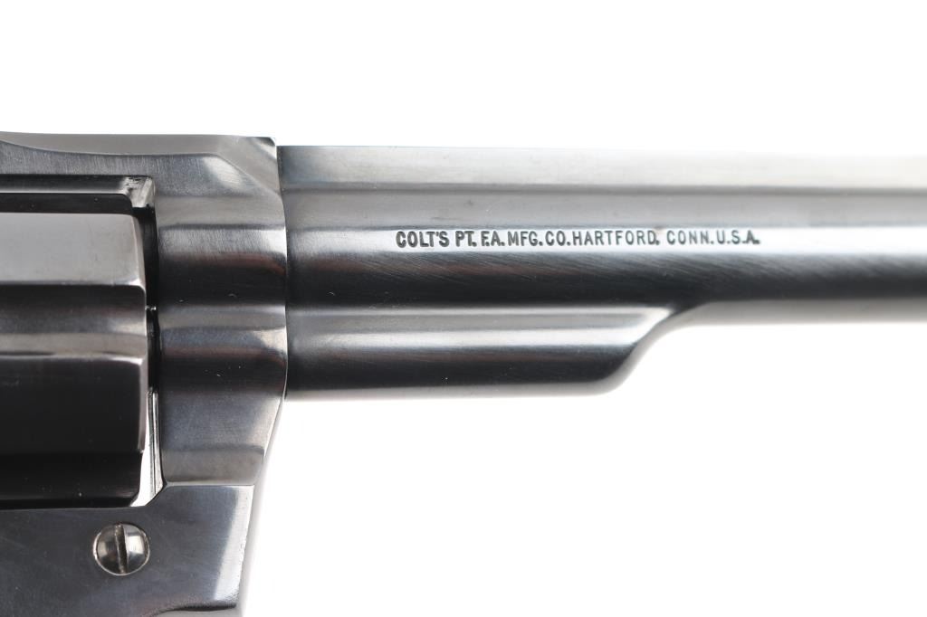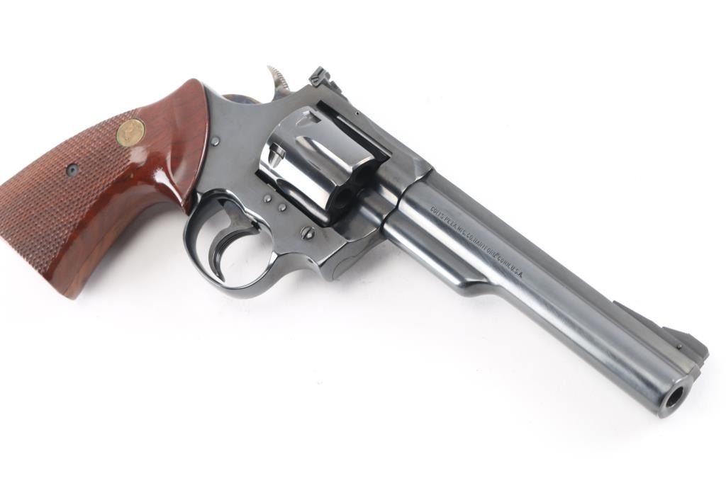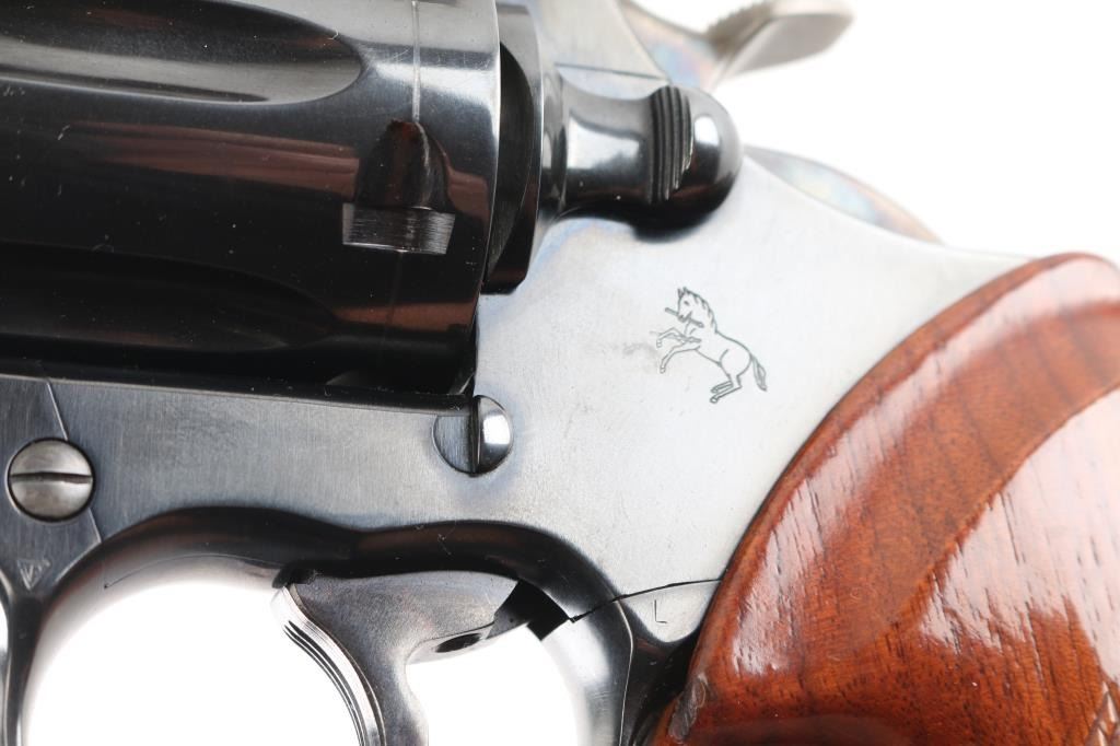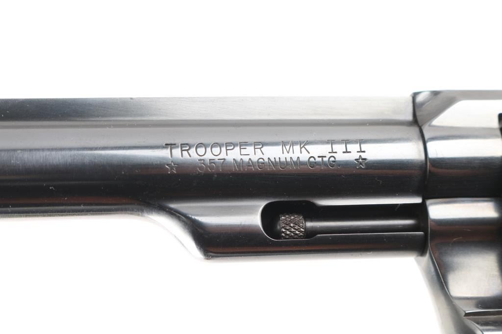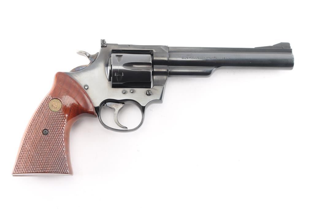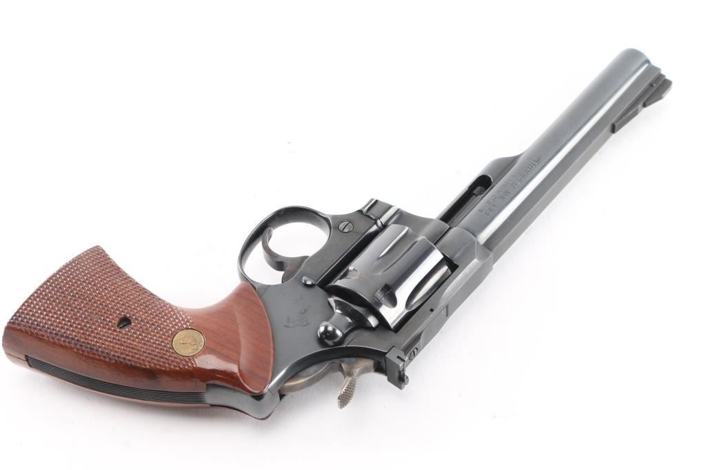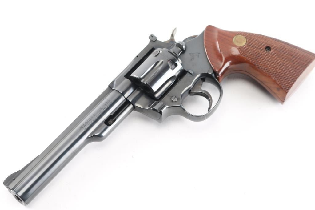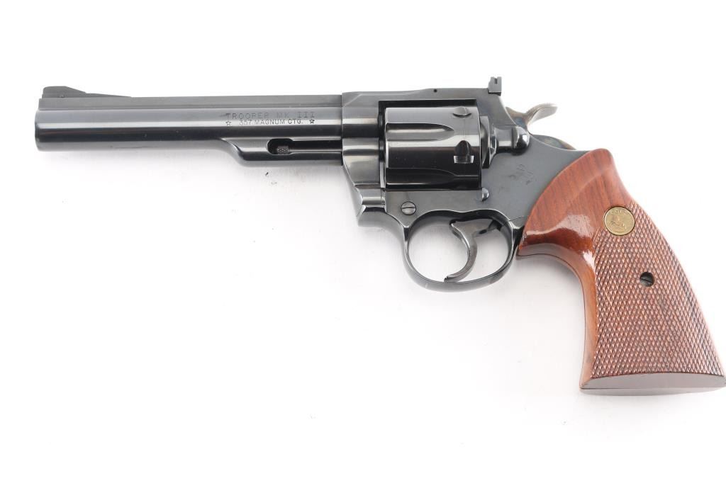 Double-action revolver chambered in .357 Magnum, circa 1965. The Trooper was designed to be the target-grade version of the MK III series. Features a blued finish, 6" barrel with solid top rib, raised & pinned serrated ramp front sight, pinned adjustable square notch rear sight, fluted six-shot cylinder, case hardened serrated trigger, transfer bar safety, case hardened knurled hammer spur and checkered wood target grips with Colt medallions. Bore is bright with strong rifling. Retains approx. 98% finish with little to no losses. Action is smooth with tight lockup and grips are excellent. NRA condition is excellent.***C&R Firearm***
