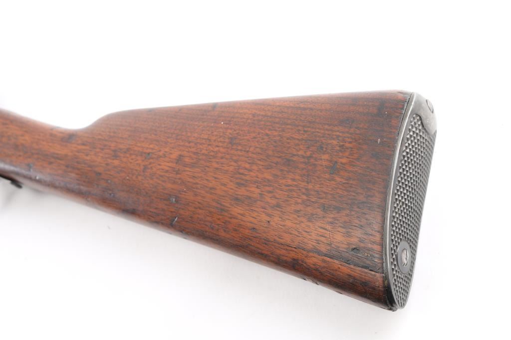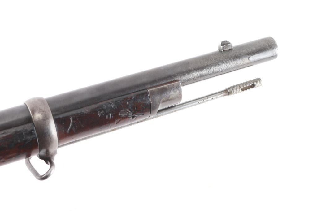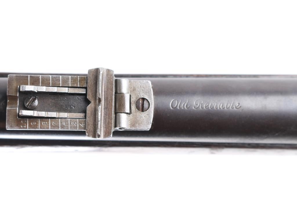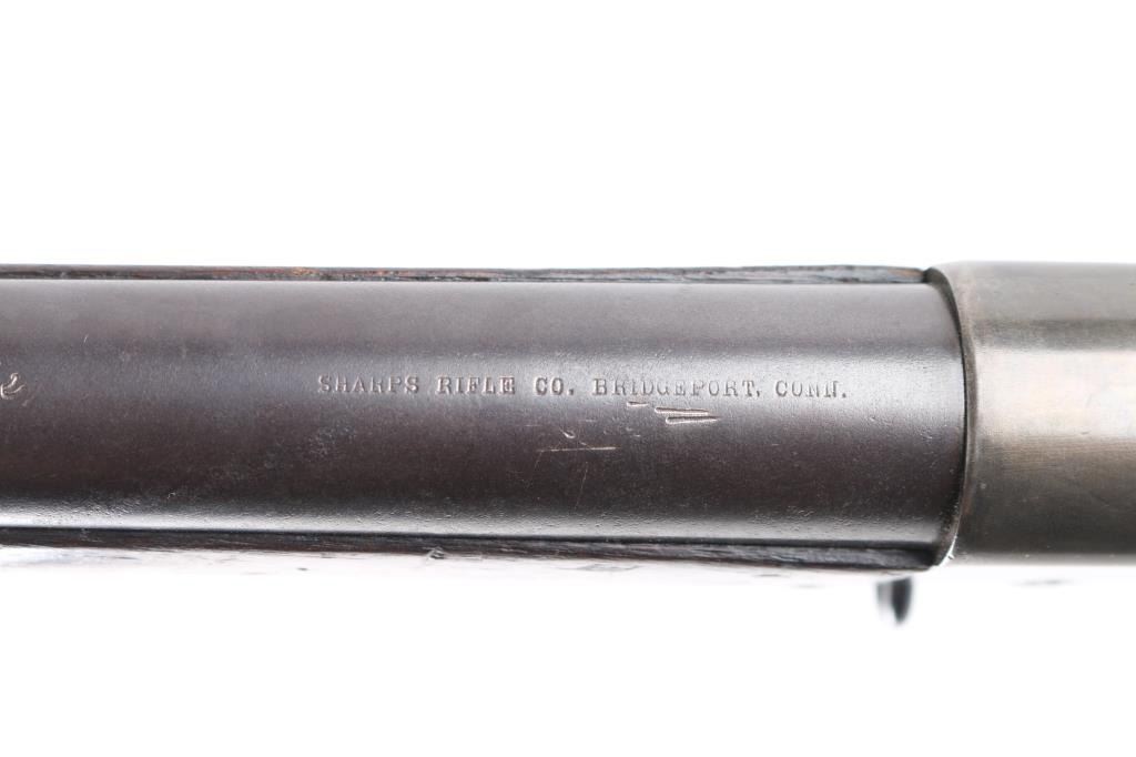 Falling block internal hammer breech loading military rifle in .45-70 caliber by Sharps Rifle Manufacturing. Features a 32" blued barrel, low profile blade front sight , military style long range adjustable rear sight, sliding safety trigger lock that engages automatically when the action is opened, two barrel bands, sling swivels, cleaning rod, metal butt plate, full stock. The Military version was purchased by state militias in Michigan, North Carolina, and Massachusetts. The left of the receiver is marked "SHARPS RIFLE CO. BRIDGEPORT, CONN. / U.S.A.”. Serial number and "Pat. Dec. 1876". The top of the barrel is marked “Old Reliable” and “SHARPS RIFLE CO. BRIDGEPORT, CONN. The right wrist is stamped "21" indicating this rifle was more than likely used by one of the state militias . Bore is overall very good/bright, good rifling, there is a patch of light pitting, falling block action is smooth with tight lock-up, wood is good/sound with many minor dings, small dents, the blue finish is about 60%, has dulled, handling wear/loss mostly on the receiver. Produced 1878-1881. About 6900 of the Military version were produced making this rifle somewhat rare. Marking are sharp/readable.NRA Condition-Fine as Antique Firearm