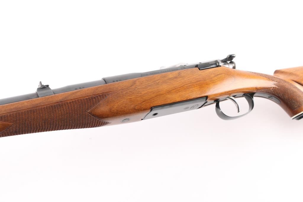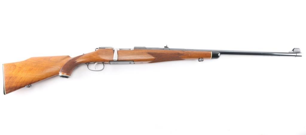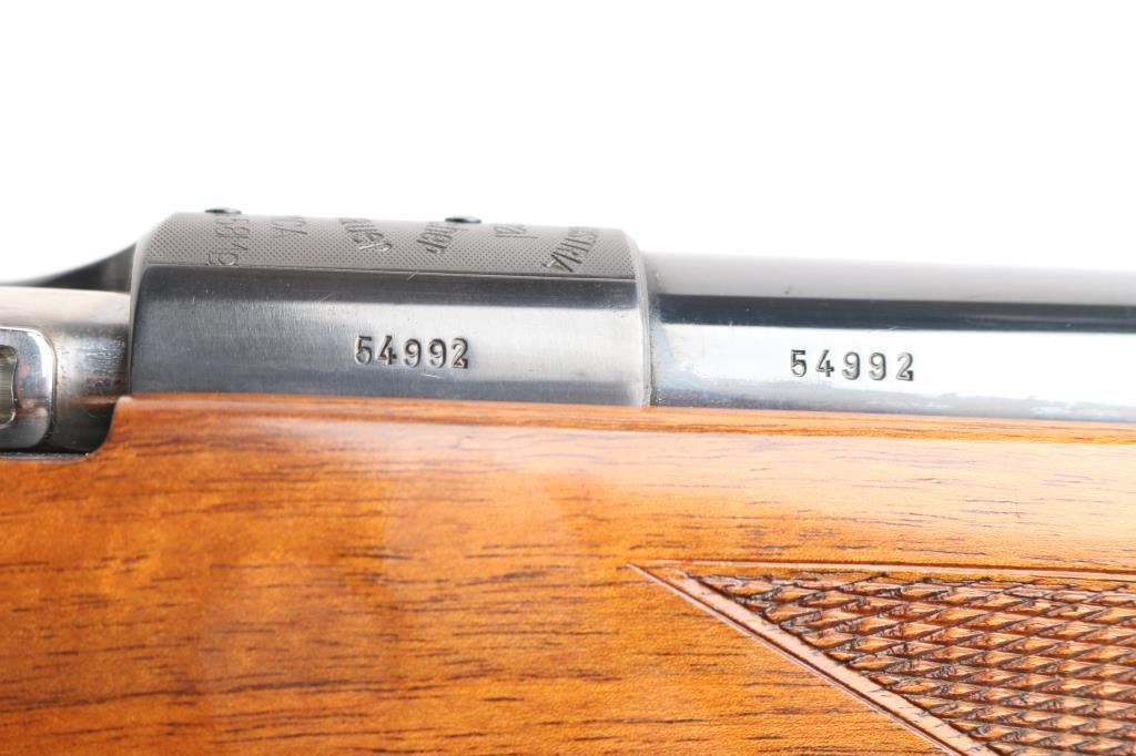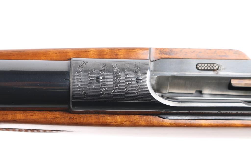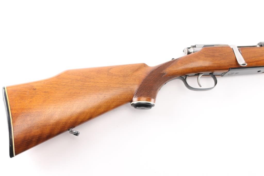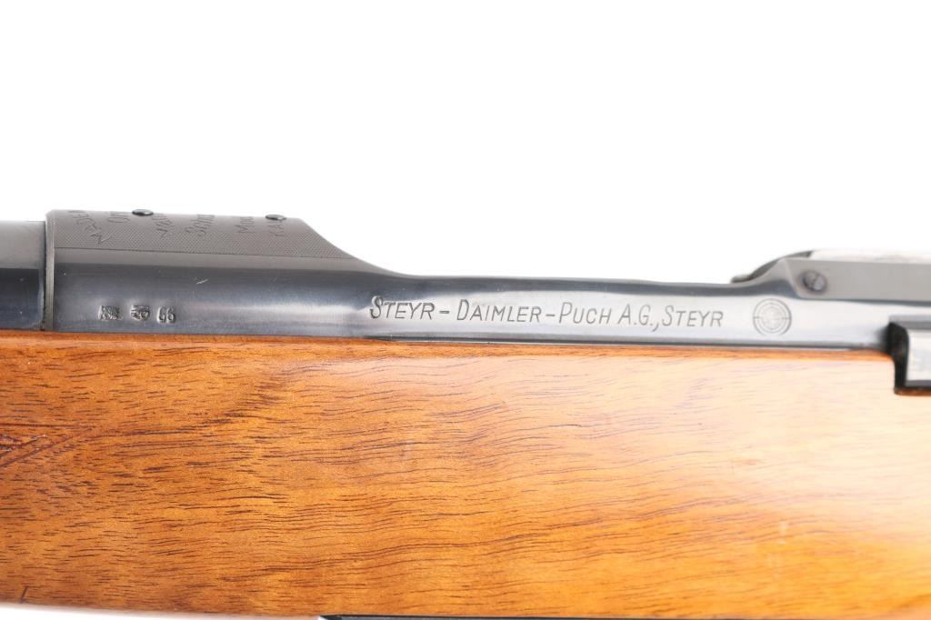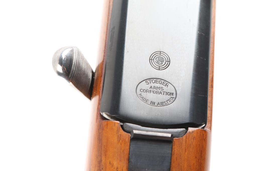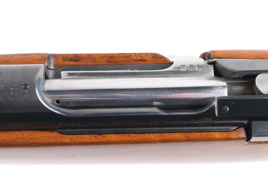 SN: 54992 Very scarce bolt action sporting rifle chambered in .458 Winchester Magnum. Manufactured in Austria by Steyr-Daimler-Puch A.G. circa 1966 and imported by Stoeger Arms Corp with import stamp on the bottom of the magazine. It is reported that Steyr manufactured 80 rifles but the factory has no record of total models. Features a high polish blued finish, 26" barrel, ramped & hooded brass bead top blade front sight, two leaf rear sight with one fixed & one folding marked “300”, smooth curved trigger, polished bolt with butter knife handle, two-position flag safety on the rear of the bolt, sliding tang safety, removable rotary magazine, and point checkered walnut stock with black forend tip & grip cap, right handed beaded Monte Carlo cheekpiece, sling swivels, factory black synthetic buttplate & 14 1/4” LOP. The receiver is drilled & tapped on the ring and left side of the “bridge”. Matching serial numbers are found on the receiver, barrel and bolt handle. Rifle retains approximately 97% of its original blued finish showing some minor handling marks, a couple small spots of pitting on the receiver and a small spot of surface rust on the bolt. The action is mechanically sound, the bore appears excellent and the walnut stock is near excellent with minor blemishes.Condition is NRA Good.***C&R Firearm***