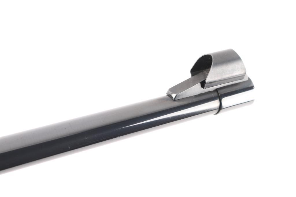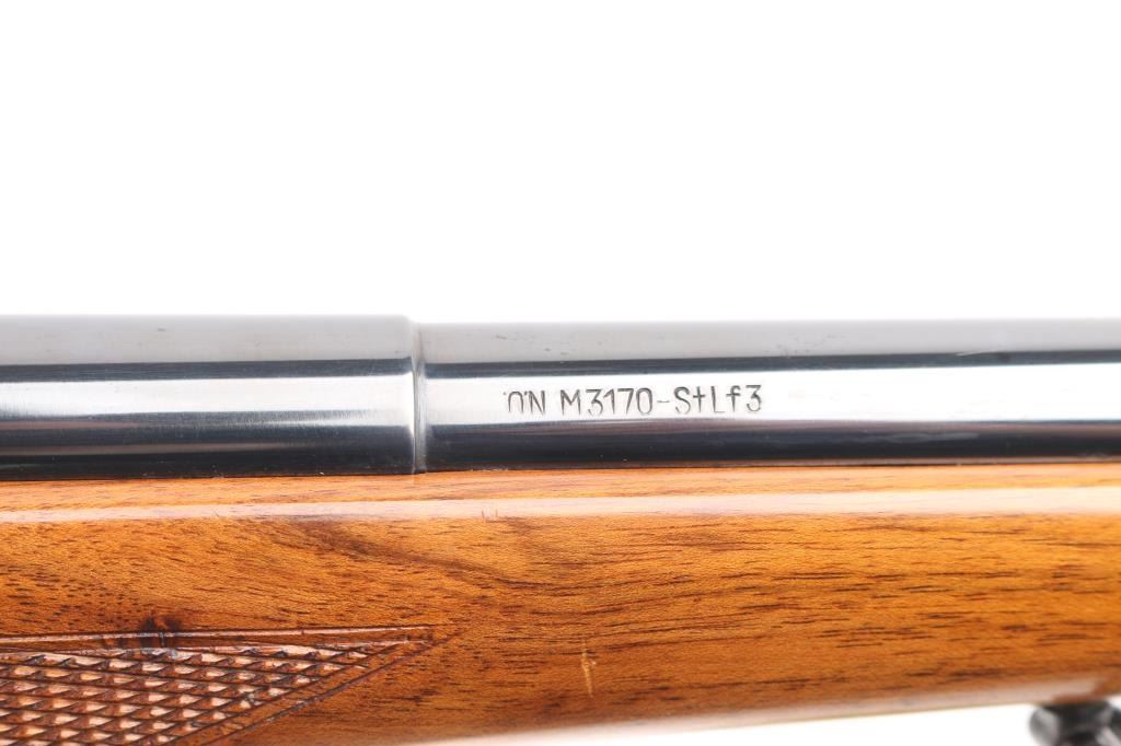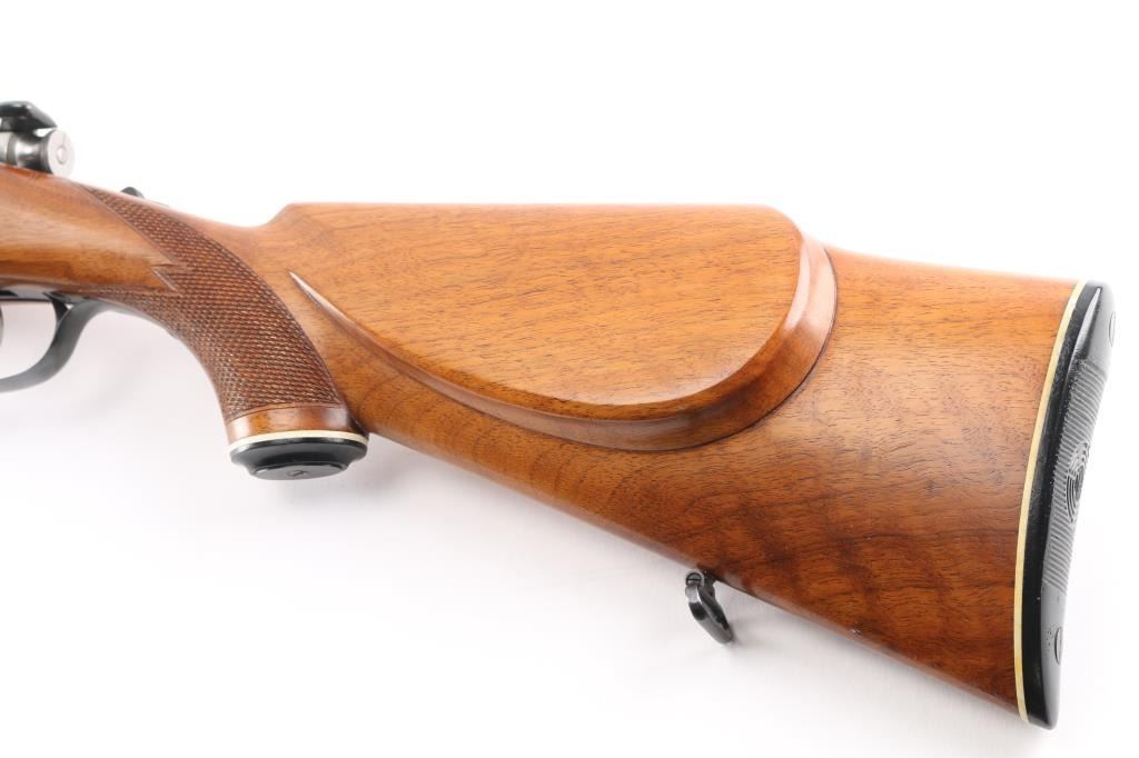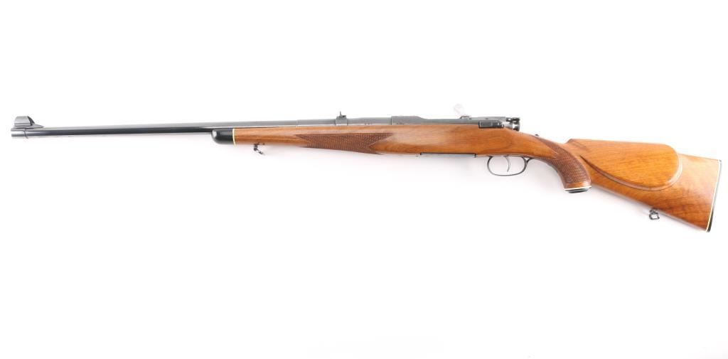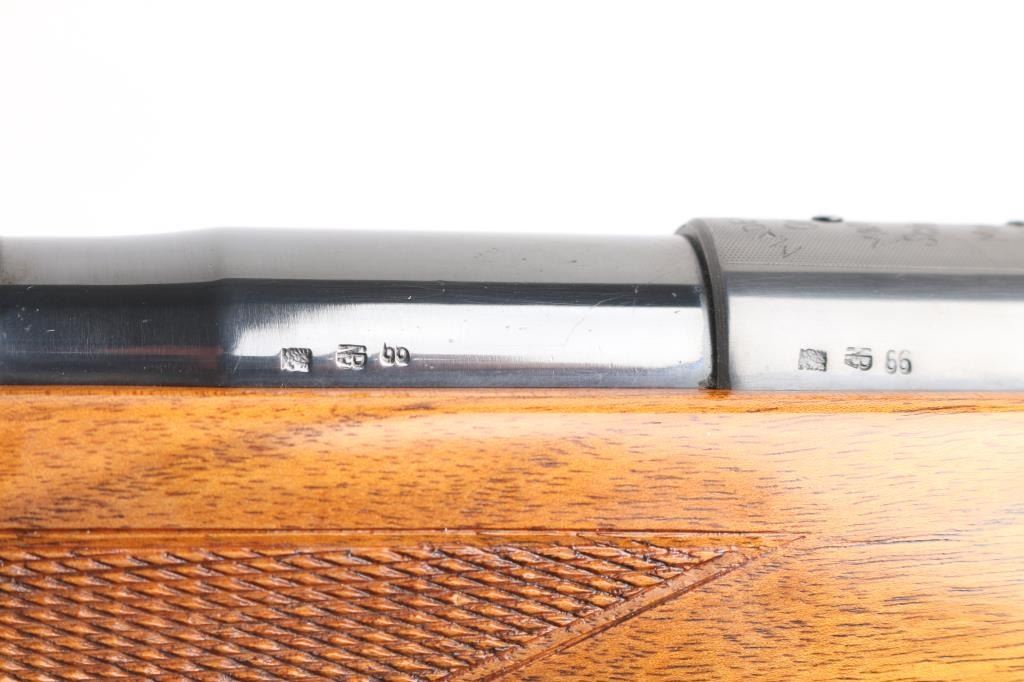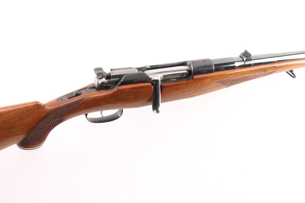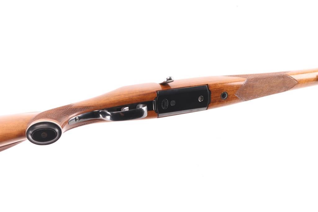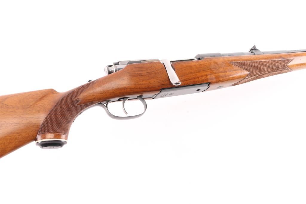 SN: 54992 Very scarce bolt action sporting rifle chambered in .458 Winchester Magnum. Manufactured in Austria by Steyr-Daimler-Puch A.G. circa 1966 and imported by Stoeger Arms Corp with import stamp on the bottom of the magazine. It is reported that Steyr manufactured 80 rifles but the factory has no record of total models. Features a high polish blued finish, 26" barrel, ramped & hooded brass bead top blade front sight, two leaf rear sight with one fixed & one folding marked “300”, smooth curved trigger, polished bolt with butter knife handle, two-position flag safety on the rear of the bolt, sliding tang safety, removable rotary magazine, and point checkered walnut stock with black forend tip & grip cap, right handed beaded Monte Carlo cheekpiece, sling swivels, factory black synthetic buttplate & 14 1/4” LOP. The receiver is drilled & tapped on the ring and left side of the “bridge”. Matching serial numbers are found on the receiver, barrel and bolt handle. Rifle retains approximately 97% of its original blued finish showing some minor handling marks, a couple small spots of pitting on the receiver and a small spot of surface rust on the bolt. The action is mechanically sound, the bore appears excellent and the walnut stock is near excellent with minor blemishes.Condition is NRA Good.***C&R Firearm***