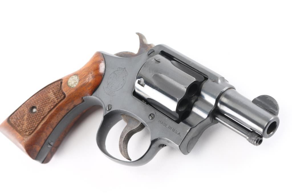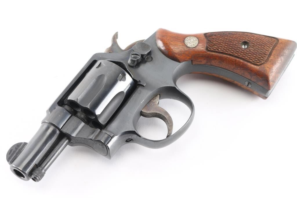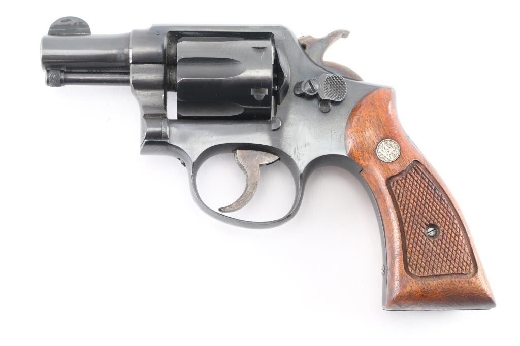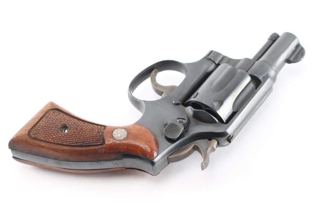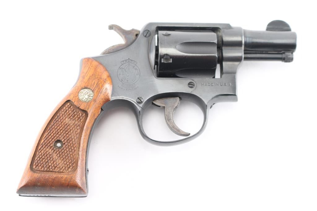 Modified US Military revolver manufactured for Lend-Lease to Commonwealth Forces in WWII Early issue with no V prefix. Features a shortened 2 1/4" barrel, half moon front sight has been relocated, swing out 6 shot cylinder, single/double action, lanyard ring has been removed with evidence of the screw hole that has been filled in. Revolver has been scrubbed of most wartime marking with a shallow area on the left frame below the cylinder, there is a feint BNP on the front upper left frame Birmingham Nitro Proof and is one of the markings required to be placed on all firearms before commercial sale here. "V" is stamped on the rear of cylinder and rear of cylinder, a feint "JH is stamped on the heel and the grip frame under the right grip, Wartime "Victory Model" based on five screw K frame Military & Police. Bore is excellent condition, bright with crisp rifling. Cylinder charge holes are bright and smooth. Metal finish is old reblue 90% coverage with some scratches/scuffs. Trigger and hammer retain dull case color. Grips are checked with S&W medallions. Action is smooth with tight lock up. Markings include the standard S&W trademark, feint, and "Made in the U.S.A. Serial numbers on cylinder & barrel match frame. There are some British firms that refurbished these revolvers for resale in the U.S.NRA Condition-Very Good as Refurbished. C&R Firearm.