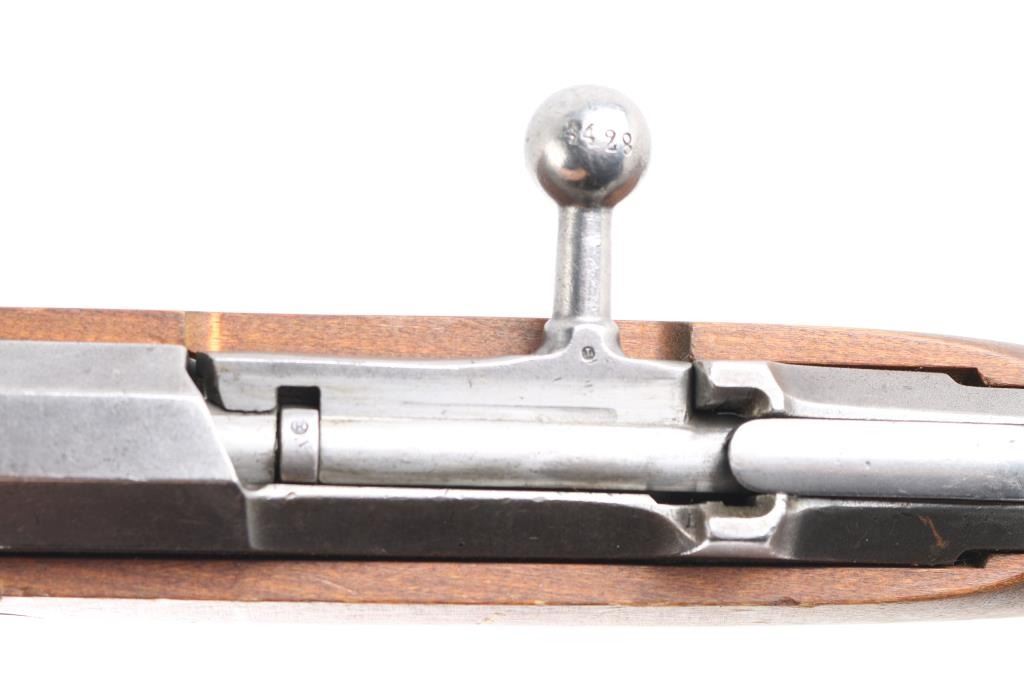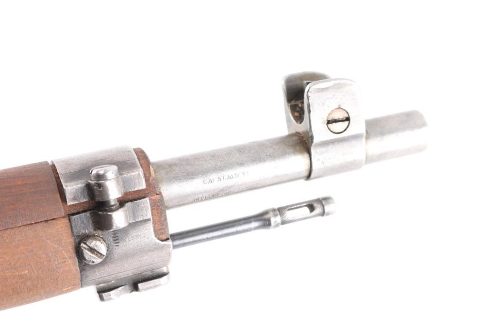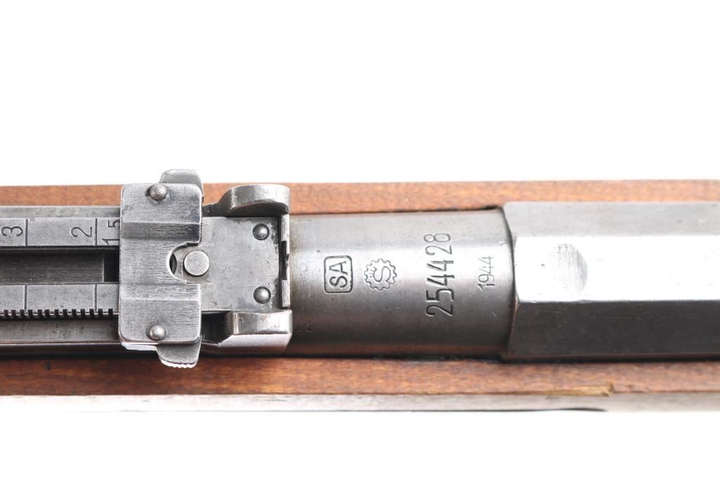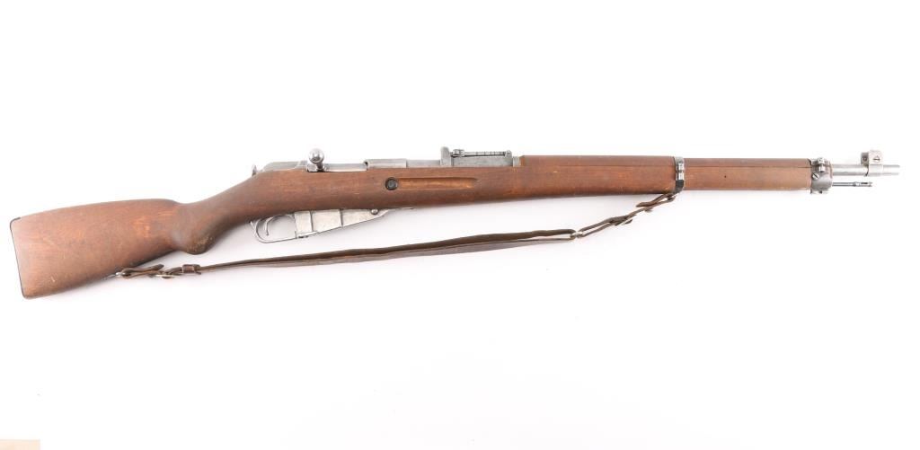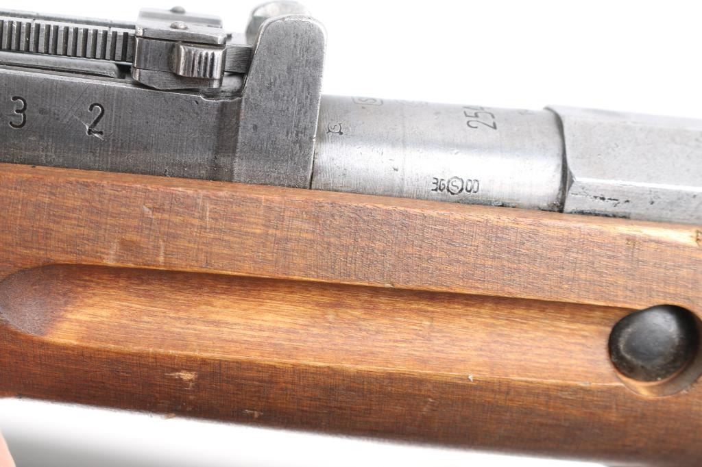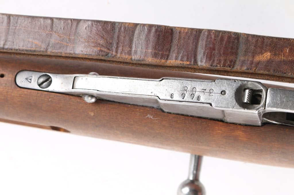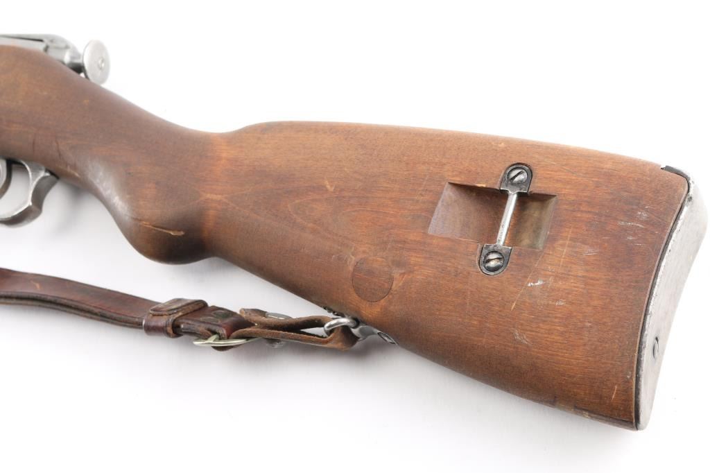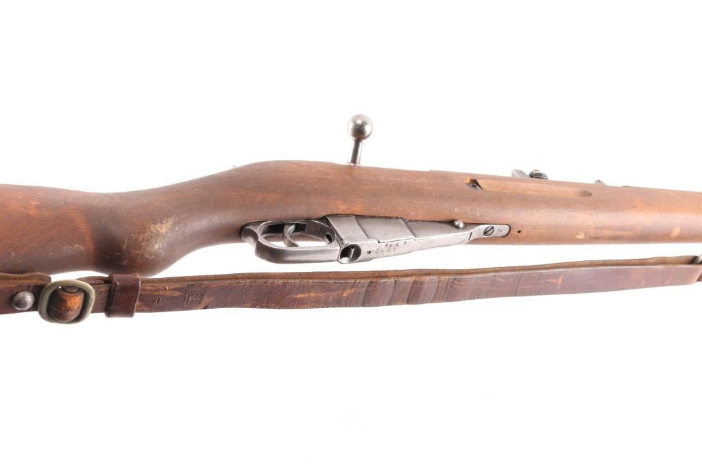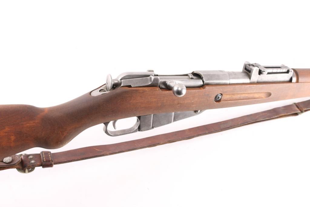 WW2 Finnish military bolt action rifle imported by century Arms Inc. (Left Barrel) Features 27" barrel, bayonet lug, blade front sight with protector ears, tangent rear sight, hex receiver, cleaning rod under barrel, sling swivels, straight bolt handle, semi pistol grip wood stock & matching wood handguard. Bore is fair to good, strong rifling, dark frosting in the grooves. Metal finish is in the white with minor scratches & other handling marks. Bolt is polished, clean. Stock is very good, few light scratches. Markings include "S" inside Gear logo, "SA" stamp. Russian Izhevsk factory, arrow in triangle stamped on bottom metal. Serial numbers mismatched. Includes original brown leather Finnish army sling stamped "SA" in square.Condition is NRA Good to Very Good. C&R Firearm.