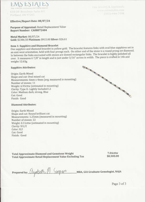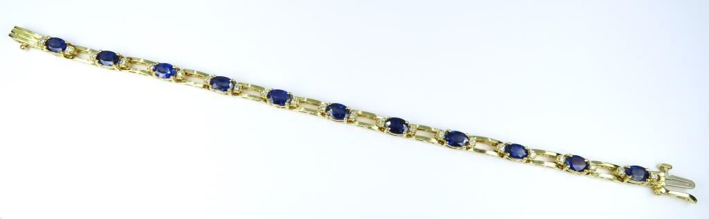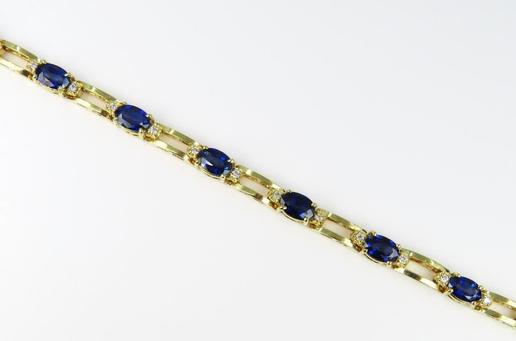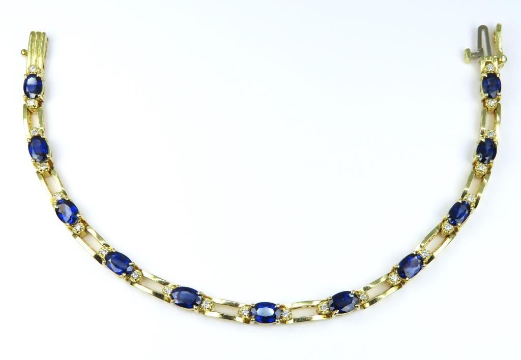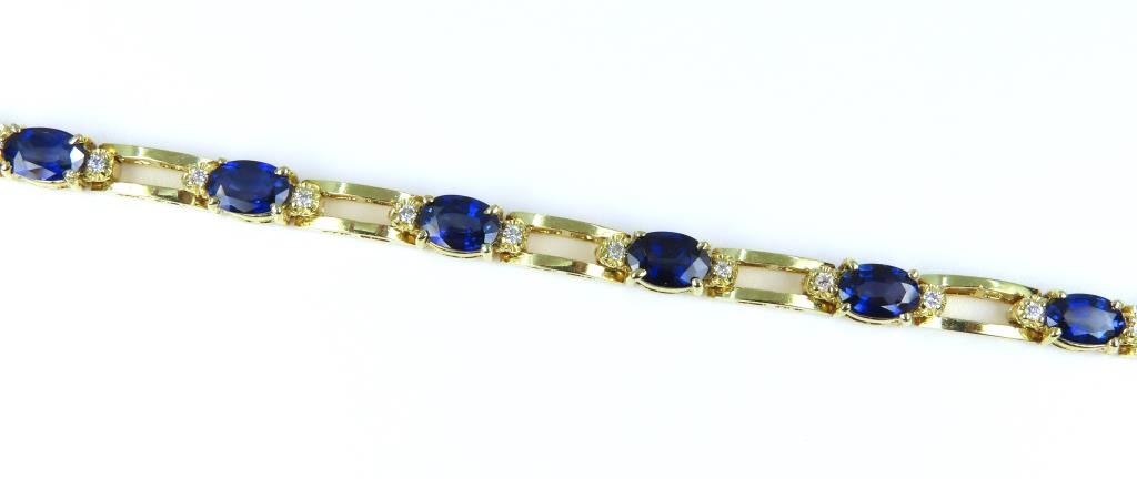 Bracelet featuring 11 fine oval cut, vivid Blue Sapphires weighing approx. 6.93 carats, accented with 22 round cut Diamonds set in 14 karat yellow gold. Full Retail Appraisal - $8,500.00.
