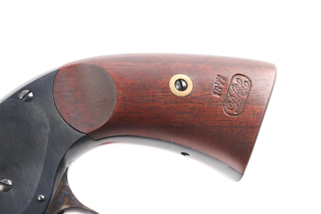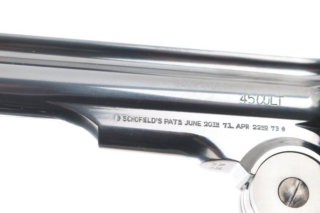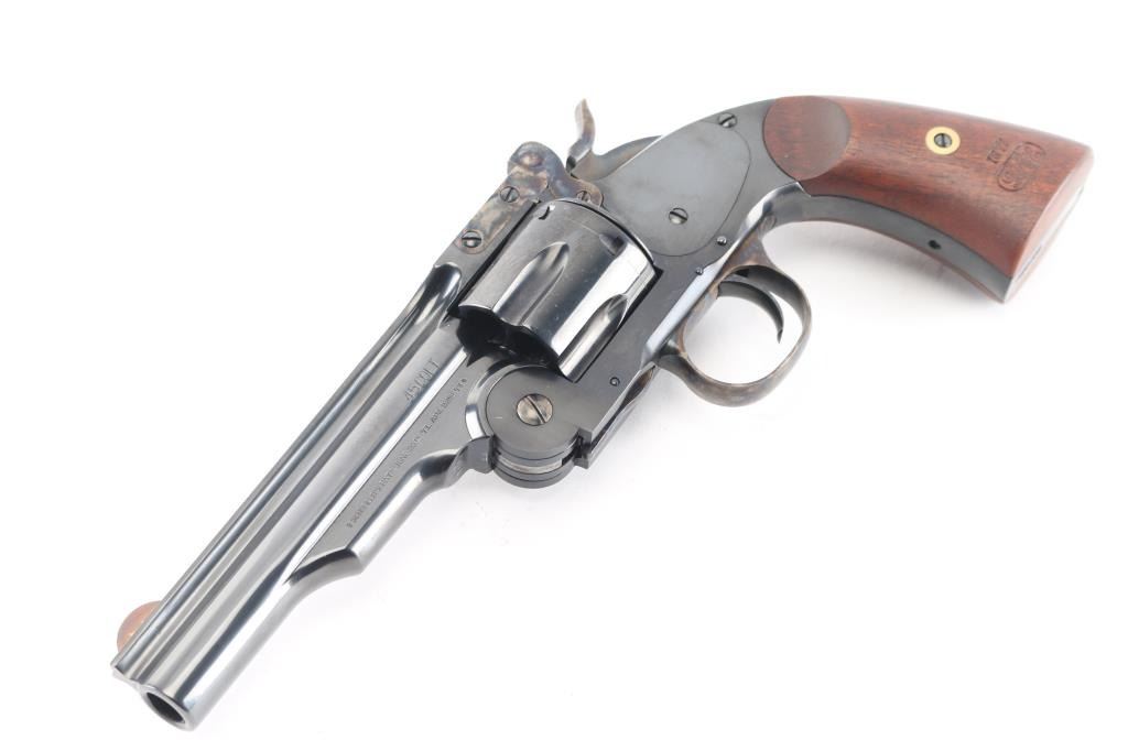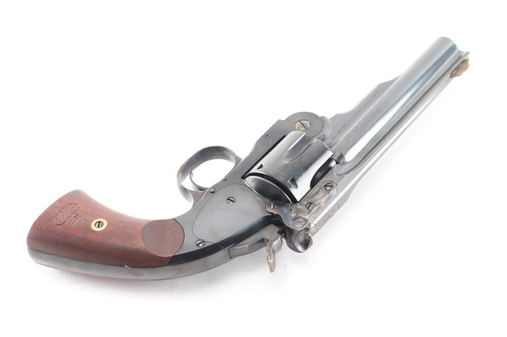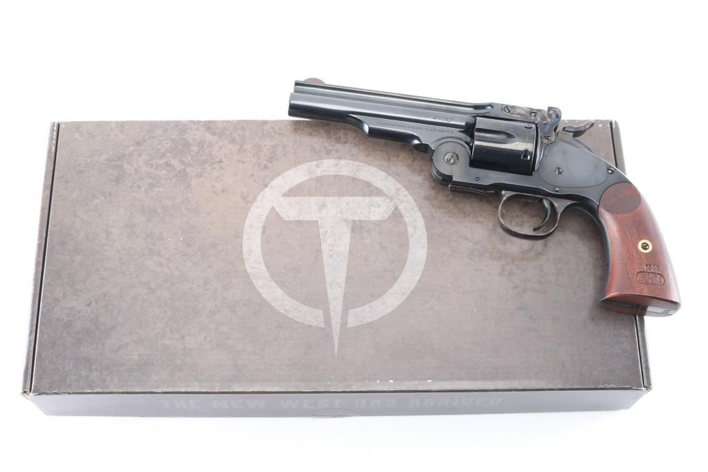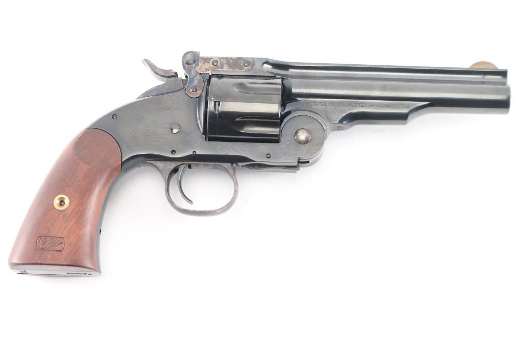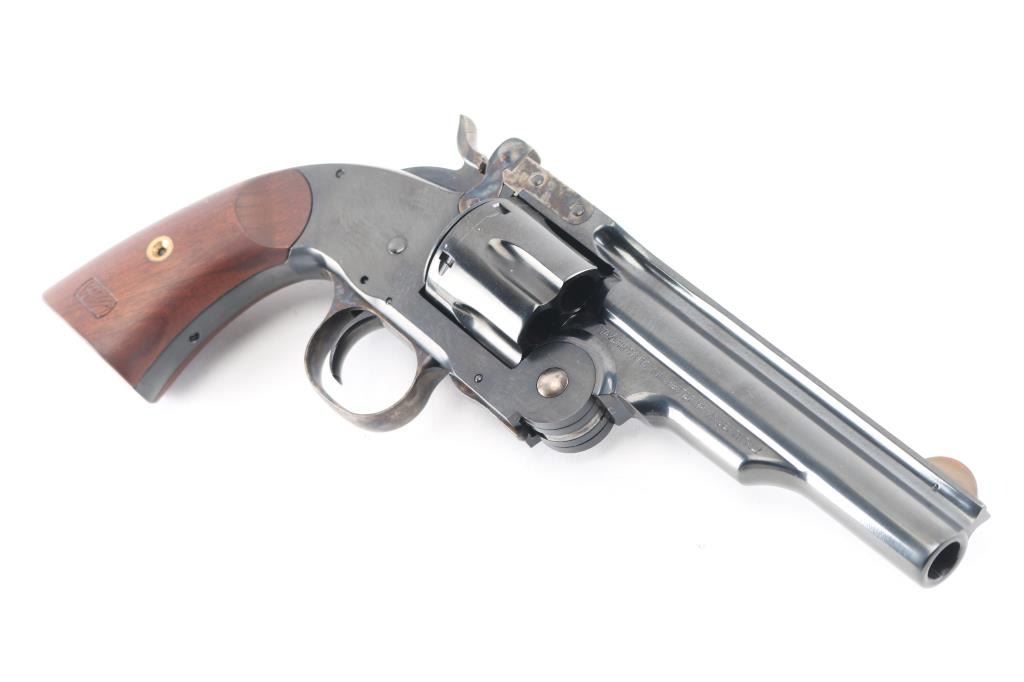 High quality reproduction of the Smith & Wesson No. 3 Schofield 2nd Model top-break single action revolver, chambered in 45 Colt. Manufactured in Italy and imported by Taylors & Co. Winchester VA. with import stamp on the left side of the barrel. Features a bright blue finish with case colored accents on trigger & guard, hammer, latch, solid ribbed 5" barrel, round blade front sight, ‘v’ notch rear sight cut in the barrel latch, smooth trigger, knurled hammer spur, fluted six-shot cylinder with automatic ejector, ejector override latch under hinge, frame with “U.S.” marked on the butt, and two-piece smooth walnut grips with 1877 dated replica US inspector markings. Bore and charge holes are excellent. Retains 98% finish with minor track line on the cylinder. Grips are excellent. Action is smooth with tight lock-up. Comes in factory box with matching label and manual.Condition is NRA Excellent. Modern Firearm.