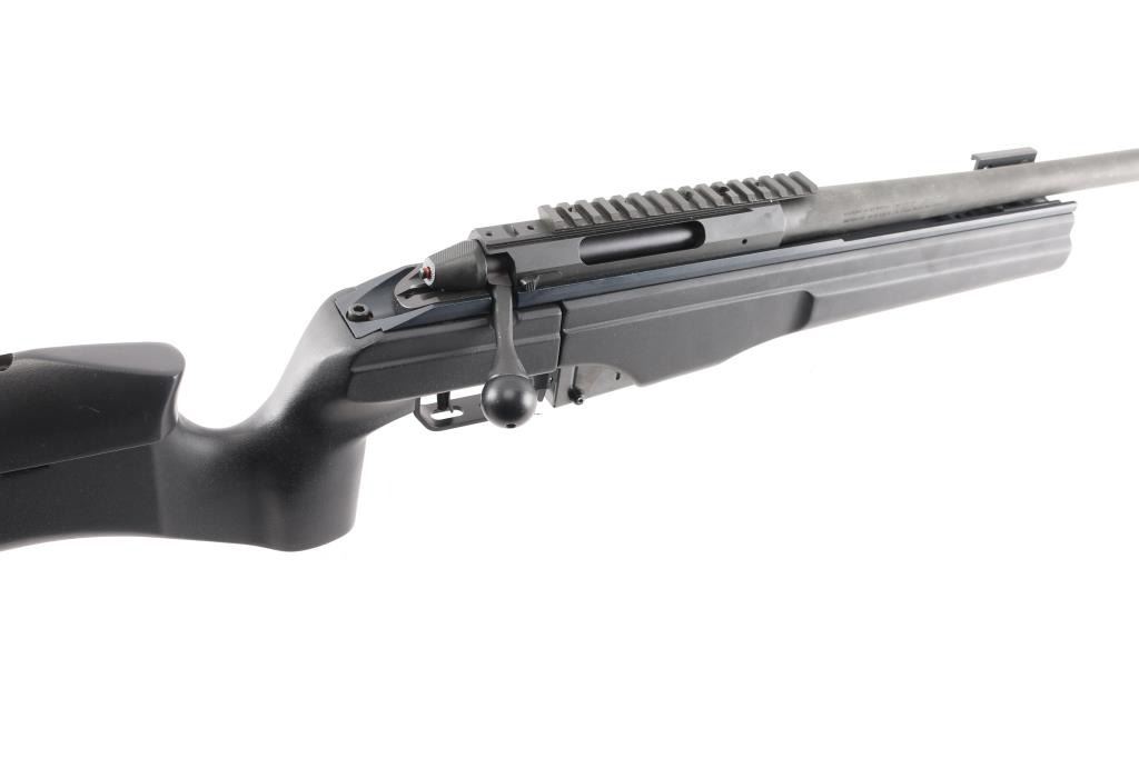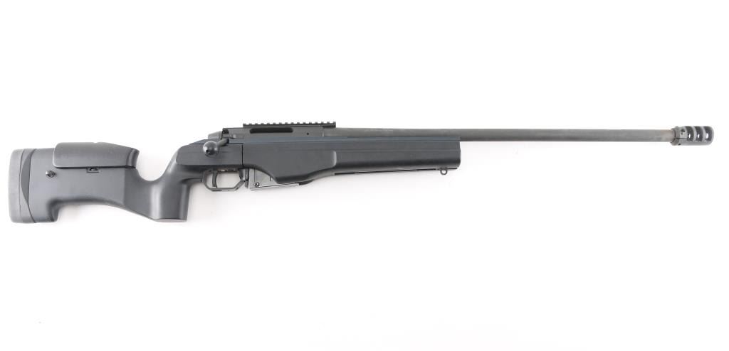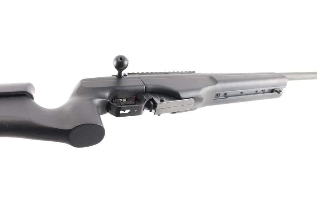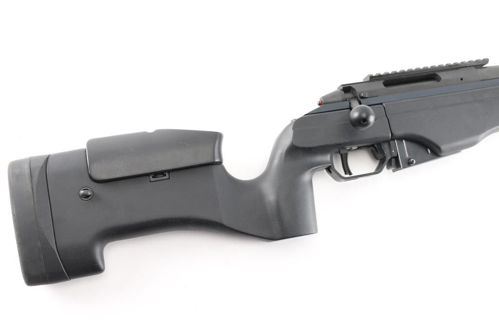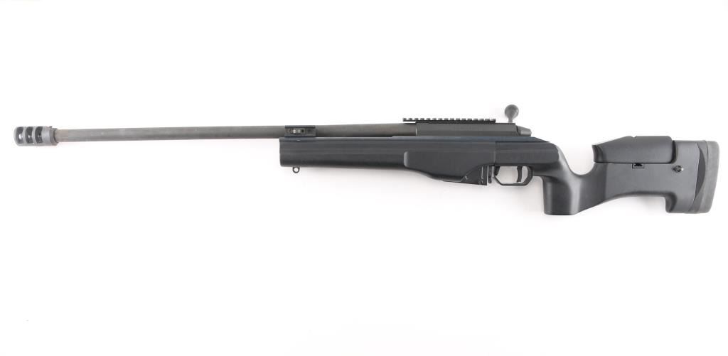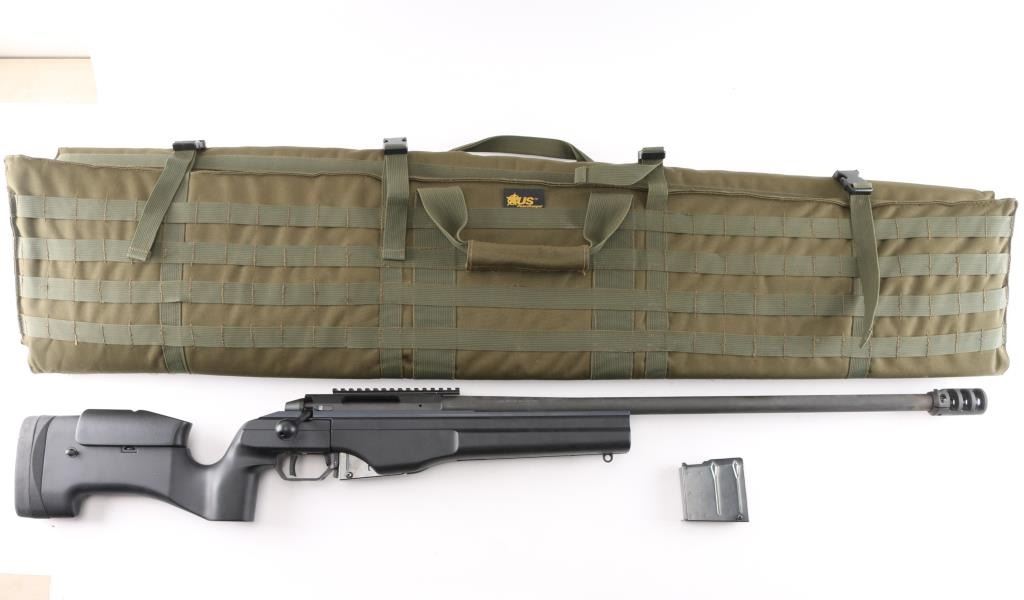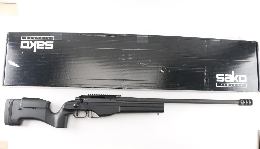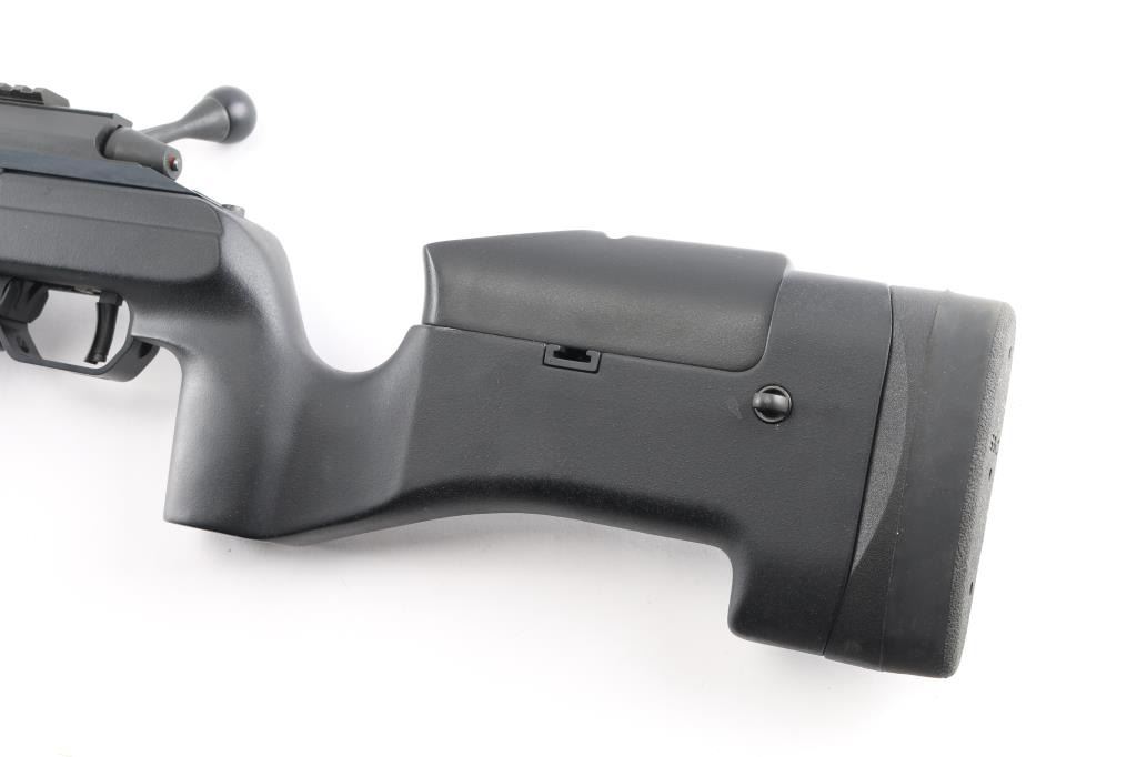 Modern styled precision tactical bolt action rifle made in Finland, imported by Beretta USA, Accokeek MD. Optics ready. Features dark gray parkerized finish, black colored composite chassis type stock, accepts detachable magazines, trigger offers three adjustments–trigger shoe angle, plus first-stage and second-stage pull weights, 26" free floated heavy barrel, 28" including muzzle brake, manual safety in triggerguard, Picatinny rail on receiver. Stock features pistol grip shaped wrist, adjustable comb, adjustable length of pull, hand stop rail under forend, off hand grasping area under butt, studs for sling mounting. Cocking indicator, bolt release on right receiver Bore is excellent condition. Overall condition is like new with handling marks. Includes factory box with matching label, manual and one 5 rd magazine. Also included is a new condition US Peacekeeper Drag Mat Tactical Rifle Combination Case 48"Condition is NRA Excellent. Modern Firearm.