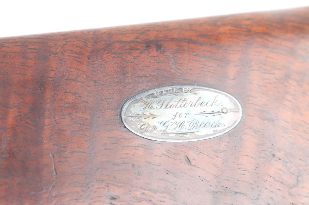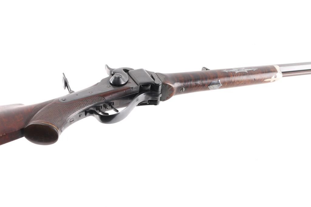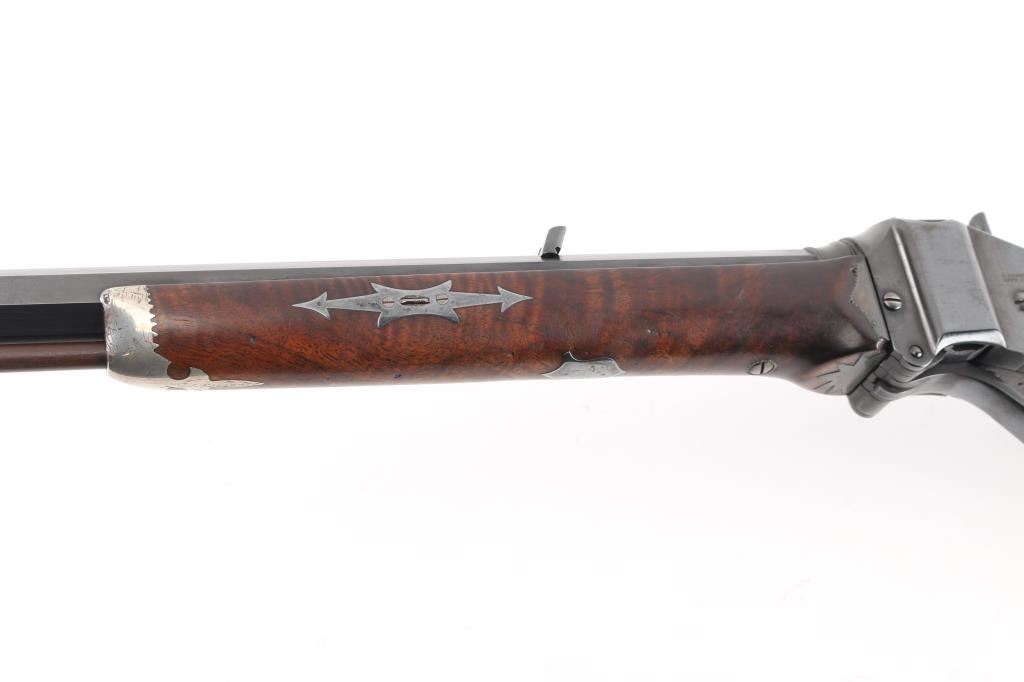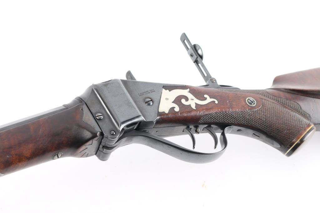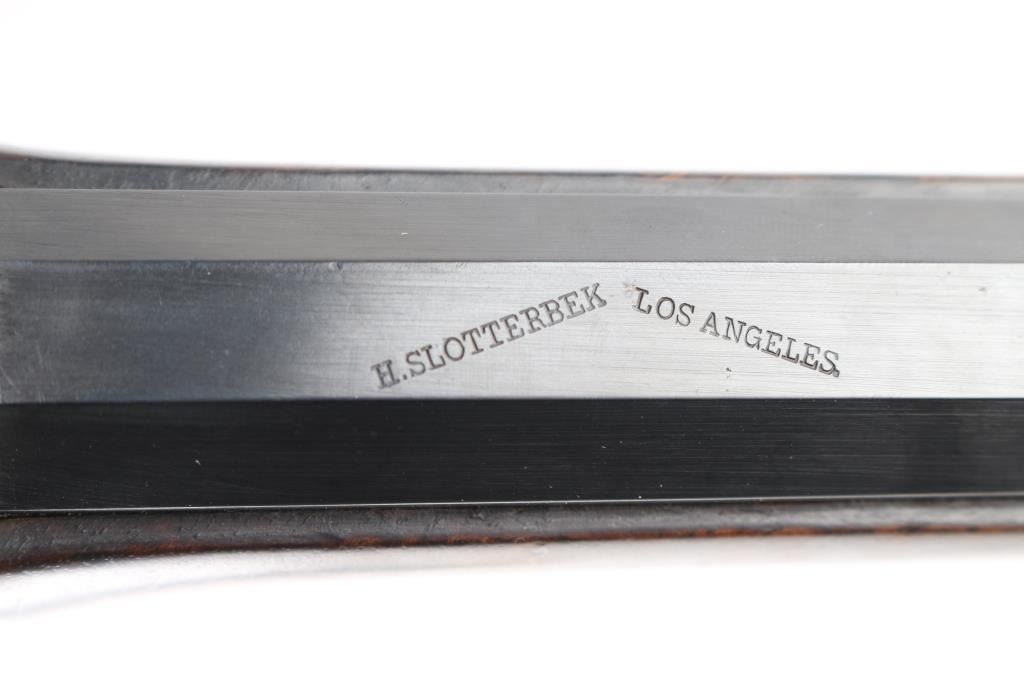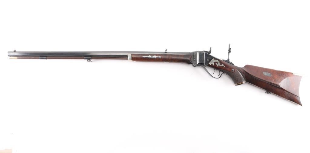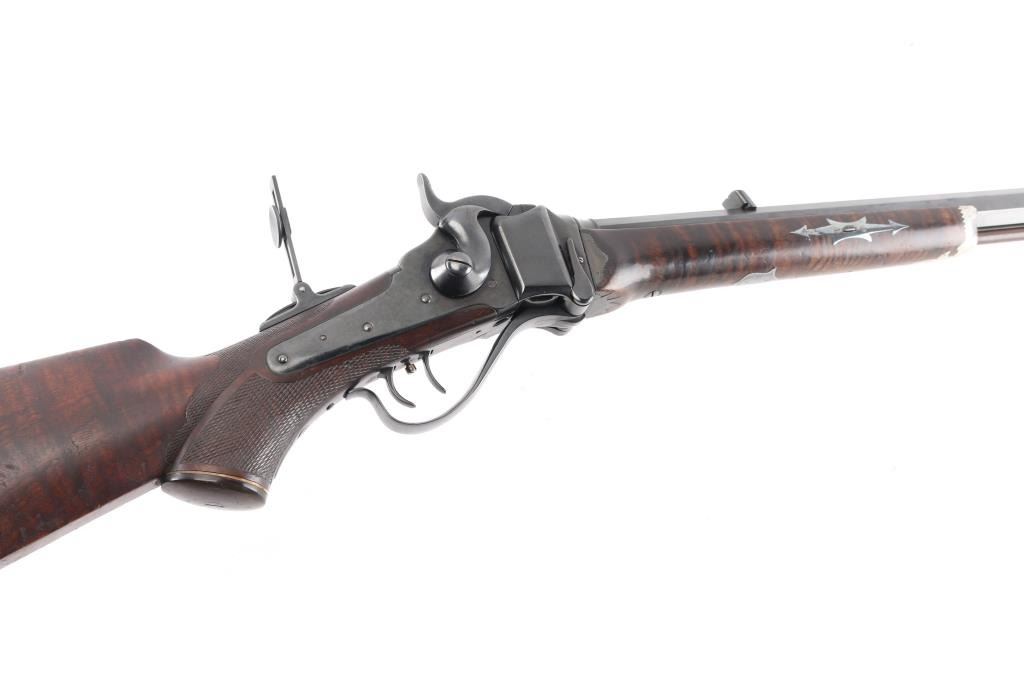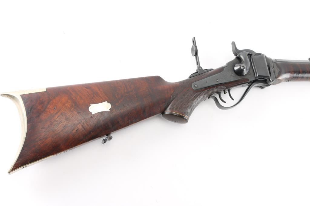 Serial number "C,510X0" (X is an original number obliterated by a screw) marked on top of the tang underneath the peep sight. Henry Slotterbek was a gunmaker, specifically known for his work in Los Angeles, and he is listed in Larry Sheldons book on California Gunsmiths 1846-1900. He was known for crafting heavy octagon barrel Sharps action sporting/buffalo rifles, with a rifle marked "H. Slotterbeck, Los Angeles" being a notable example. Henry was killed in 1888 when he was at the range while standing in front of a rifle while adjusting the front sight. This is a Rare and Desirable Sharps Model 1874 Sporting Rifle. This rifle is marked "H. SLOTTERBEK LOS ANGELES/CAL." on top of the barrel flat behind the rear sight. Henry Slotterbek moved from Philadelphia to Los Angeles in 1869 and worked there until his death. As this rifle shows, he was a fine craftsman. Most of the Slotterbek guns were shipped to A. J. Plate of San Francisco since Slotterbek was there regularly to visit his brother Charles. The barrel, ramrod, ramrod pipes, sling swivels, blade front sight, and double set triggers were all made by Slotterbek. The 29 3/4" octagonal barrel is rifled with six grooves. The blade/white bead on the front sight is mounted in a dovetail base with a V notch rear sight fixed on the barrel and a tang mounted mid-range vernier peep sight. The forearm is 10" long including the fancy pewter tip. It is held in place by the standard screw at the rear that has decorative German silverescutcheonss on the sides, as well as a German silver shield inlay on the underside. The fancy checkered pistol grip stock has a raised Pennsylvania style cheekpiece on the left side with inlayed German silver plaque reading " Made by H. Slotterbek for Dr. G.H. Beach" in four lines, and fancy escutcheon on the left wrist, mother of pearl inlay on the right buttstock. sling swivel, wooden ramrod with brass tip, bone grip cap with white spacer, dark striped maple stocks, crescent steel buttplate that has been dovetailed at the bottom. The bore is excellent/bright, falling block action is smooth, the wood is overall very good with some minor dents/scratches, the metal finish is an old reblue about 98% with some very light scattered pitting under it. Markings are crisp/clear. Worthy of further research. NRA Condition-Good/Reblue. Antique Firearm.