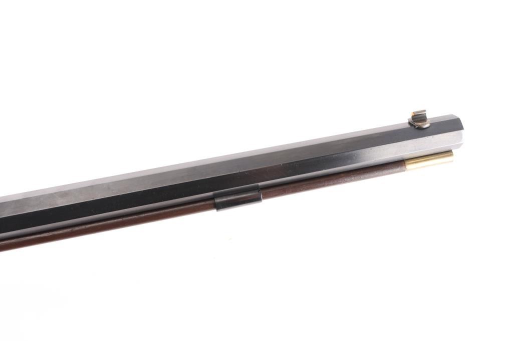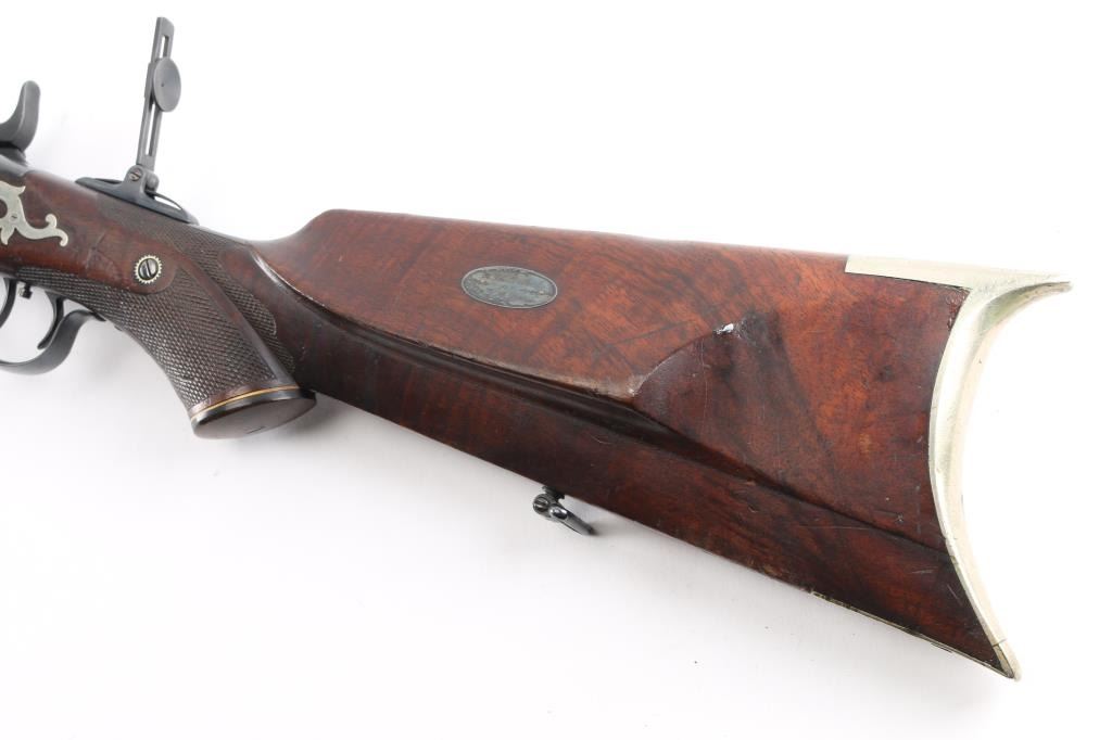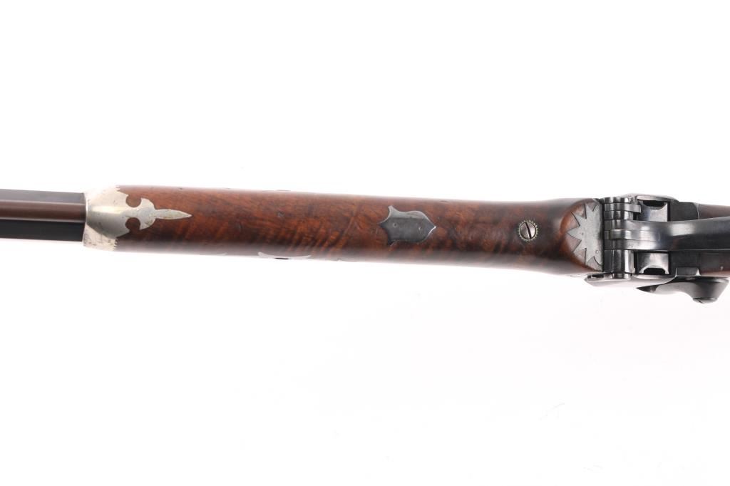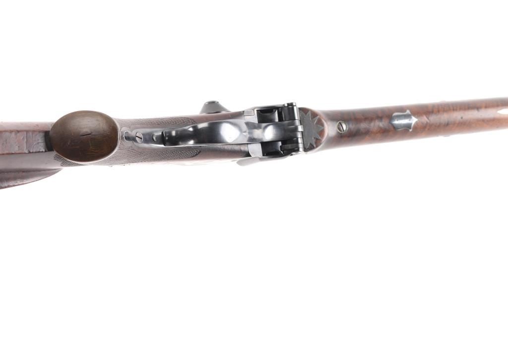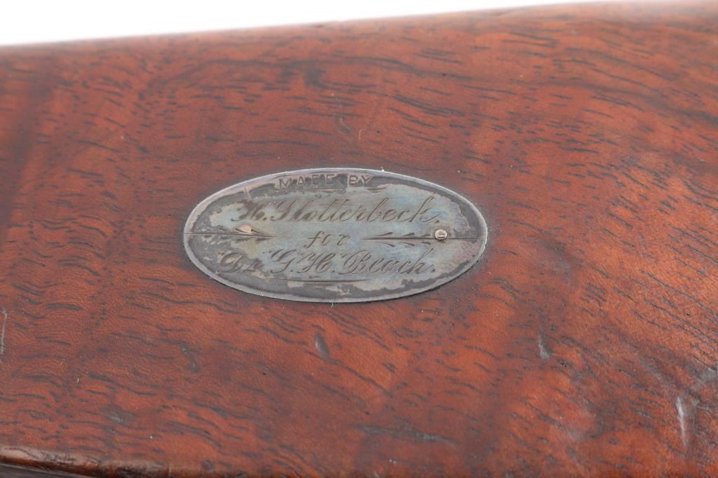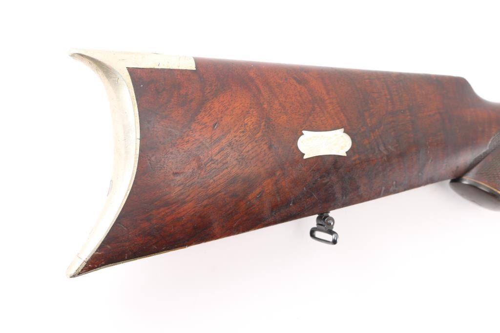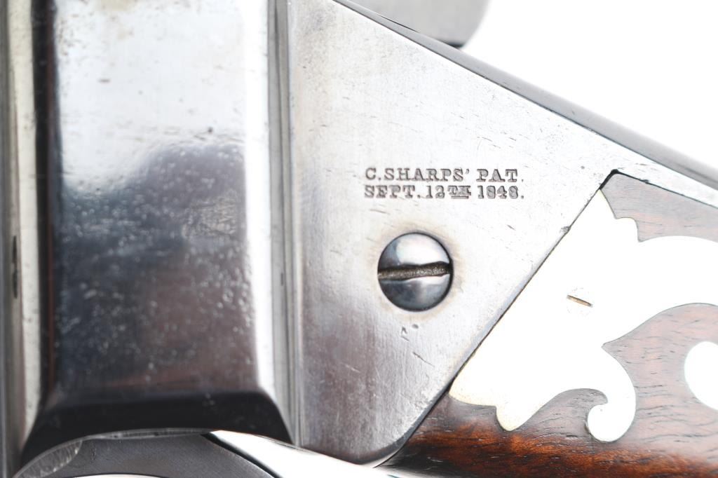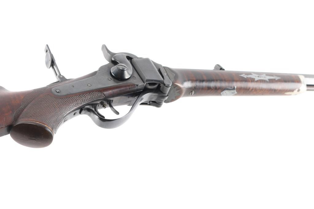 Serial number "C,510X0" (X is an original number obliterated by a screw) marked on top of the tang underneath the peep sight. Henry Slotterbek was a gunmaker, specifically known for his work in Los Angeles, and he is listed in Larry Sheldons book on California Gunsmiths 1846-1900. He was known for crafting heavy octagon barrel Sharps action sporting/buffalo rifles, with a rifle marked "H. Slotterbeck, Los Angeles" being a notable example. Henry was killed in 1888 when he was at the range while standing in front of a rifle while adjusting the front sight. This is a Rare and Desirable Sharps Model 1874 Sporting Rifle. This rifle is marked "H. SLOTTERBEK LOS ANGELES/CAL." on top of the barrel flat behind the rear sight. Henry Slotterbek moved from Philadelphia to Los Angeles in 1869 and worked there until his death. As this rifle shows, he was a fine craftsman. Most of the Slotterbek guns were shipped to A. J. Plate of San Francisco since Slotterbek was there regularly to visit his brother Charles. The barrel, ramrod, ramrod pipes, sling swivels, blade front sight, and double set triggers were all made by Slotterbek. The 29 3/4" octagonal barrel is rifled with six grooves. The blade/white bead on the front sight is mounted in a dovetail base with a V notch rear sight fixed on the barrel and a tang mounted mid-range vernier peep sight. The forearm is 10" long including the fancy pewter tip. It is held in place by the standard screw at the rear that has decorative German silverescutcheonss on the sides, as well as a German silver shield inlay on the underside. The fancy checkered pistol grip stock has a raised Pennsylvania style cheekpiece on the left side with inlayed German silver plaque reading " Made by H. Slotterbek for Dr. G.H. Beach" in four lines, and fancy escutcheon on the left wrist, mother of pearl inlay on the right buttstock. sling swivel, wooden ramrod with brass tip, bone grip cap with white spacer, dark striped maple stocks, crescent steel buttplate that has been dovetailed at the bottom. The bore is excellent/bright, falling block action is smooth, the wood is overall very good with some minor dents/scratches, the metal finish is an old reblue about 98% with some very light scattered pitting under it. Markings are crisp/clear. Worthy of further research. NRA Condition-Good/Reblue. Antique Firearm.