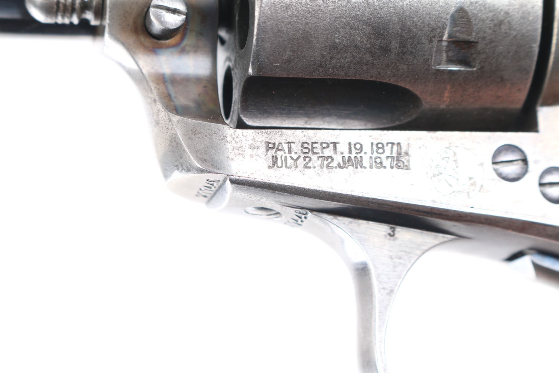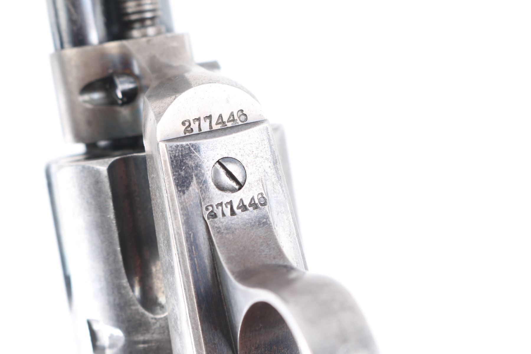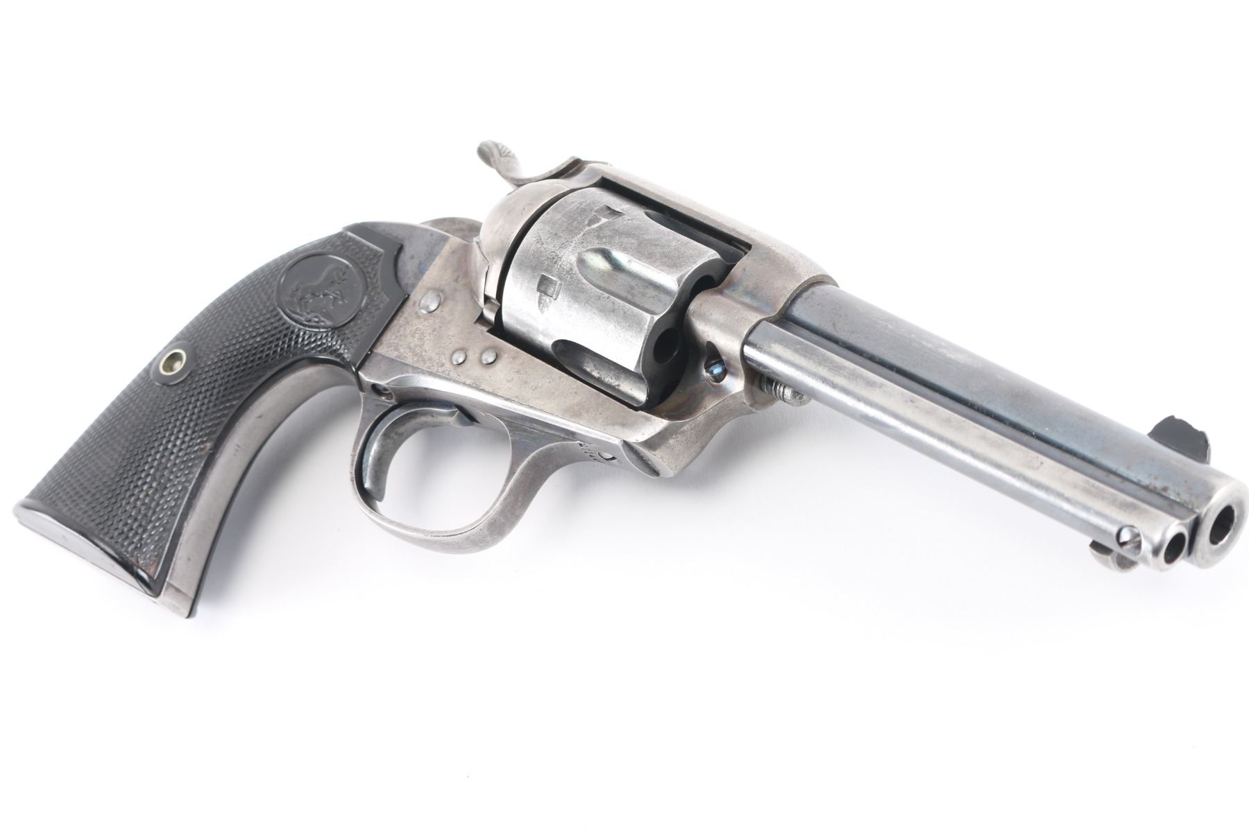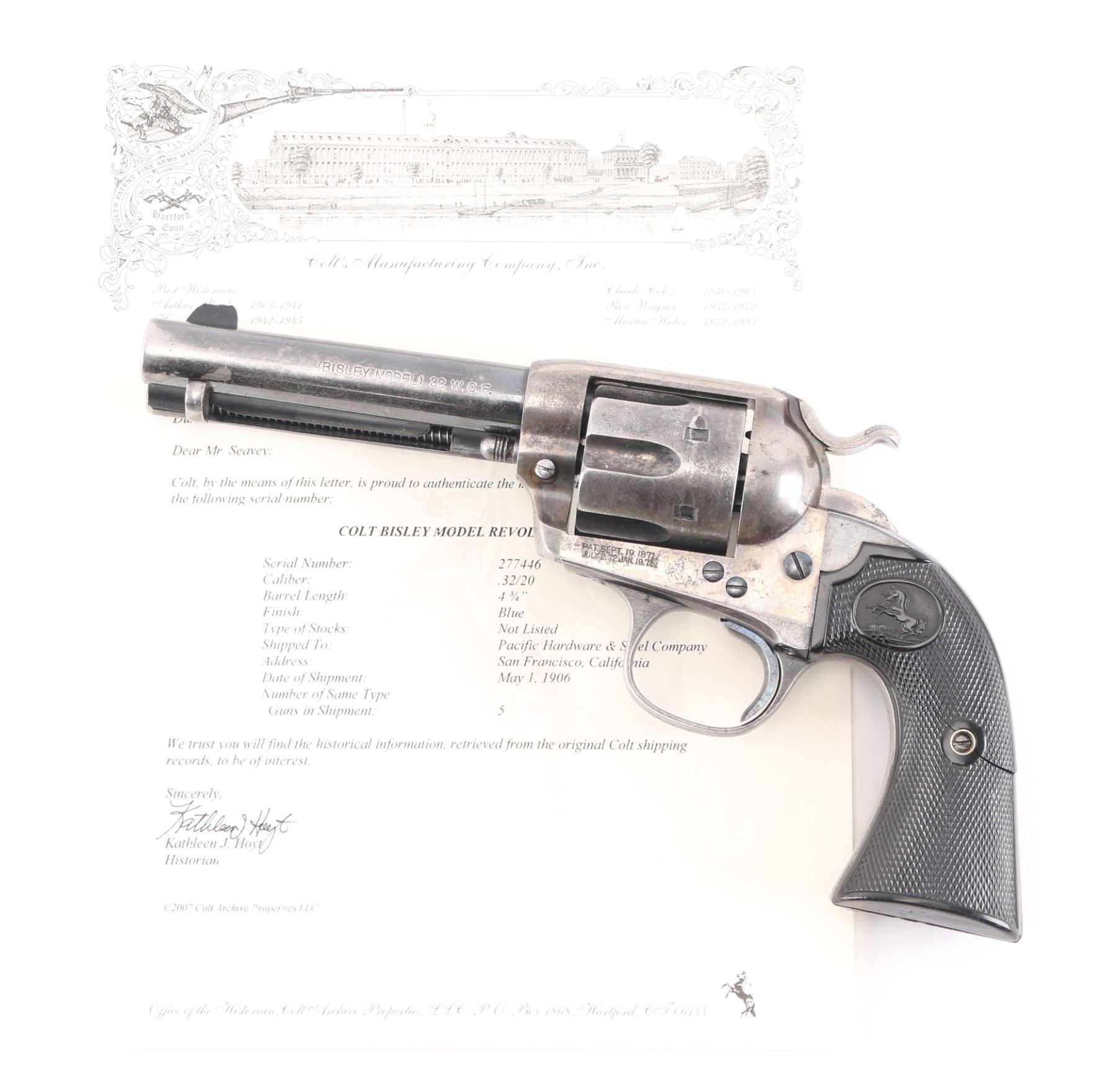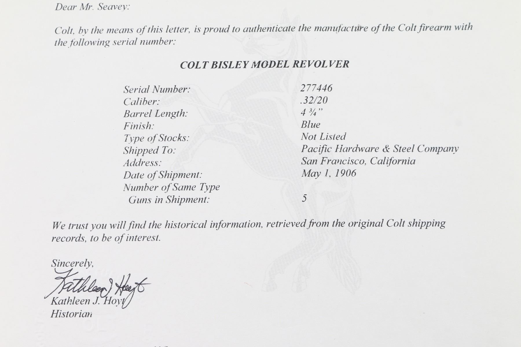 SN: 277446, Caliber 32-20. The accompanying Colt factory letter dated August 28, 2007, confirms configuration and shipment to Pacific Hardware and Steel Company, San Francisco, California, on May 1, 1906, just 12 days after the San Francisco earthquake tragedy! One of a five gun shipment. Pacific Hardware had been constructed just one year prior and was one of the few buildings to survive in the district. (It is a National landmark today) It was miraculous it was delivered at all as the earthquake and ensuing fires destroyed over 80% of the buildings with 3000 killed. In the ensuing chaos, the mayor ordered looters to be "Shot on sight". "Hardware dealers sold an estimated 200,000 pistols in one month". (Writer Lately Thomas) The Army was called in, and groups of armed citizens roamed the streets. The official count is nine looters shot dead, but some estimate up to 300. The features of this Colt are as follows: Blade front sight (damaged) and frame notch rear sight. Two line block letter address on top of the barrel, "(BISLEY MODEL) 32 W.C.F." on the left side of the barrel and the left side of the frame is marked with the two-line, three patent dates followed by the circled Rampant Colt. The frame and hammer were casehardened, and the remaining metal surfaces were blue. Wide low hammer spur and wide trigger with characteristic "humpback" grip. Matching serial number on frame, trigger guard and backstrap, and the loading gate is unmarked. The left rear of the trigger guard is marked with the Colt triangle "VP" proof, and the left front is marked with the number "3". Fitted with two piece checkered hard rubber grips with the Rampant Colt in an oval at the tops, right grip shows an old repair, and the left panel is broken in half but is retained on the gun without assistance. The bore is very good, strong rifling, action is crisp/smooth, blue is about 60%, with traces of the case colors remaining on the frame. All marking are excellent, clear. A nice conditioned Bisley with a fantastic history.