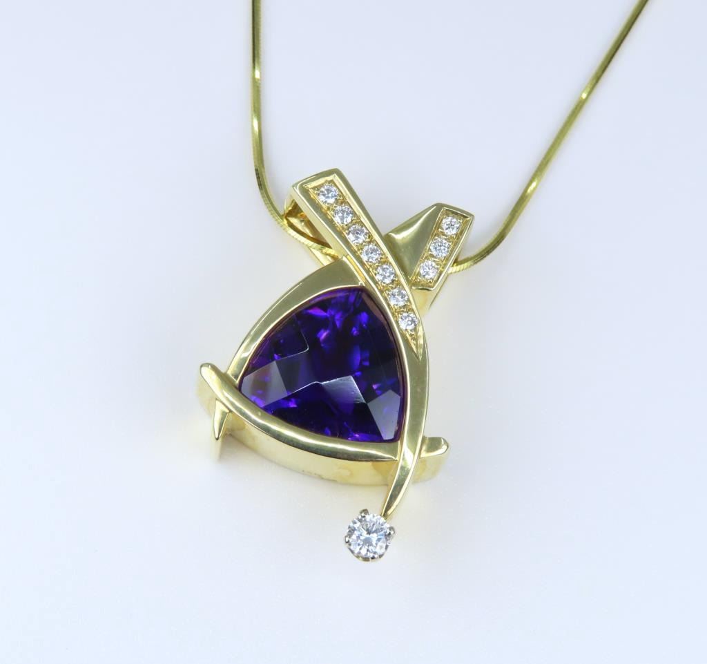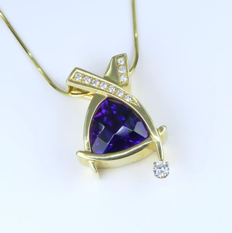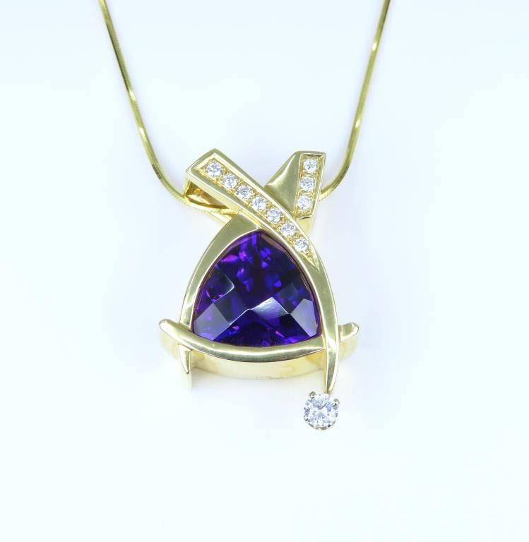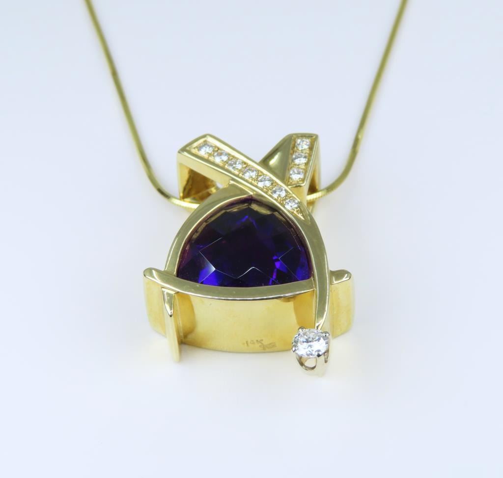 featuring an extra fine Fantasy cut Amethyst weighing approximately 12.00-15.00 carats and fine set with 11 ‘IDEAL’ cut Diamonds weighing approx. 0.30 carats with F-G colors and VS clarity, set in a dynamic 14 karat yellow gold artisan crafted setting weighing over 26.00 grams. Retail $8,000-$12,000.