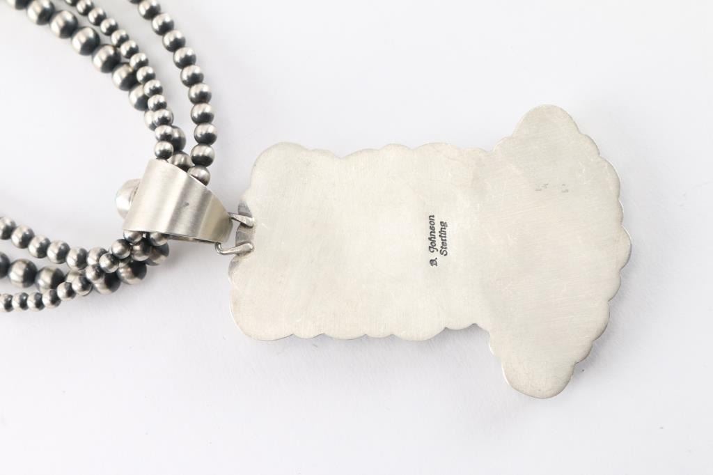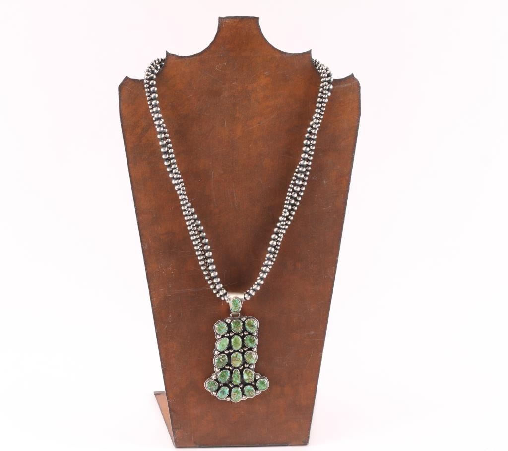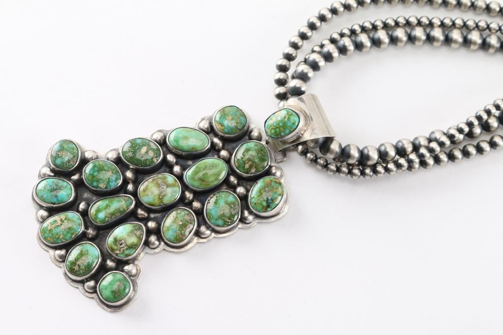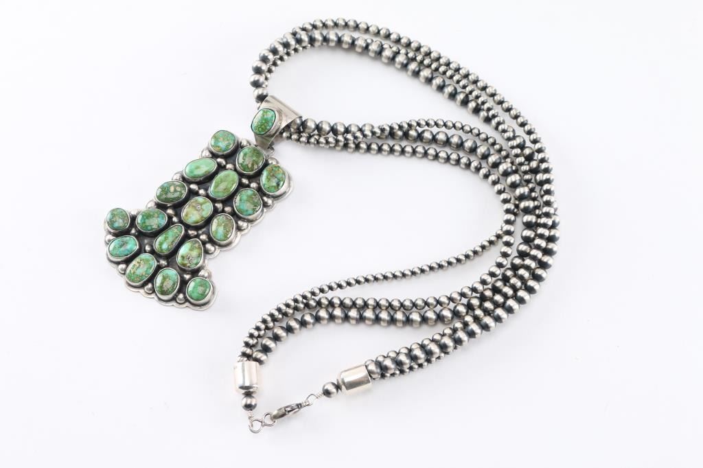 on satin finished Navajo pearls three strands all sterling. Beautiful high quality piece. Maker marked