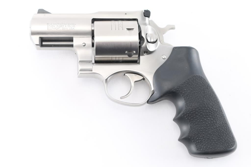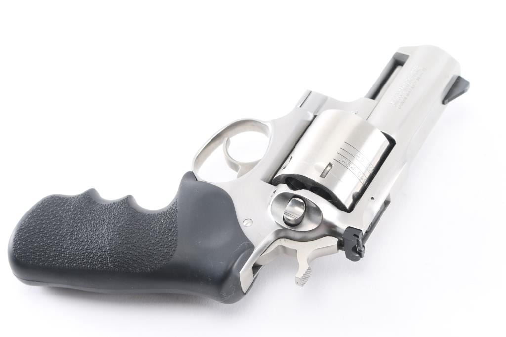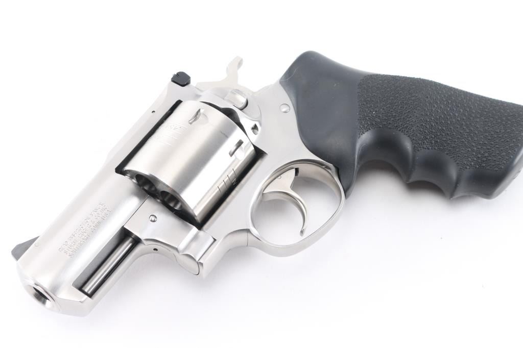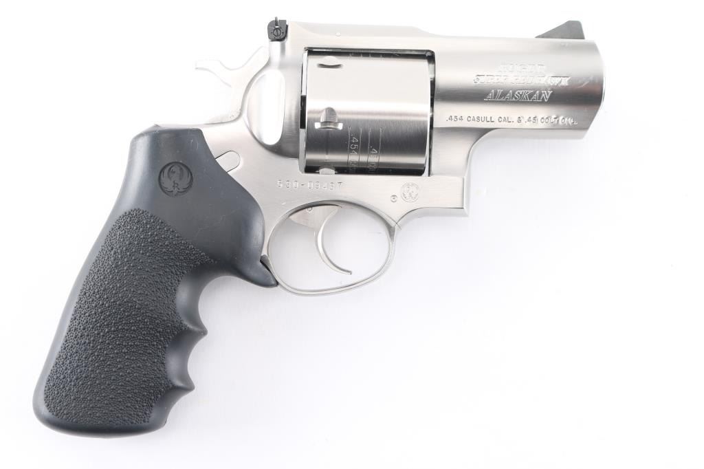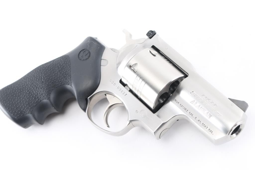 SN:530-09437 American made 6 shot revolver chambered for .454 Casull and .45 Colt ammunition, circa 2006. The "Alaskan" features a 2" barrel with full underlug, Stainless steel frame, barrel, and unfluted cylinder. It has a smooth trigger, knurled hammer spur, black serrated ramp front sight, adjustable white outline notch rear sight and black rubber, finger groove, pebbled wrap around grip with Ruger logo. Metal finish shows minor handling marks/scuffs and a drag line on the cylinder. Bore is excellent. Grips are excellent. Condition is NRA Very Good to Excellent*Modern Firearm*