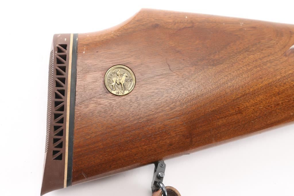 Big bore lever action repeating rifle chambered in .444 Marlin, Centennial Model with brass disc inletted in the left buttstock dipicting a man on horse holding a rifle with "Marlin 1870-1970". Features a blued finish, 24" micro-groove barrel, half length tubular magazine, hooded blade front sight with brass bead, rear sight removed with insert in the dovetail, a Williams adjustable aperture sight installed on the left receiver, smooth gold accent trigger, driller & tapped receiver, serrated hammer spur with offset "JM" extension installed, swivel studs, grip safety, smooth walnut forend and straight wristed high comb shoulder stock with ventilated rubber recoil pad. Bore is very good bright condition. Retains 95% finish with handling marks. Wood is very good condition. Includes good condition brown leather one hook sling.Condition is near NRA Excellent C&R Firearm.