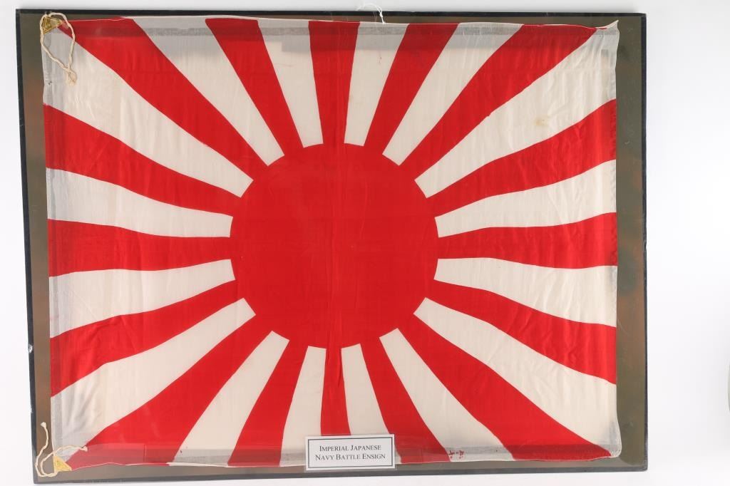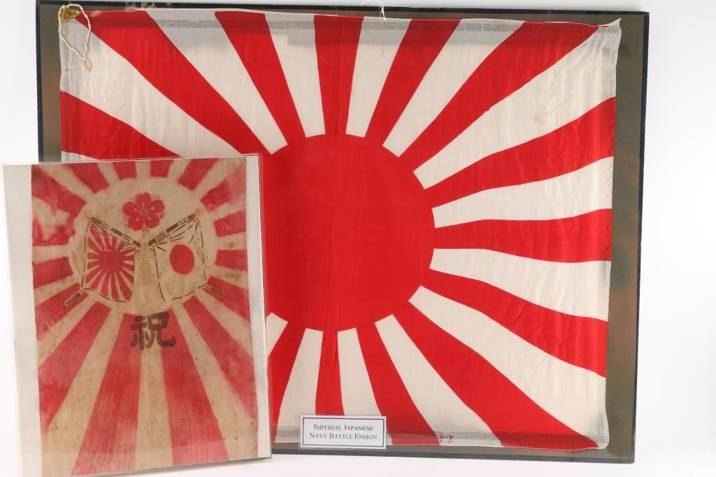 1) 2) Imperial Japanese Naval Ensign. Rising Sun Flag (Kyokujitsu-ki) design adopted as the naval ensign of the Imperial Japanese Navy (Naval flags have the sun off center to the left). IAJ had the sun in the center. Very nice one piece rising sun flag that measures approximately 29" x 36 1/2”, and is made of very fine silk. It is in very good condition, with a dyed red "Sun" in the middle, with rays going out to the edge of the flag. It features gold toned leather reinforcements and ties on the staff side and nicely stitched borders. Shrink wrapped with cardboard backing, 30" x 40". 2) Rising Sun style flag, has a off center white circle instead of red depicting a cherry blossom, crossed rising sun and national flags with kanji symbols underneath. Unknown meaning as we could not find any reference to it. Measures 22" x 14", white silk, printed. Flag has a little water damage.