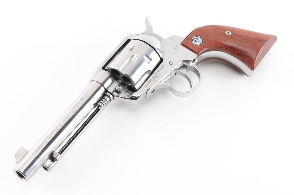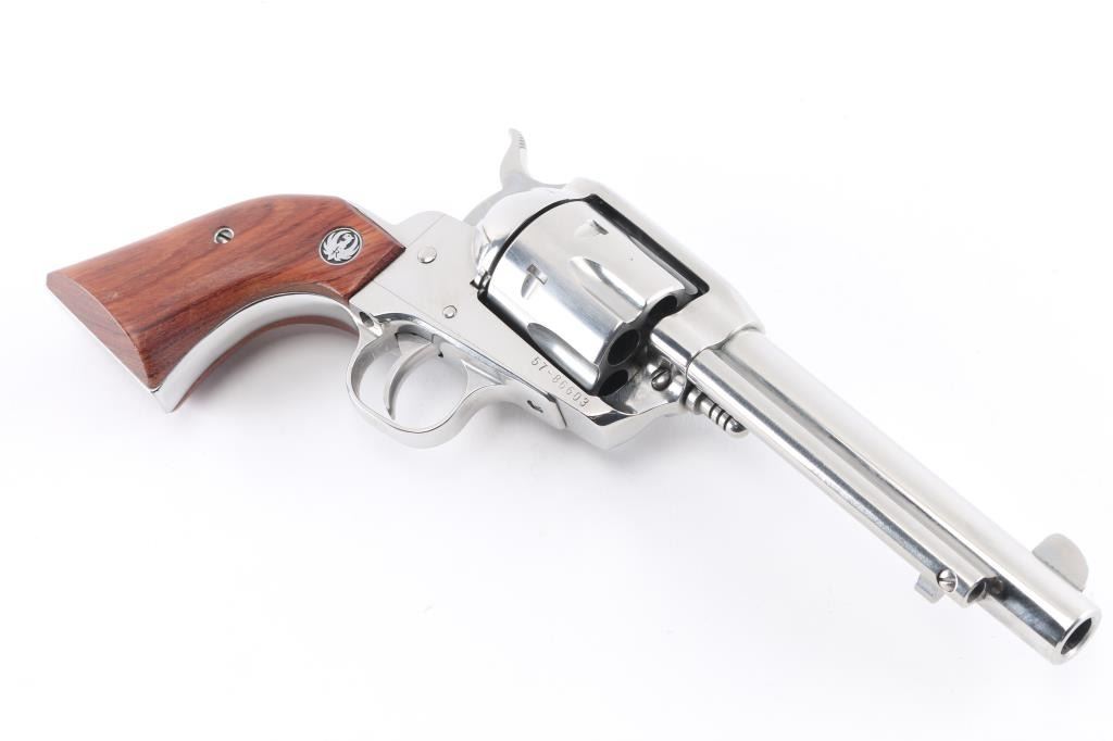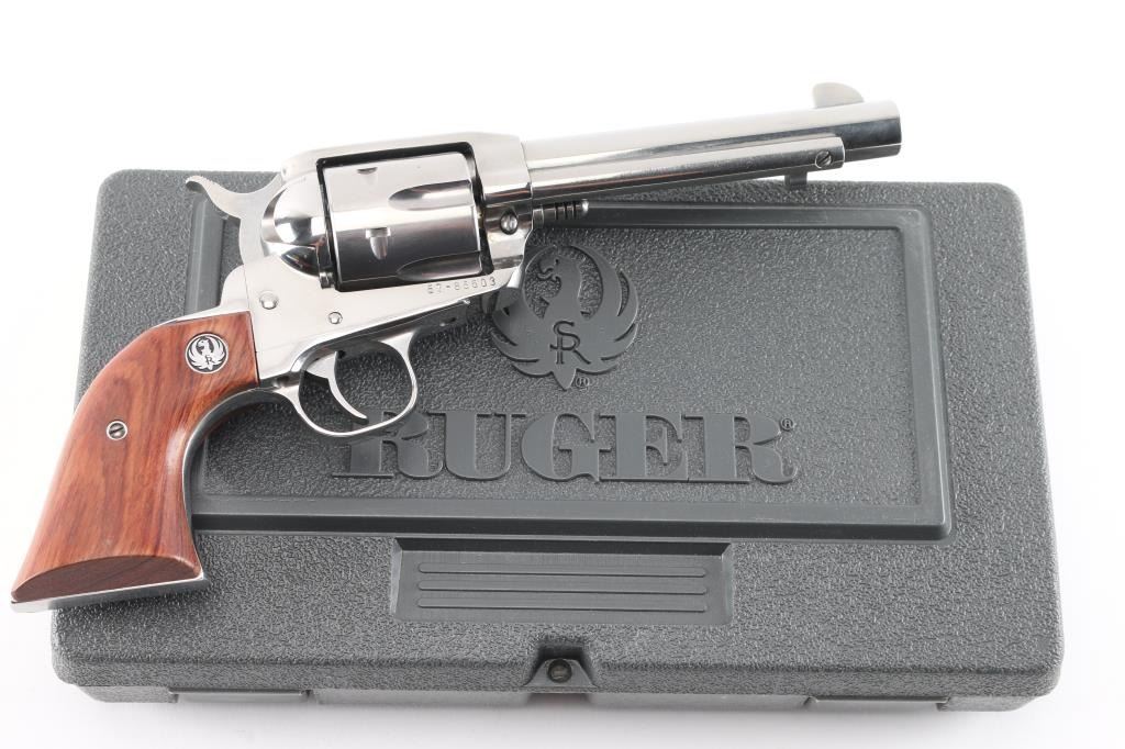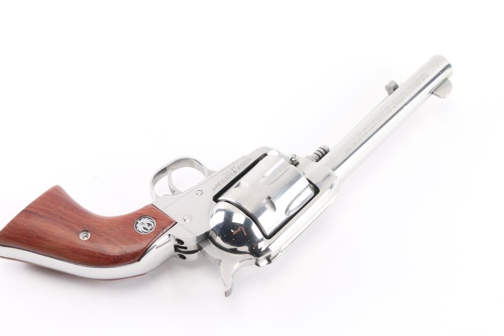 Single action revolver features stainless steel construction, smooth wood grips with Ruger medallions, 5 1/2" barrel with fixed sights, ejector rod under barrel, 6 shot fluted cylinder, loading gate on right side. Manufactured 2001. Bore is pristine Overall appearance is like new, with minor scratches. Action is crisp with tight lock-up, grips are fine. Includes factory gray plastic box, manual. Condition is NRA Excellent. Modern Firearm.