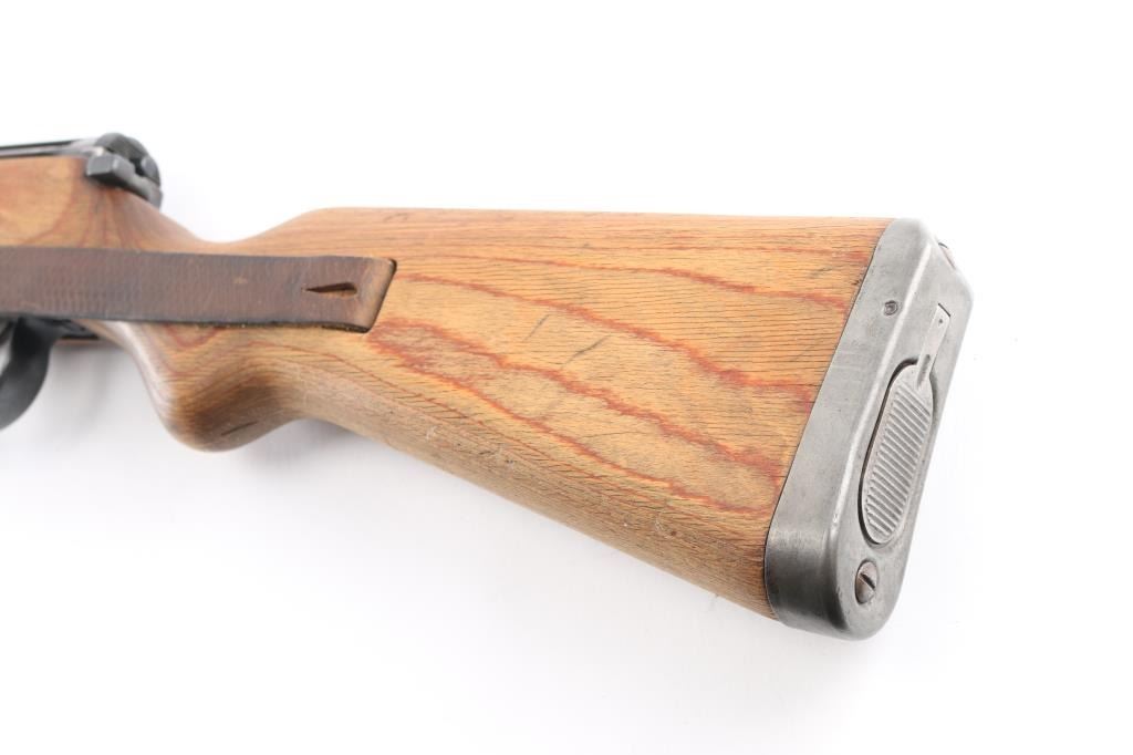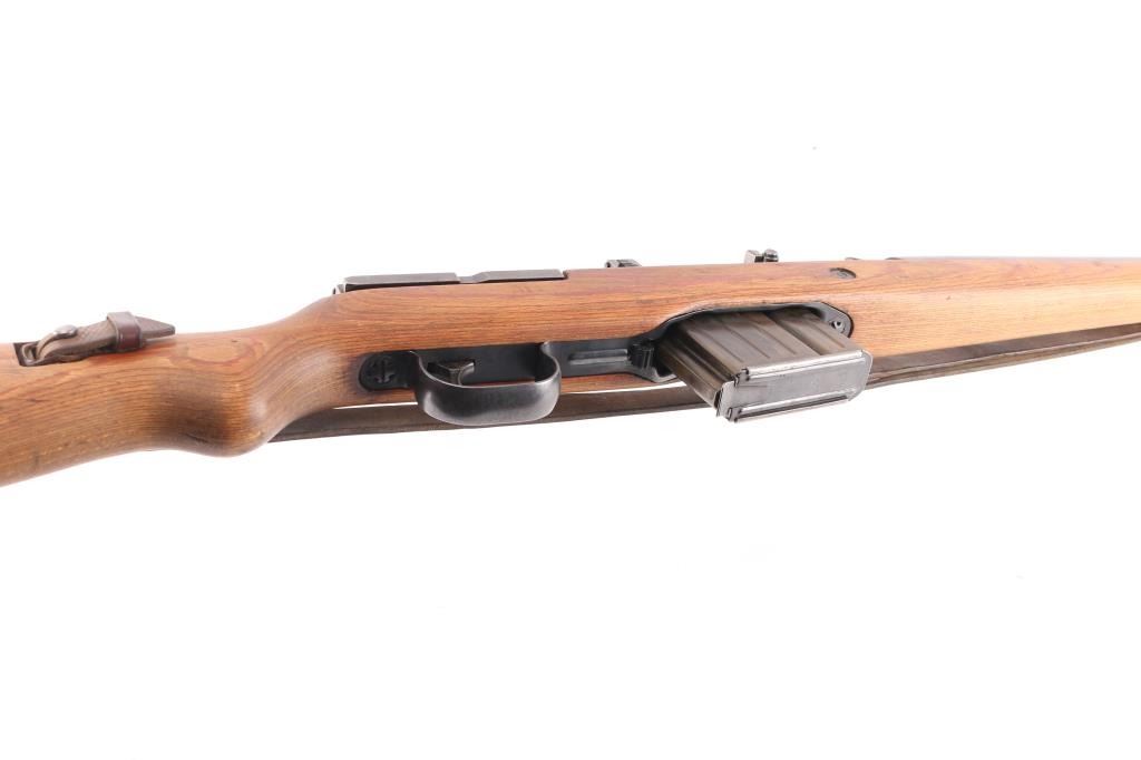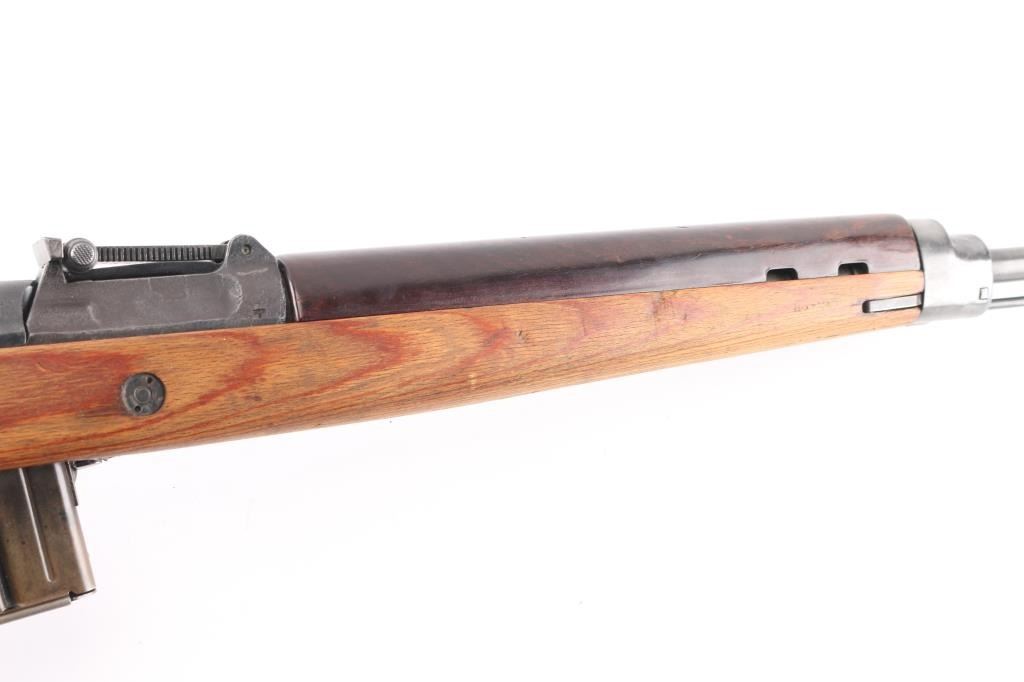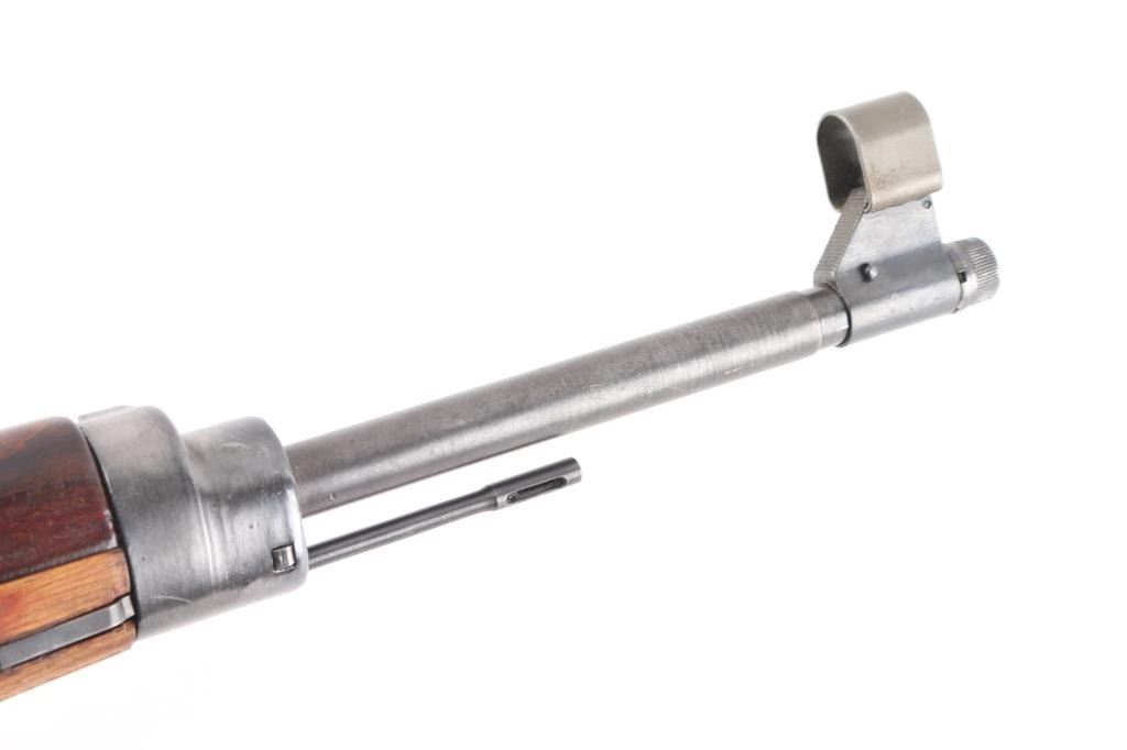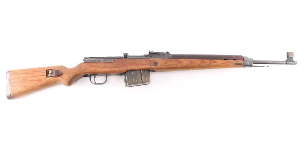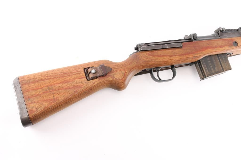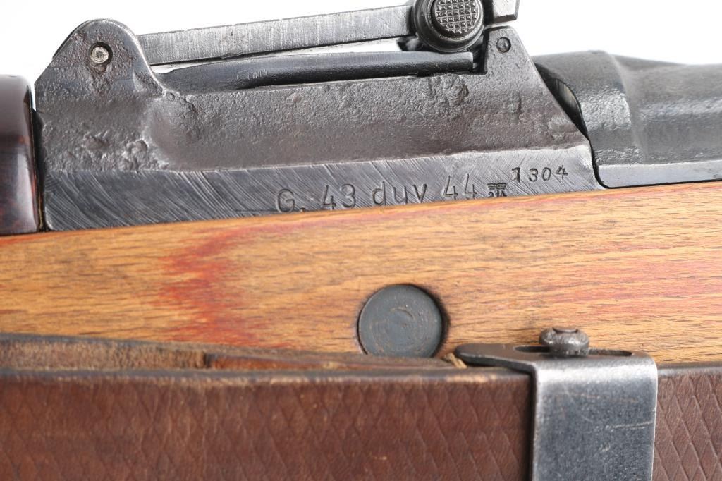 German WW2 military issued semi-automatic rifle. 10-rd detachable box magazine. Gas-operated short-stroke piston, flapper locking. 21.5" barrel. Produced 1943-45 with a total of 402,713 made. Threaded muzzle with removable nut for blank adapter. Hooded serrated ramp front blade and tangent rear sights. Rough machined receiver, and bolt carrier. Serrated bolt hold open lever to the right of the charging handle locks/releases the bolt. Left side of the receiver stamped "G.43", "duv 44", "[Eagle]/214". Matching serial numbers are found full or in part on the receiver, bolt carrier, bolt, firing pin, locking lugs, & stock. The "[eagle]/214" markings are observed on the receiver, bolt carrier, bolt and stock (in three places). "[eagle]/WaAA44" stamped on bolt housing. Bore has good rifling, scattered pitting and what appears to be a dark ring near the muzzle. There is no apparent bulge in the barrel but the front sight band has 5/8” tear extending from the thread protector. Blued metal finish is very good with wear and patina. Brown/red laminated wood stock, and dark wood vented handguard are very good with scattered blemishes. Cupped steel buttplate is hinged for cleaning gear. Comes with correct K98 sling, magazine marked "gcb" (Grohmann & Sohn, Wuerbenthal) "K43", and waffenamt “[eagle/WaAB92]”.