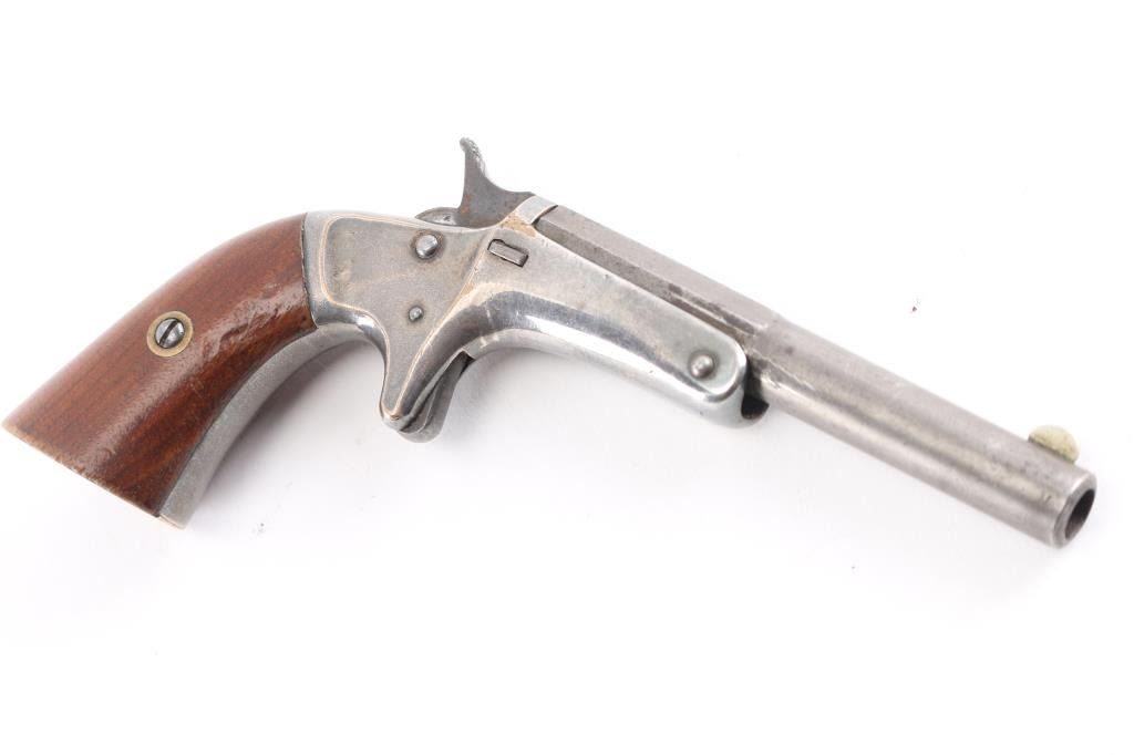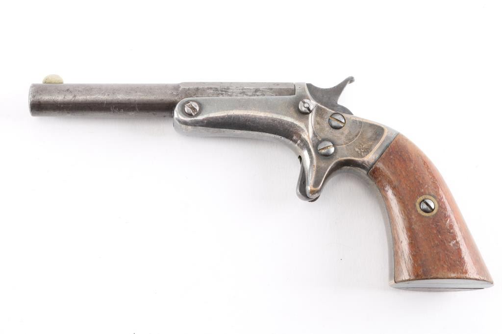 Old Model Silver Plated. Old Model 3.5 inch part octagon part round barrel with front blade and notched hammer spur Manufactured in Chicopee Falls, Mass. from 1864-1886. Barrel having the two line marking with patent date of "Sept 6, 1864". Most of the silver plating is there with the brass showing a]on the edges and the backstrap. The original rosewood grips are very good and are numbered to the gun, no SN on barrel. Frame under the left grip is also matching. Mechanically it locks up tight with the hammer holding at half and full cock. The bore is rough, pitted. First model with small barrel release head. Small circular sideplate. Rare .30 short R.F. caliber.NRA Condition-Good. Antique Firearm.