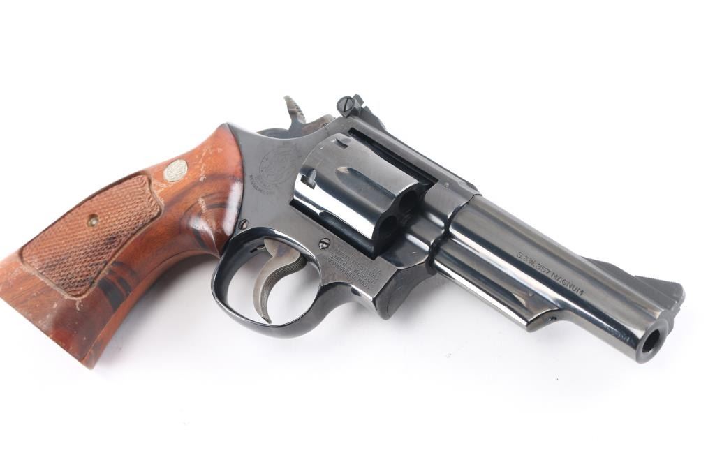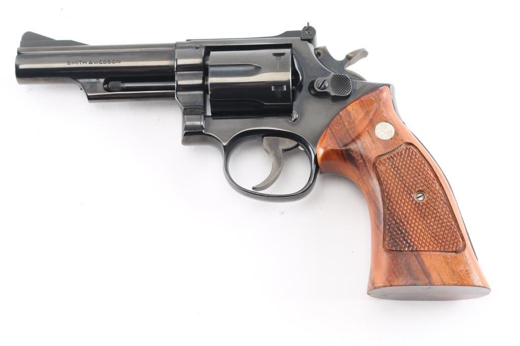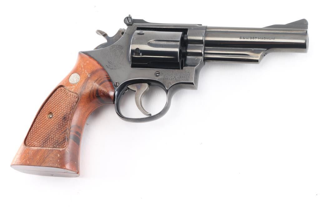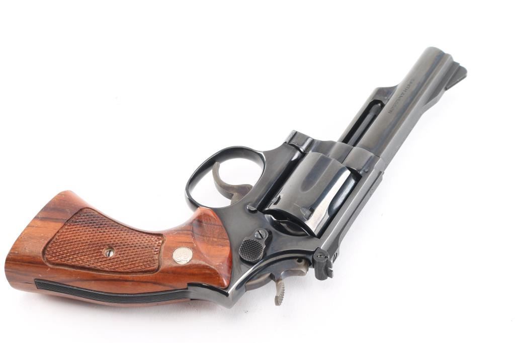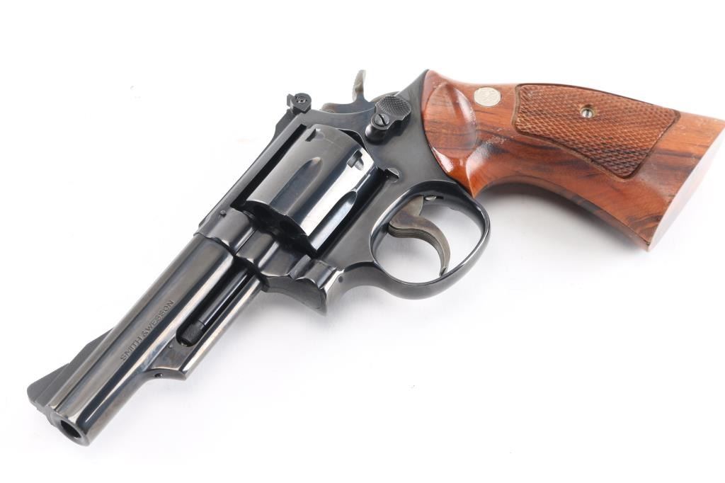 Combat Magnum Medium frame double-action revolver chambered in .357 Magnum. Features a bright blued finish, 4" pinned barrel with serrated top rib, shrouded ejector rod, ramped front sight, adjustable micrometer click rear sight, fluted six-shot cylinder, case color serrated trigger, case color knurled semi-target hammer and S&W medallion two-piece checkered walnut target grips. Bore is excellent/bright. Metal finish is excellent with faint drag line on cylinder. Wood grips are very good with minor finish lossNRA Condition-Near Excellent. Modern Firearm..