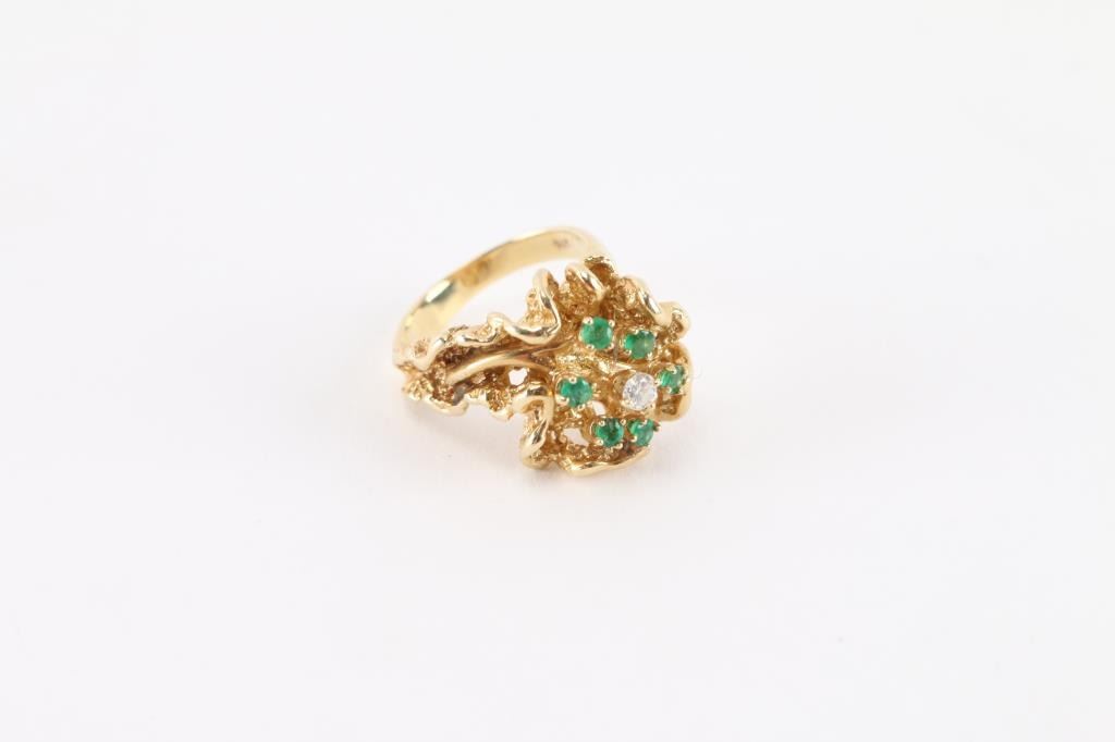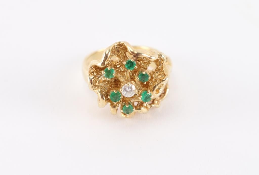 14kt Yellow Gold Size 3, 6 Emeralds Surrounded By Single Diamond.