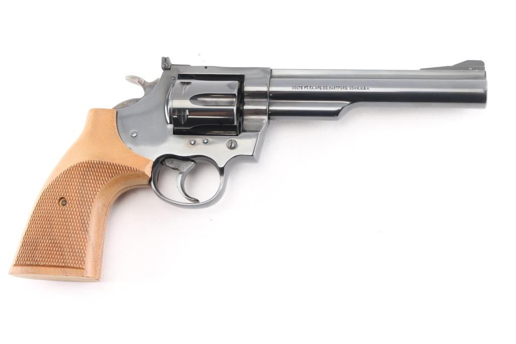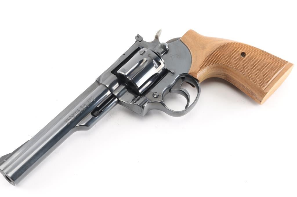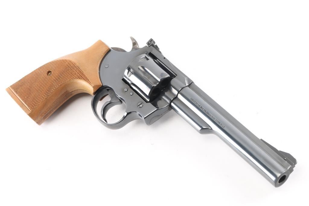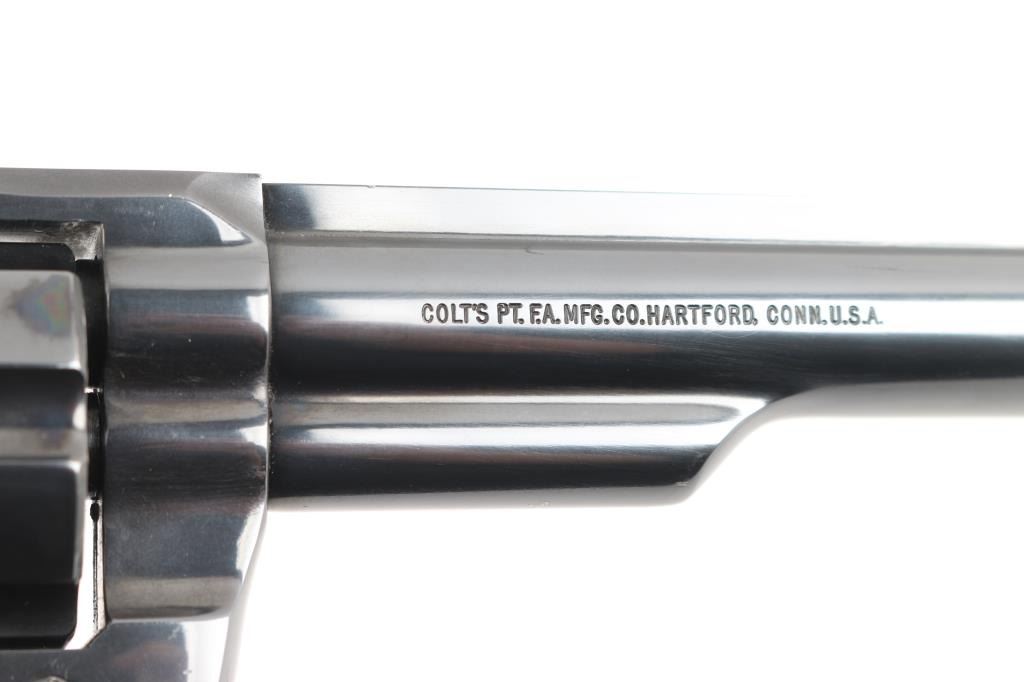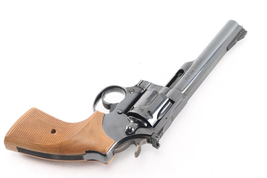 Double-action revolver chambered in .357 Magnum, circa 1960. Features a blued finish, 6" barrel with solid top rib, shrouded ejector rod, raised & pinned ramp front sight, pinned adjustable square notch rear sight, fluted six-shot cylinder, case hardened smooth trigger, case hardened knurled wide hammer spur, checkered target grips and serrated backstrap. Bore is bright with strong rifling. Retains approx. 98% finish with little to no scratches and or losses. Grips are excellent. Action is smooth with tight lockup. NRA condition is excellent.*** Modern Firearm ***