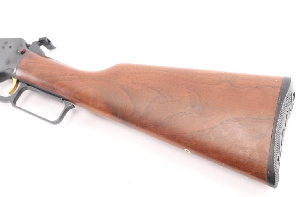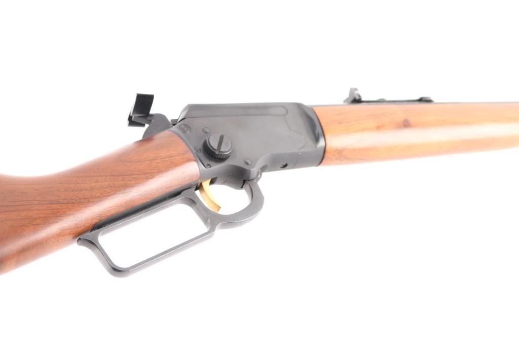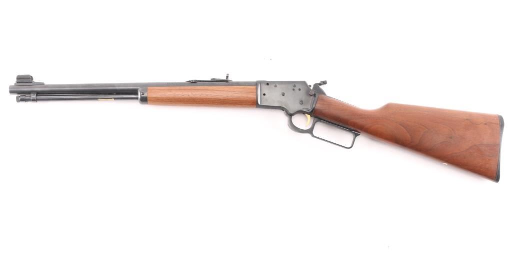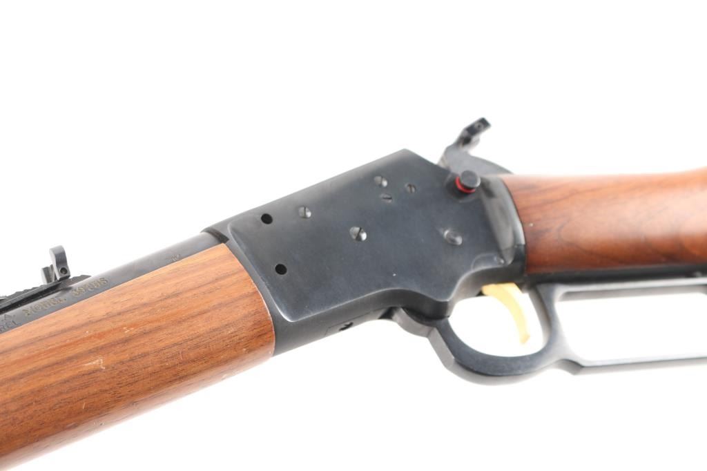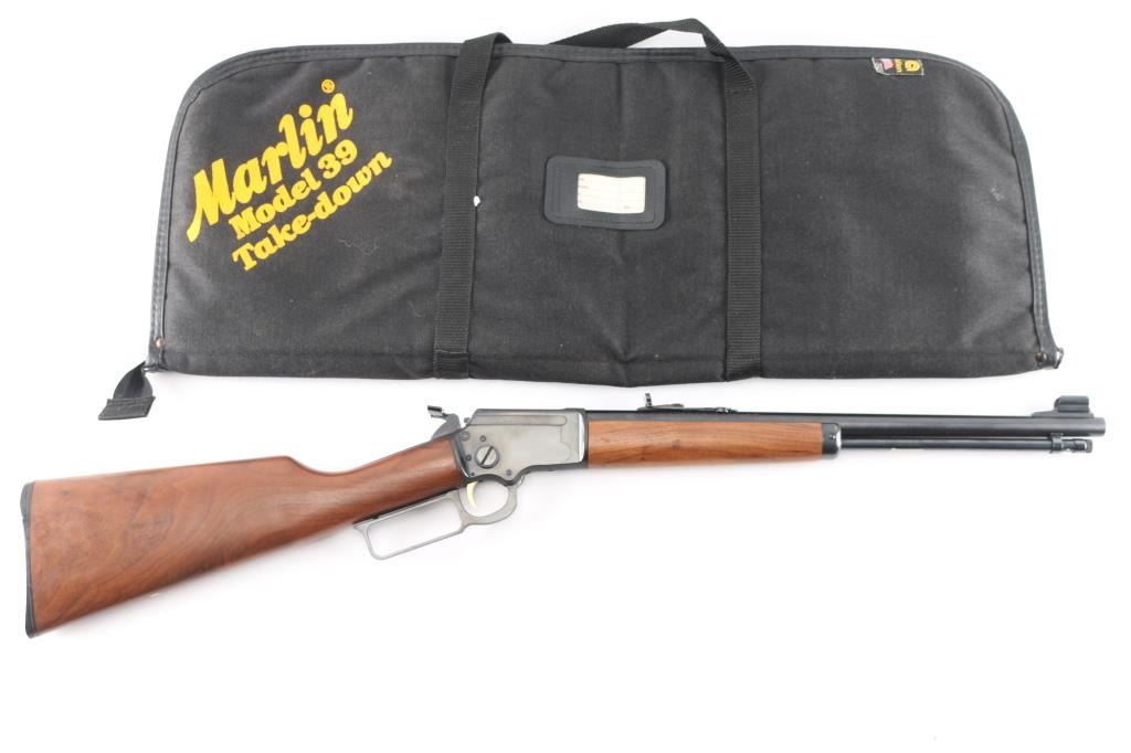 Lever-action take-down carbine. Manufactured circa 1990. 16 1/2" barrel, full length magazine tube, hooded blade/bead front and adjustable, U-notch, flip rear sights. The left side of the barrel is marked “The Marlin Firearms Co. New Haven, Conn. U.S.A. / CAL.22 S. L. & L.R. MICRO-GROOVE BARREL”, “MODEL 39TDS”, with “JM” on the left at the chamber. Take down screw on rhe right receiver, gold toned smooth trigger,thumb extension on hammer spur, receiver drilled/tapped for optics,push button safety, blued finish with smooth walnut stock & forearm, black plastic factory buttplate. Bore is pristine, action is crisp/smooth, wood and finish are excellent. Comes with original factory soft case for take-down carry. NRA Condition-Excellent. Modern Firearm.