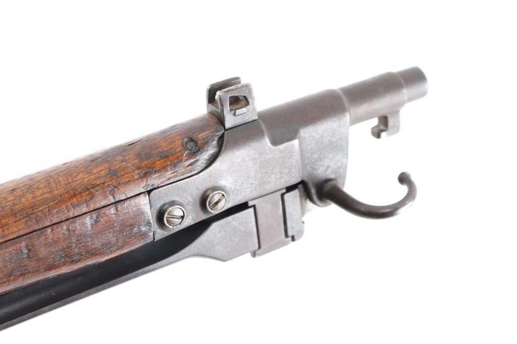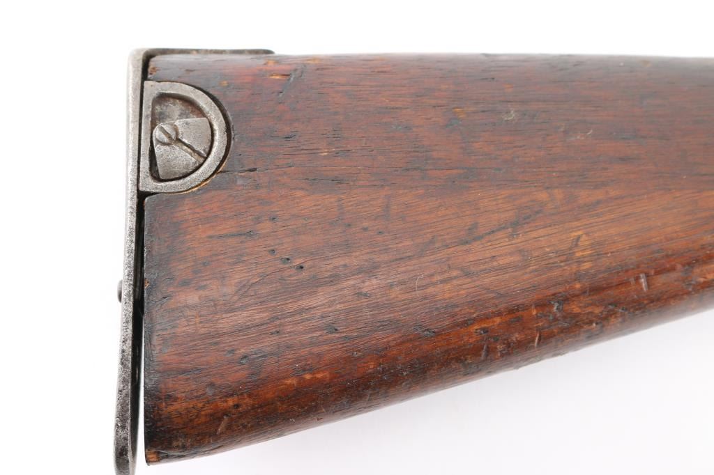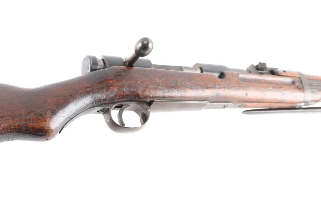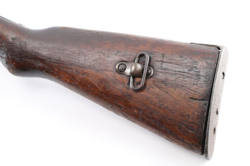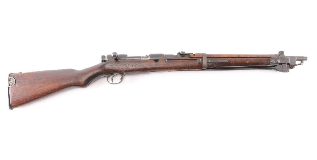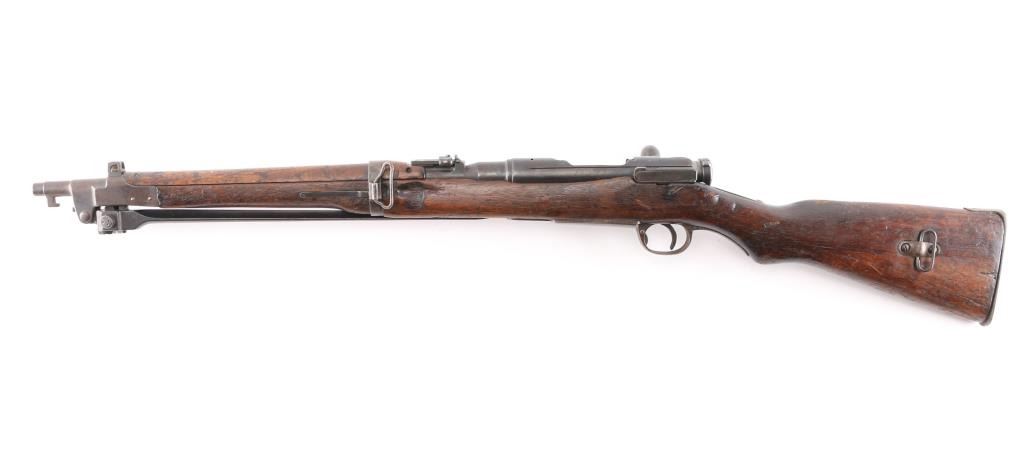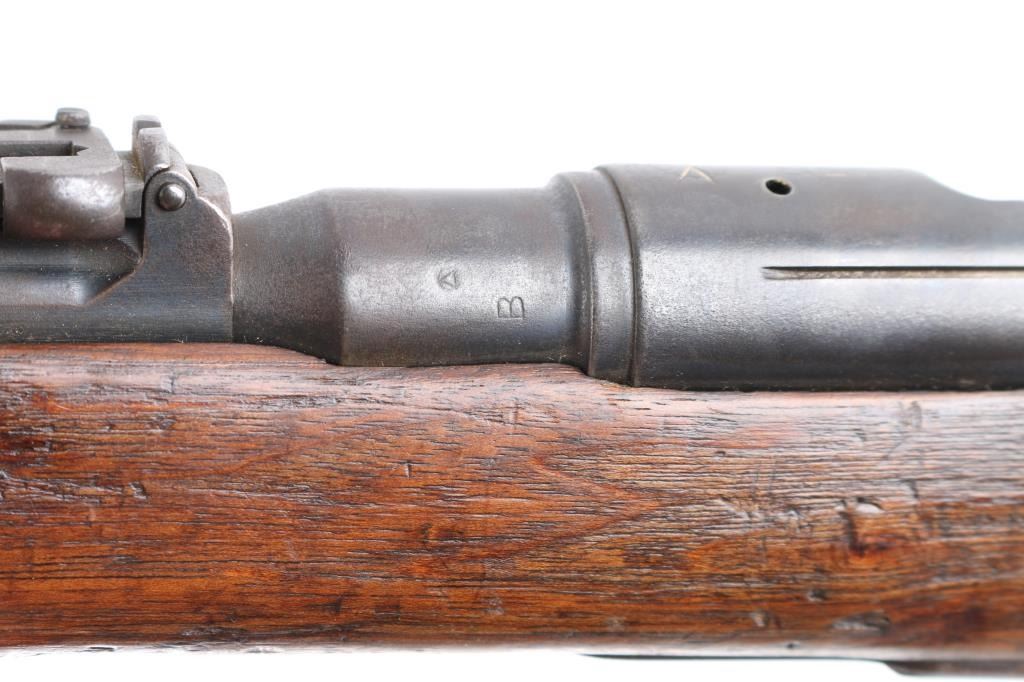 "Cavalry Carbine". second variation, with one hole for cleaning rod. Produced 1911-1942. Entered service in 1912, the 44th year of the Meiji reign, Type 44. Mostly intact Chrysanthemum with an X cut. Three Japanese characters on the chamber translate to "Type 44", Japanese military bolt action rifle features 19" barrel, protected blade front sight, V notch rear sight with flip-up elevator ladder, straight bolt handle, folding spike bayonet, butt compartment, side mounted sling swivels, manual safety, hinged floorplate. Hook located below the front sight on the right side, replicating the quillon of the type 30 bayonet for bayonet fencing techniques of the period, and for stacking. Mismatched serial numbers. Bore rough/frosted with rifling present. Retains about 70% dull blued finish, bottom metal has turned a brown patina, buttplate is missing the bottom screw and is a little proud of the wood. Wood is good condition with some small scrapes, scratches & dents, Observed markings are a little faint. NRA Condition-Good. C&R Firearm.