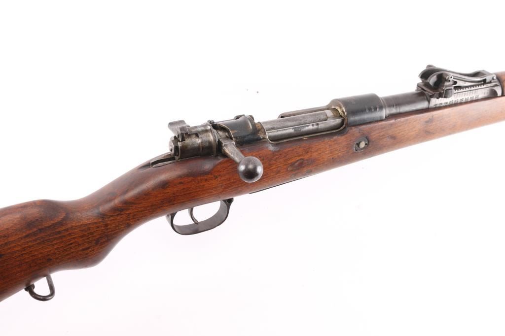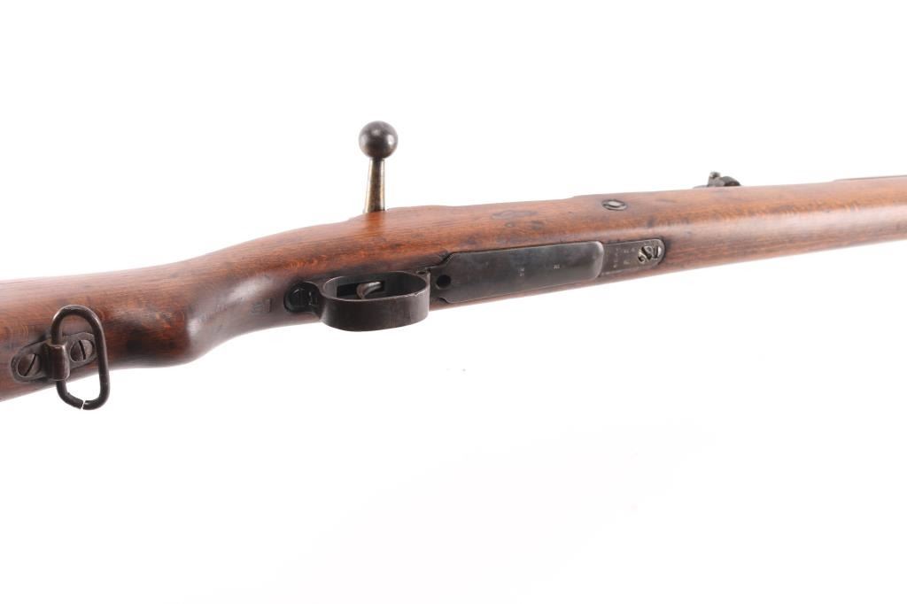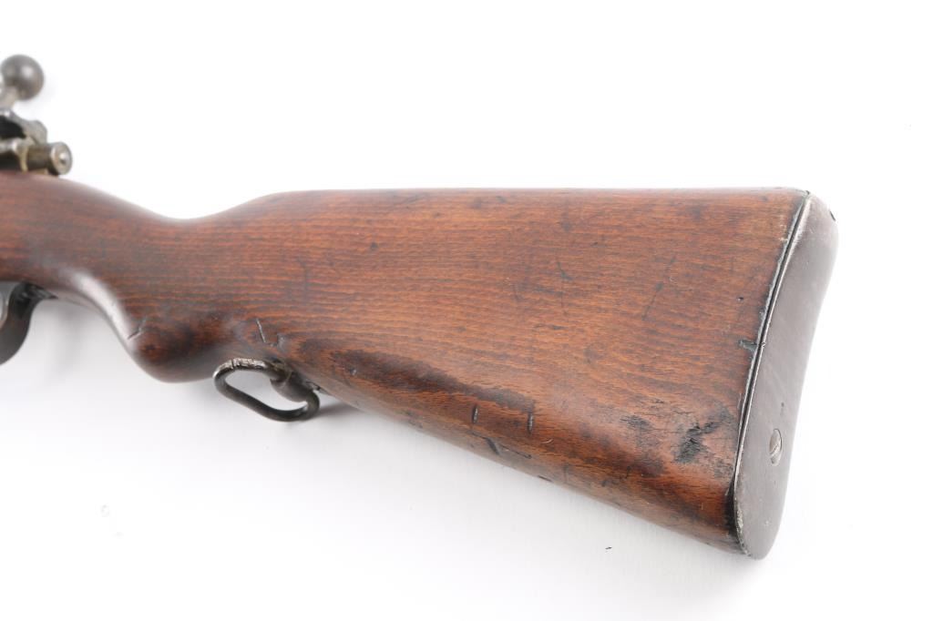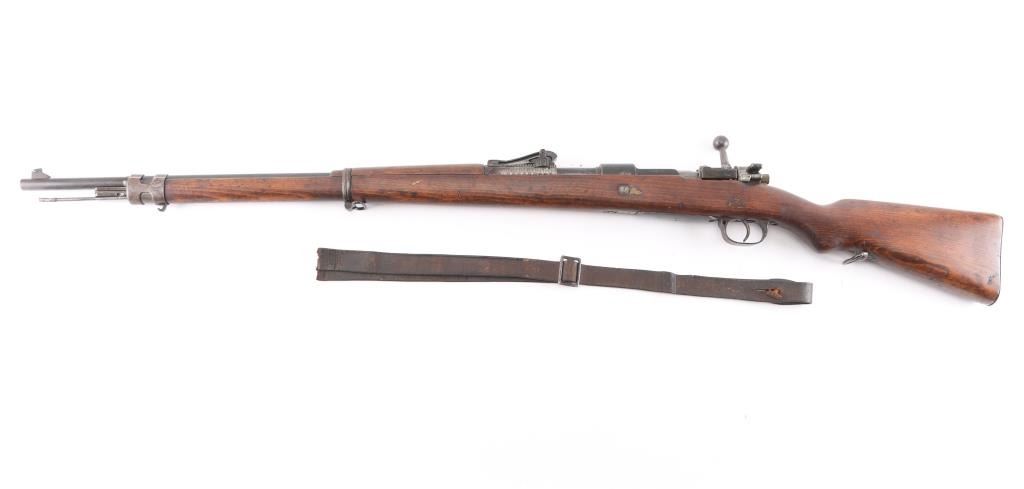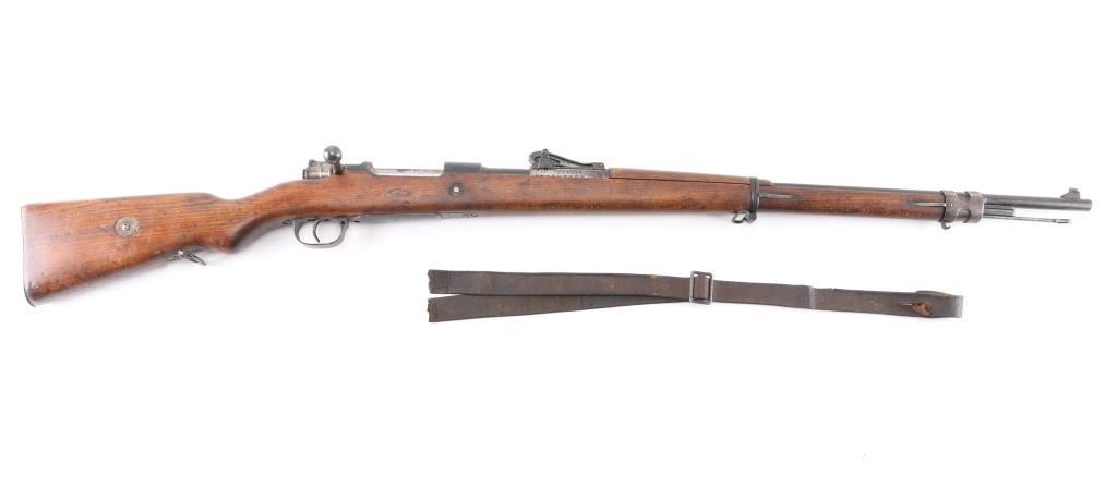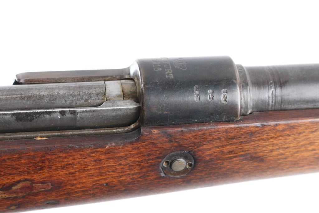 All matching German WW1 dated bolt action military battle rifle. Serial number is repeated on the stock, chamber, both barrel bands, floorplate, triggerguard, buttplate, rear sight, safety lever, bolt shroud and bolt. Chamber stamped "Erfurt 1907", Imperial German proofs/cartouches. Has most of the original blued finish, dulled over time, with the rest a molted gray. Stock is smooth and retains all the original German stampings, two minor repairs on the left side with what appears to be plastic wood. This is a fine looking example of the hard to find classic GEW 98 that armed German forces in the trenches during WWI. Comes with the original black leather sling which has broken at the top sling swivel. Bore is dark, rough with rifling present. Condition is NRA Good. C&R Firearm.