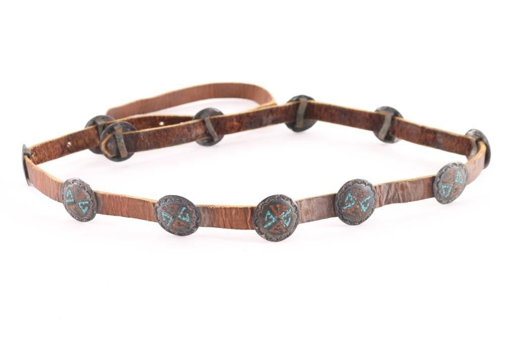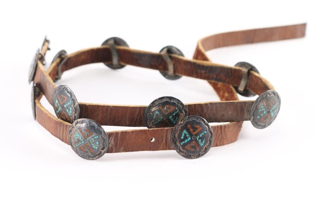 Round Conchos Inlaid With Coral And Turquoise. 34" End To End
