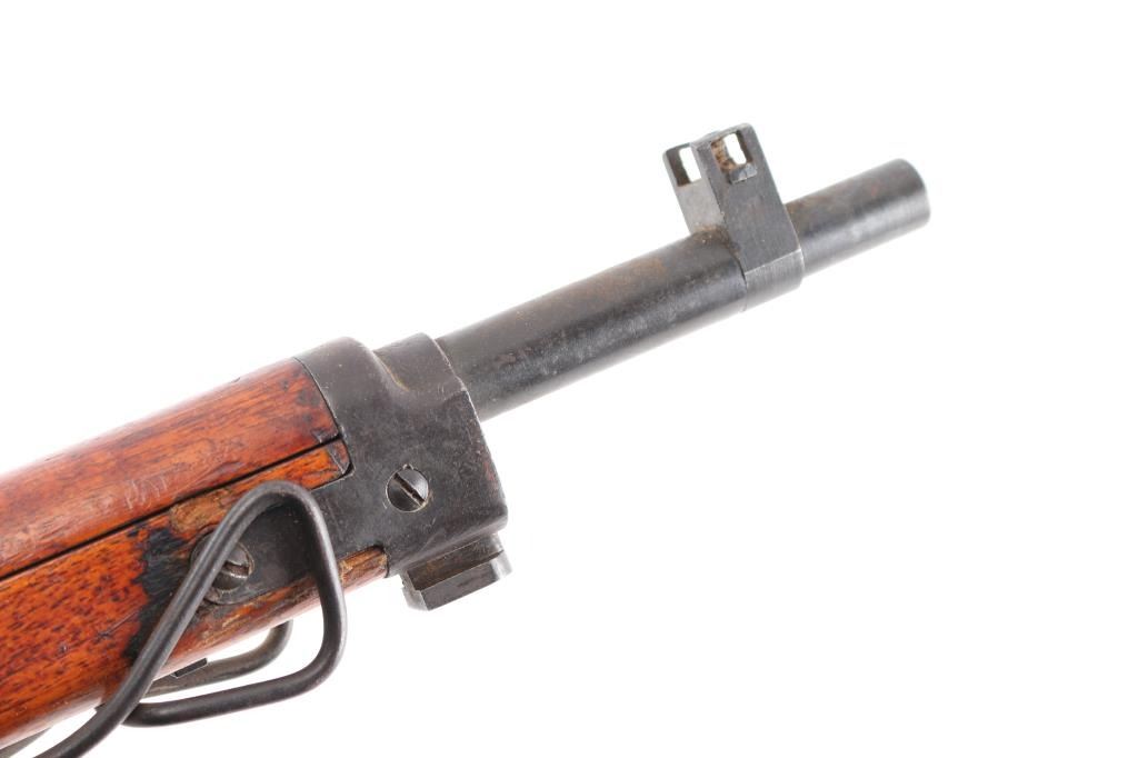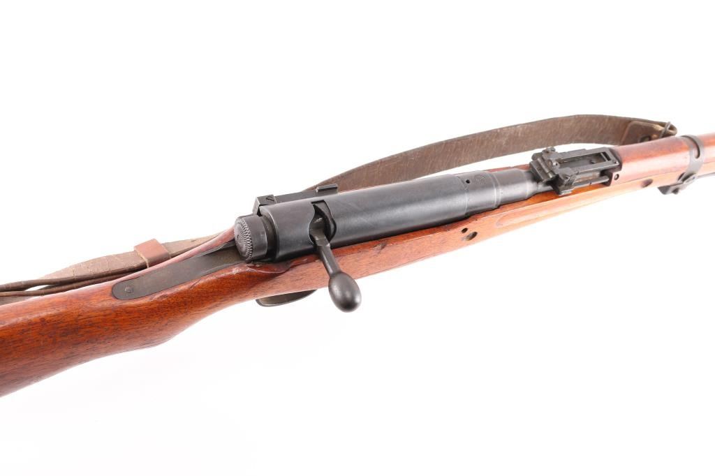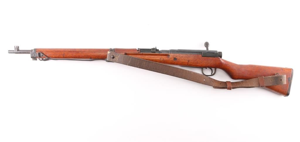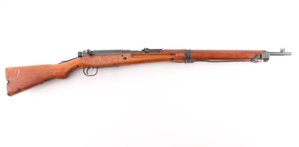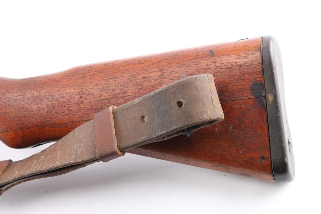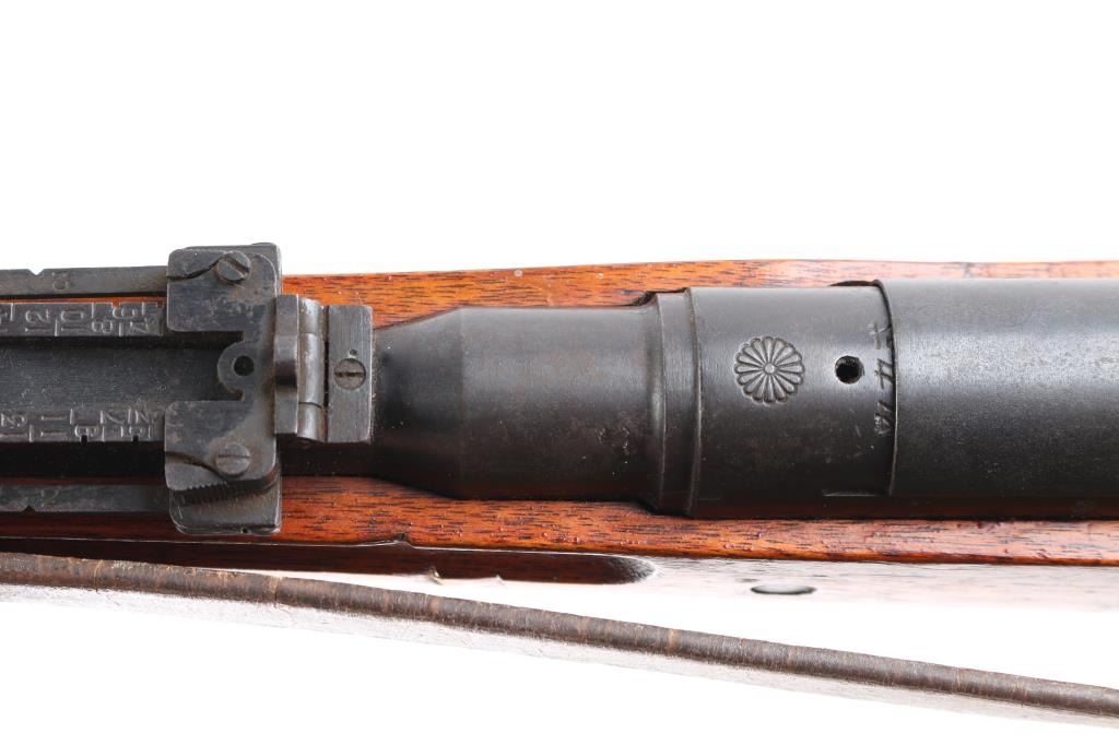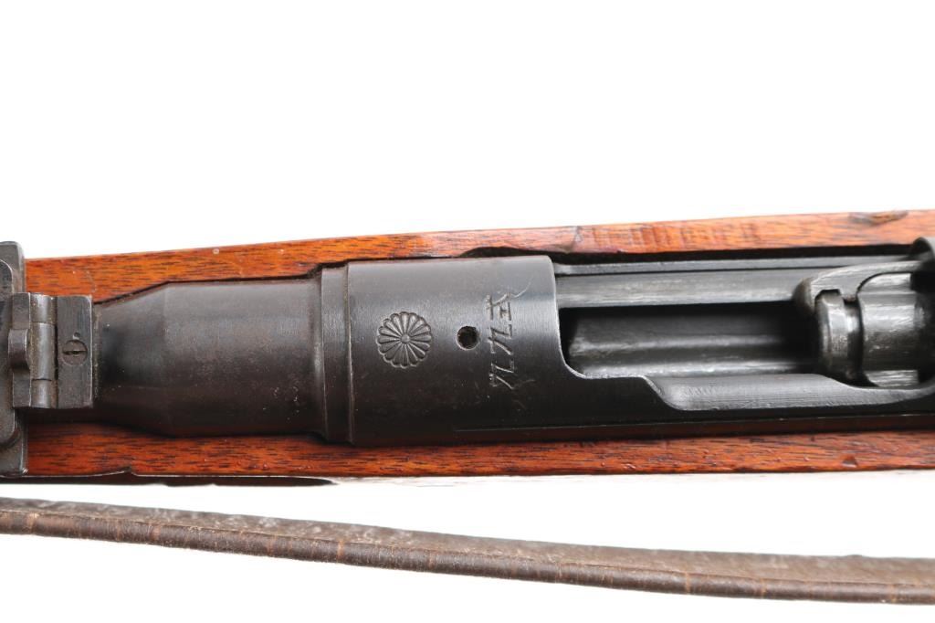 4th series. Full intact Chrysanthemum. Japanese military bolt action short rifle. Features a chrome plated bore, monopod, anti-aircraft volley sights. Mismatched dust cover, missing cleaning rod. Retains 85% finish, with handling marks, edge losses, some fading and light patina formation throughout. Wood is good overall, appears it was varnished at some point , many dings and dents, several gouges. Matched serial number matched on receiver, bolt, extractor and firing pin.Bore is very good/bright, action works well. Attached is a original type 99 rubberized canvass sling Developed to resist mildew in the jungle and create a lighter sling. Wartime use of 1942-45. What makes this rifle really collectible is it has a Bullet impact mark on the right side of the steel buttplate causing a chip out of the wood. No import marks, looks like it was just taken off of one of the Islands.Condition is NRA Very Good. C&R Firearm.
