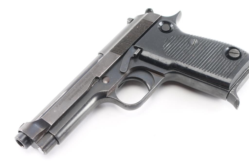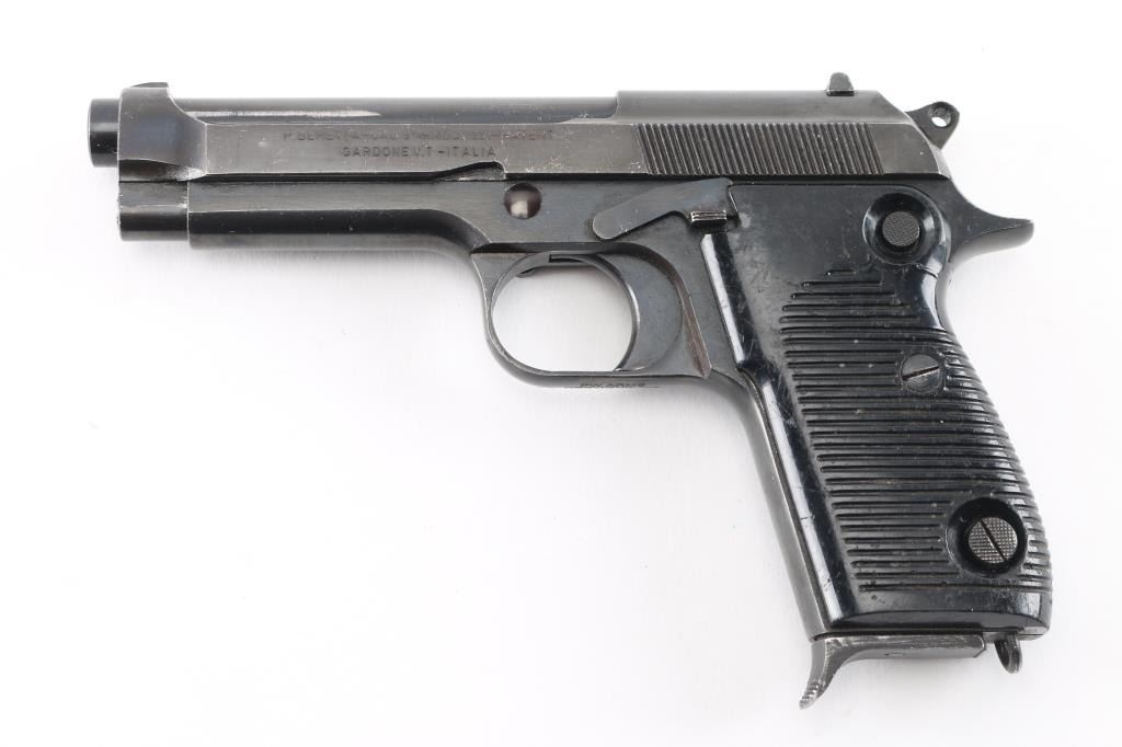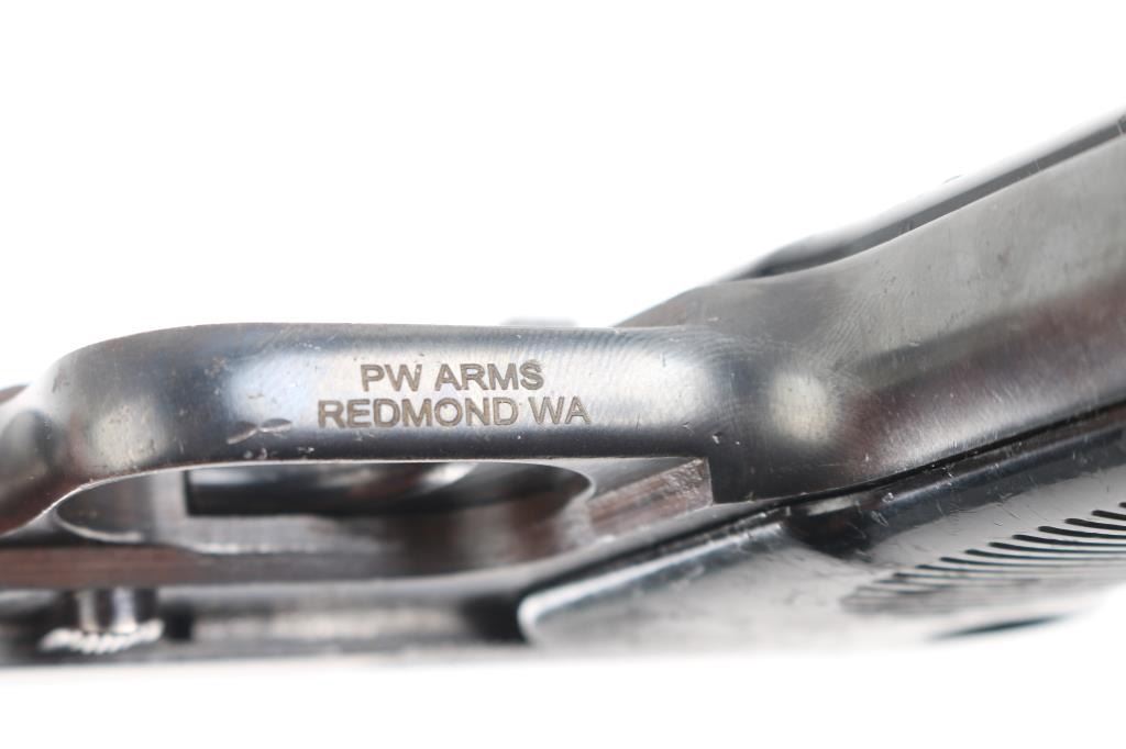Brigadier single action semi-automatic pistol. Italian made, imported by PW Arms, Redmond WA. (Underside of triggerguard). Features a blued finish, 4.6" barrel, fixed front sight, dovetailed rear sight, smooth trigger, push button safety, serrated round hammer spur, push button magazine release low on grip, lever on right frame marked "Smontaggio" ( Italian for "Disassembly), factory 8 round magazine with pinky rest extension, lanyard loop and two-piece grooved black plastic wrap-around grips. Bore is very good/bright, strong rifling, needs cleaning. Retains 85% finish with scratches and edge losses. Grips are good or better condition with scratches. Includes one magazine. First letter of the date code on the right beavertail is obscured, second letter is "M".Condition is NRA Very Good+. Modern Firearm.