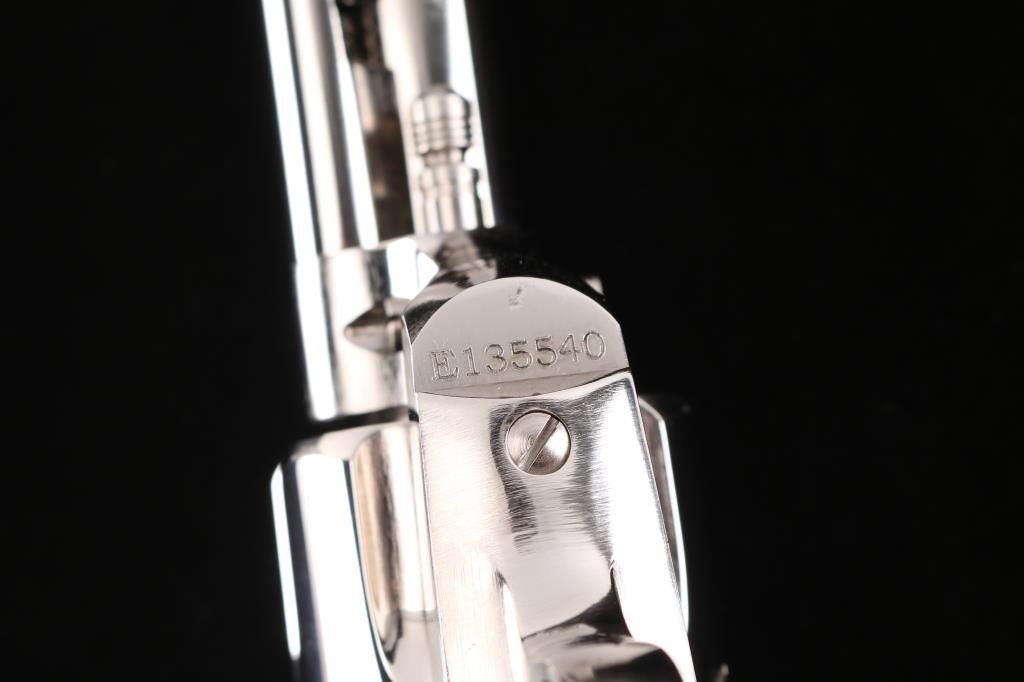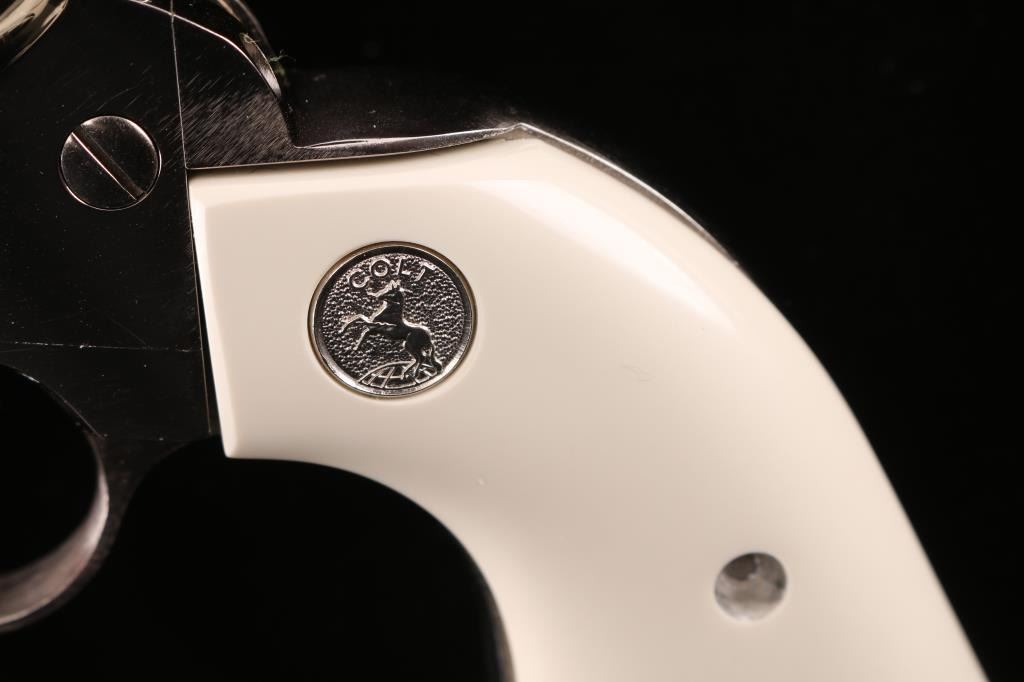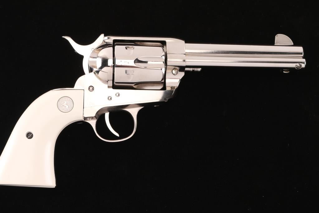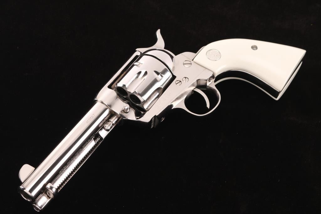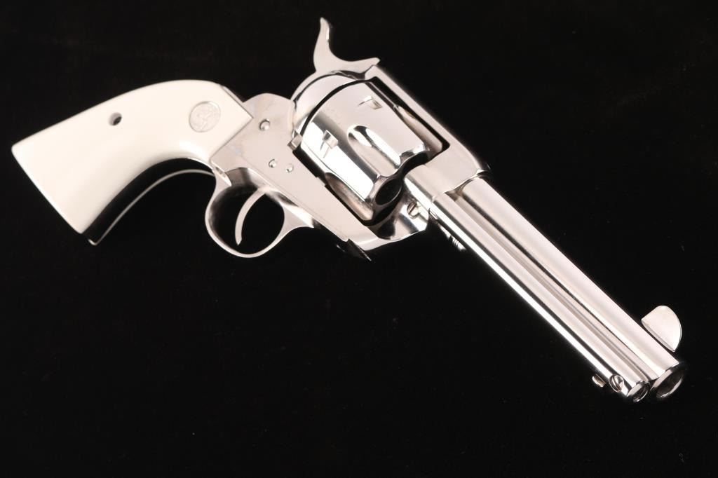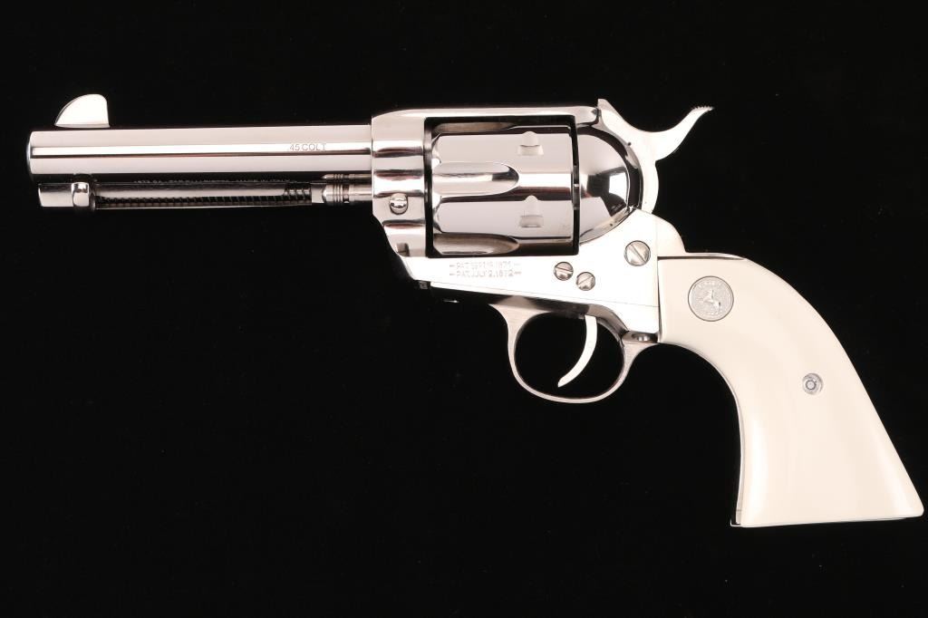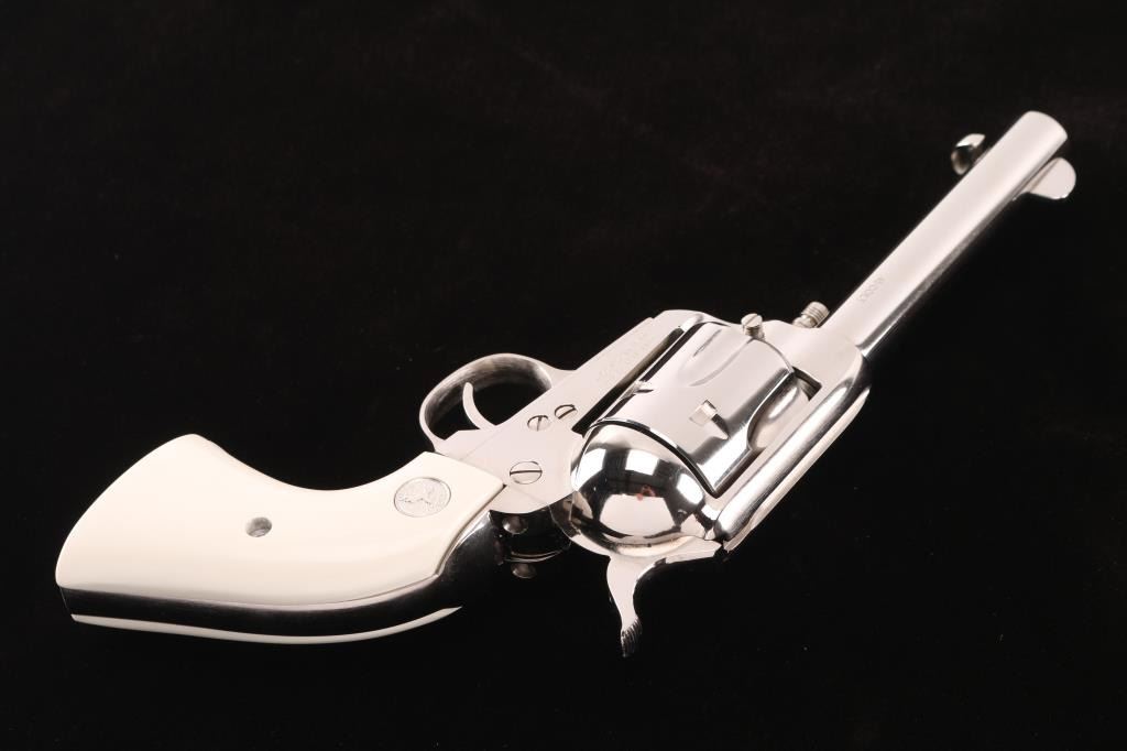 Made in Italy by Pietta, imported by KC LLC, marked on underside of the barrel. Nickel-plated single action revolver, Colt SAA three screw clone, 4 3/4" barrel, integral rear sight with large blade front sight, serrated hammer spur, smooth trigger, spring-loaded ejector rod with contoured head, two position cylinder rod and faux ivory grips with silver toned Colt medallions. Bore is excellent/bright, a little dirty, action is smooth with tight lock-up, grips are excellent and the nickel finish is excellent.NRA Condition-Excellent. Modern Firearm.
