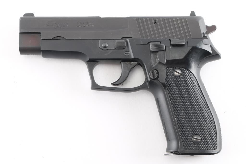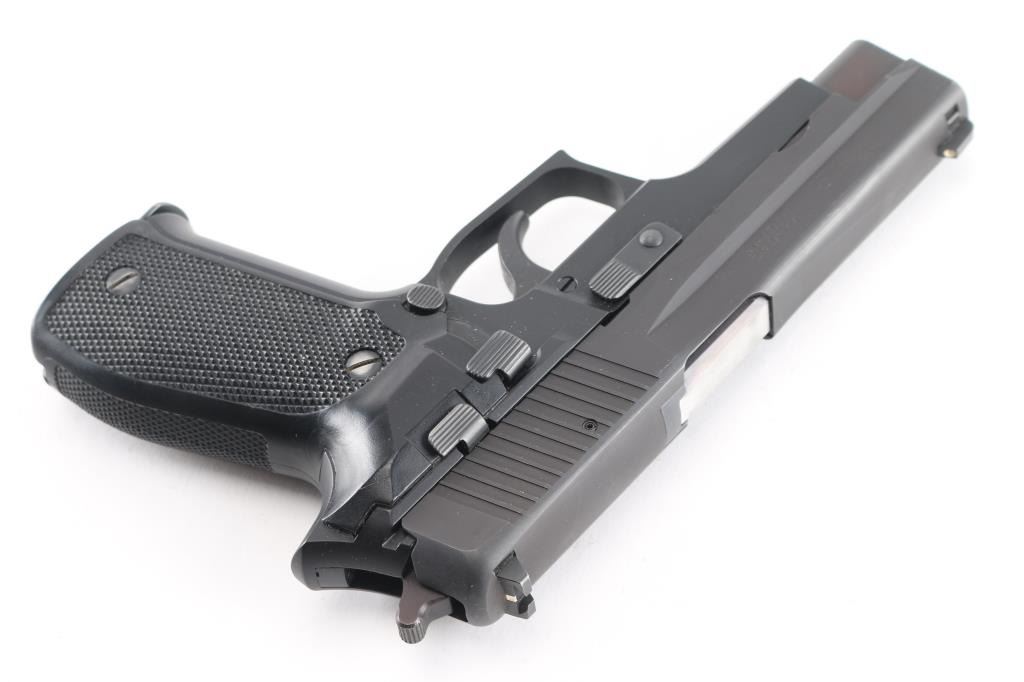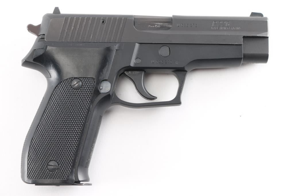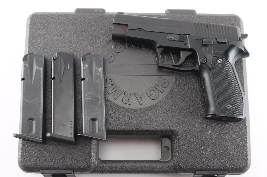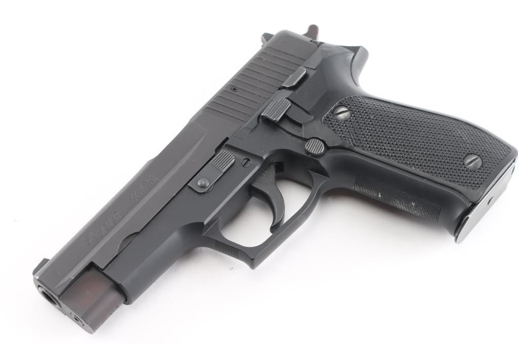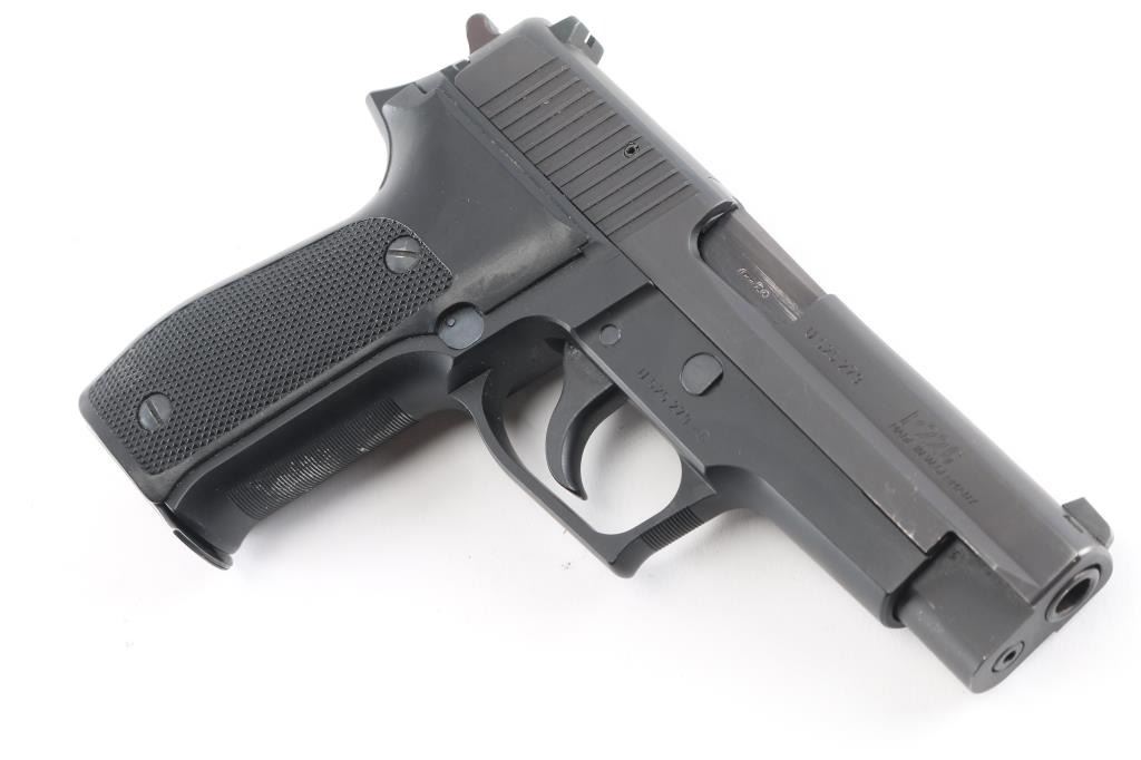Made in W Germany Semiautomatic pistol, imported by SIGARMS, Exeter NH. Features matte black alloy frame, matte dark gray slide, 4.25" barrel, white dot front & white bar rear sights in dovetails, frame mounted decocking lever, double/single action, pushbutton magazine release, black checkered polymer grips. Bore is excellent/bright. Retains 95% finish with some minor scuffs, some wear to the serrated fore strap. Grips are very good. Includes factory hard case, manual, 3 spare 15 rd factory magazines (4 total).Condition is NRA Very Good++. Modern Firearm.