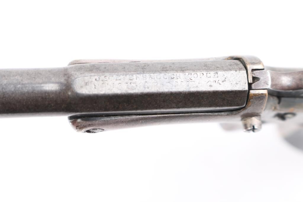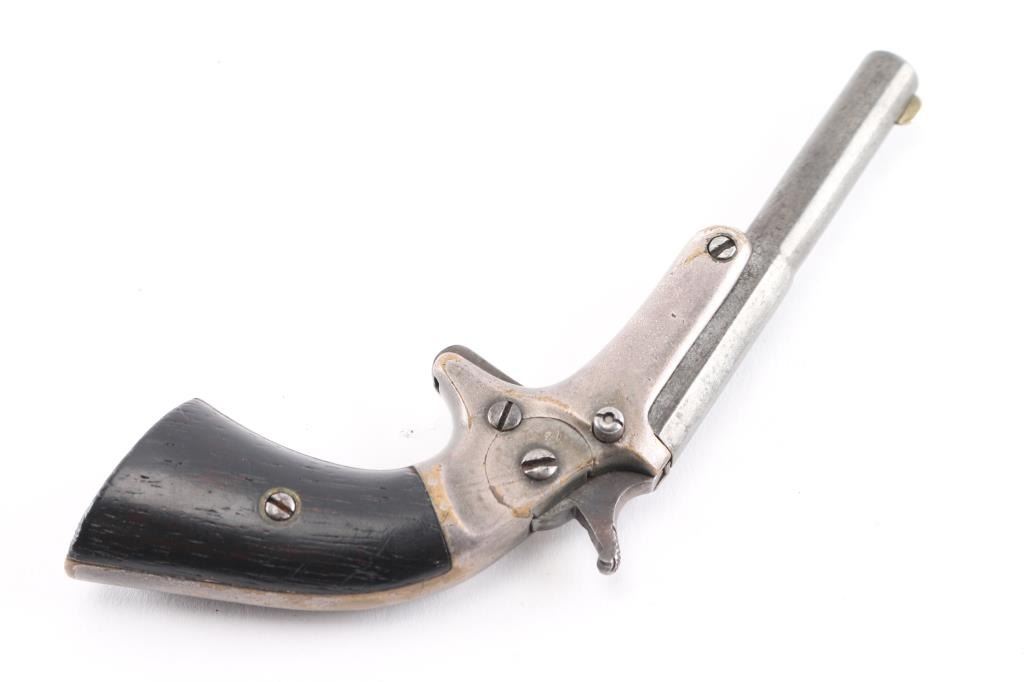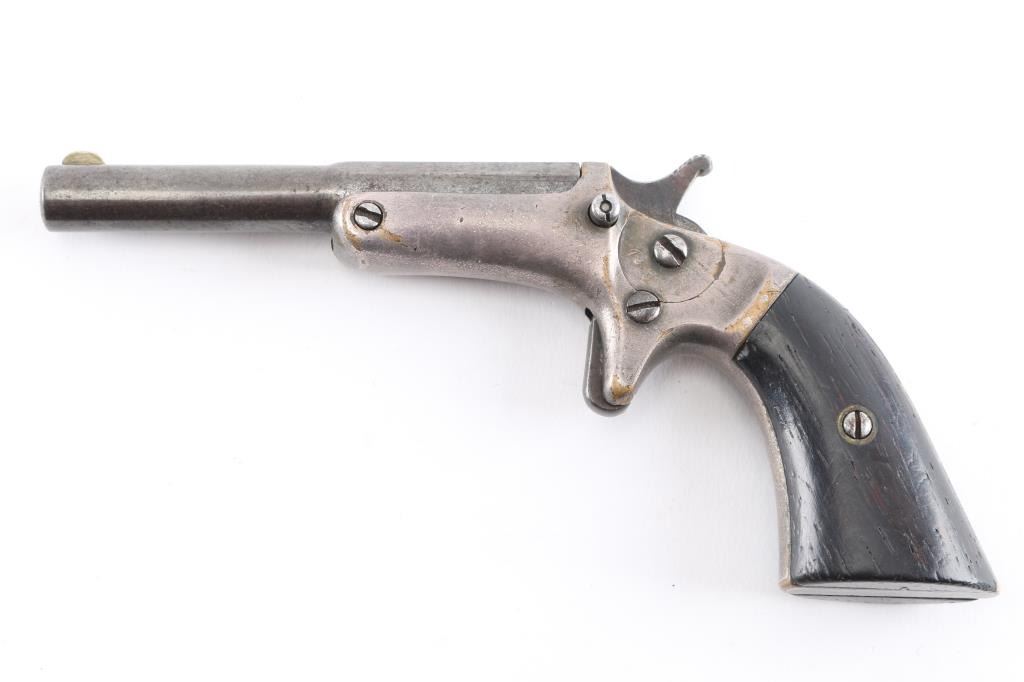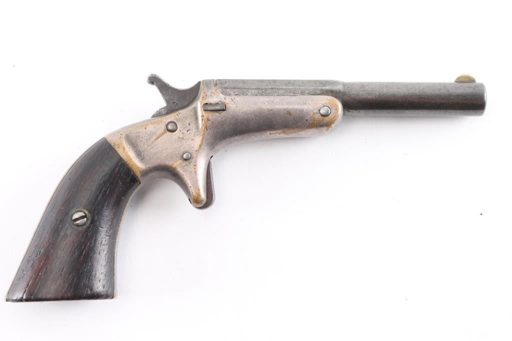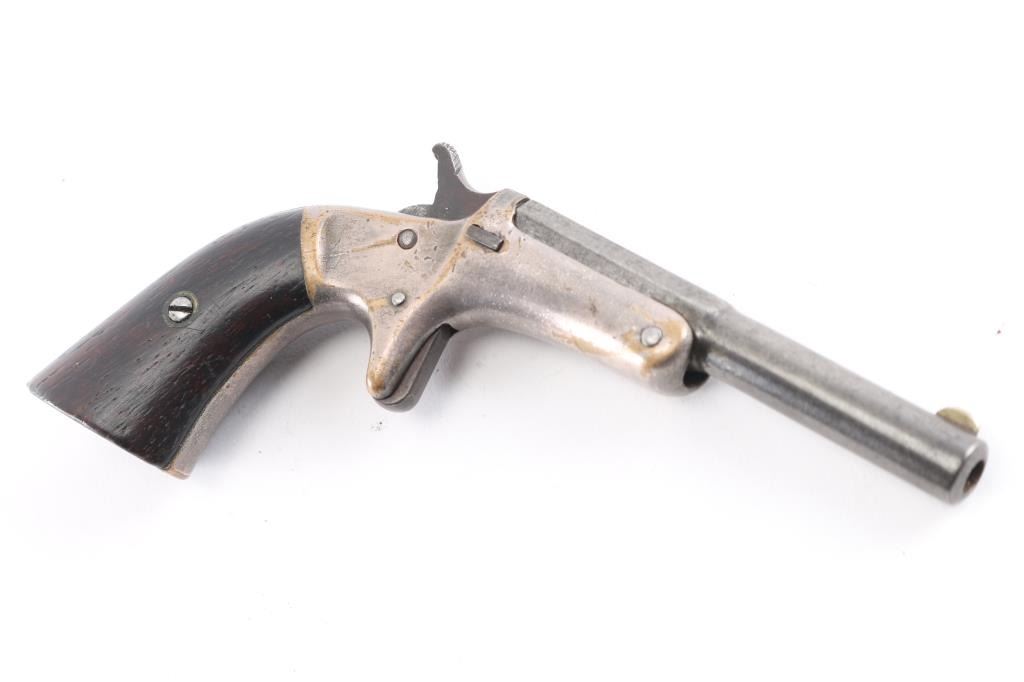 "Old Model" Silver Plated. Old model Silver Plated. Single-Shot. "Tip-Up". 3.5" octagonal to round barrel. Stevens markings on flat of barrel , Sept 6, 1864 patent date. (Very feint) Silver plated brass frame. Smooth rosewood grips. barrel & hammer lock up tight. Bore is fair, scattered light pitting, most of the silver plating remain on the brass frame with handling wear, serial number matched on barrel & grip frame. Barrel has turned a gray patina. German silver front sight.NRA Condition-Good. Antique Firearm.