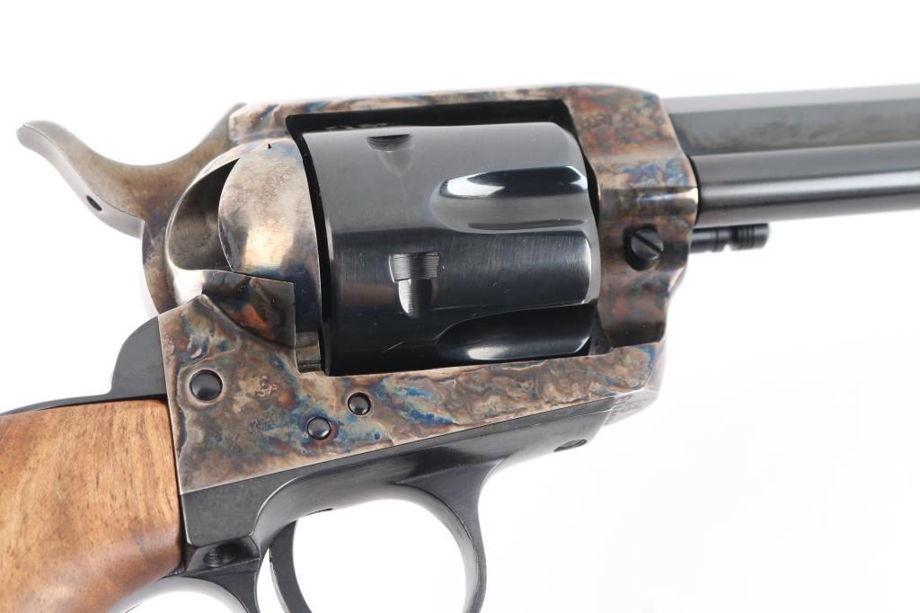 Italian made replica of an 1873 Single Action Army, imported by KC of Harrisburg PA. Features single action operation, blued & case color finish, two piece smooth walnut grips, 4-3/4" octagon barrel, fluted 6 shot cylinder. Bore & charge holes are excellent. Retains 98% finish with minor handling marks. Case colors are fiery, with gray and copper colors. Grips are excellent, with mixed colored figure. Smooth action, tight lock up.Condition is NRA Excellent*** Modern Firearm ***