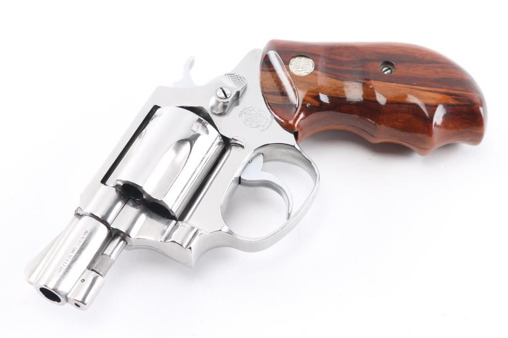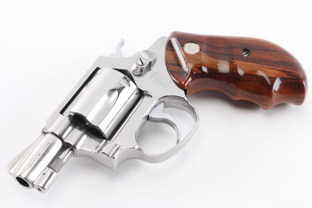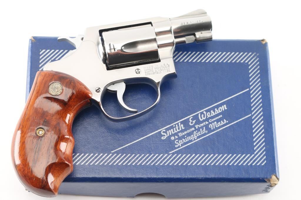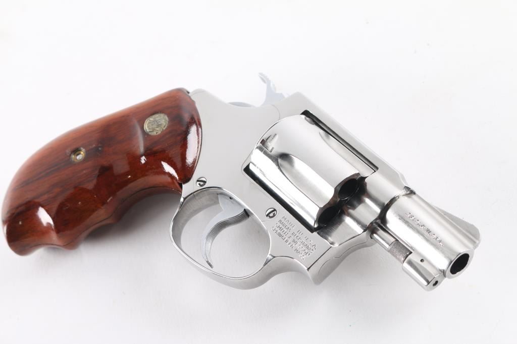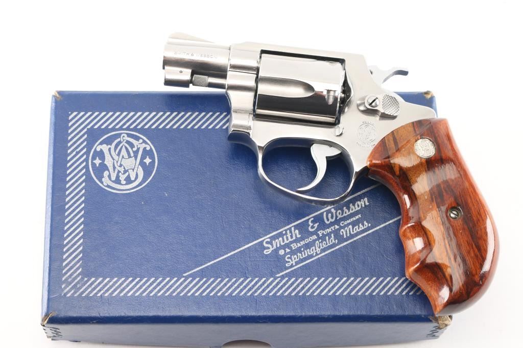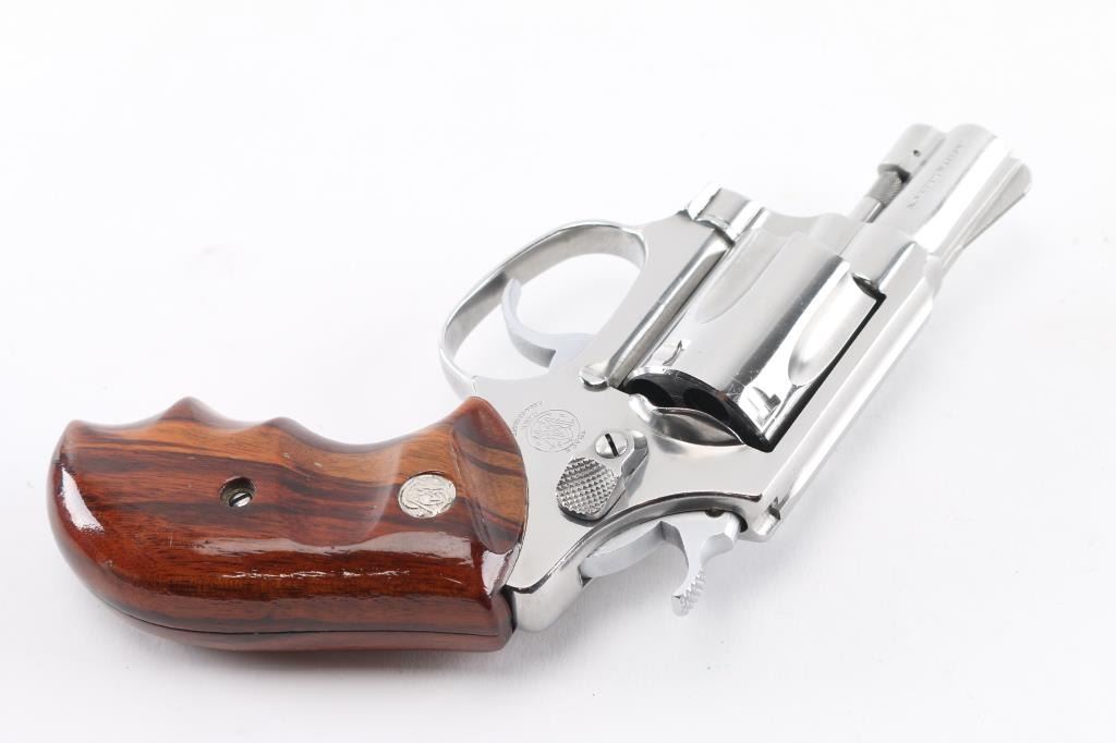 The" .38 Chiefs Special Stainless"No Dash - Pinned Barrel Stainless steel double action J frame revolver manufactured circa 1980/81. Features stainless steel construction, checkered hammer spur, grooved narrow trigger, smooth finger grooved wood grips with S&W medallions, 1 7/8" barrel, ramp front and fixed rear sights, round butt frame. Overall like new condition with few minor handling marks, hardly any drag line on cylinder. bore is pristine. Includes matching label blue S&W box with factory paperwork and cleaning kit.Condition is NRA Excellent - like new*** Modern Firearm ***