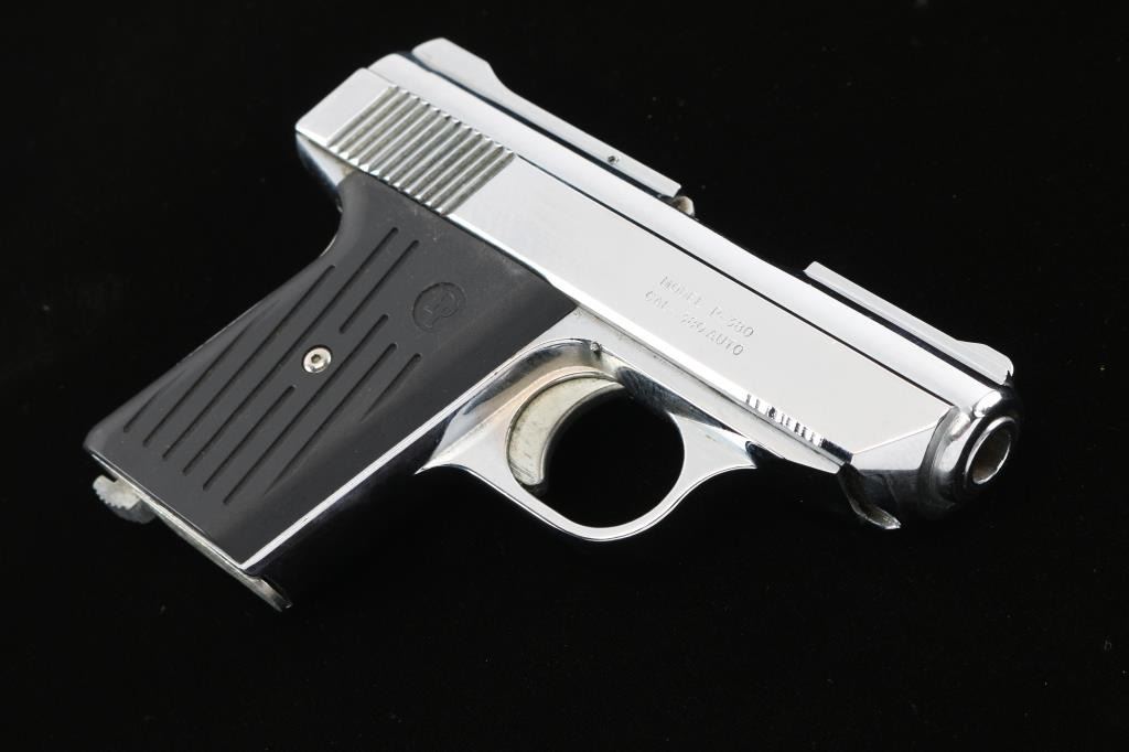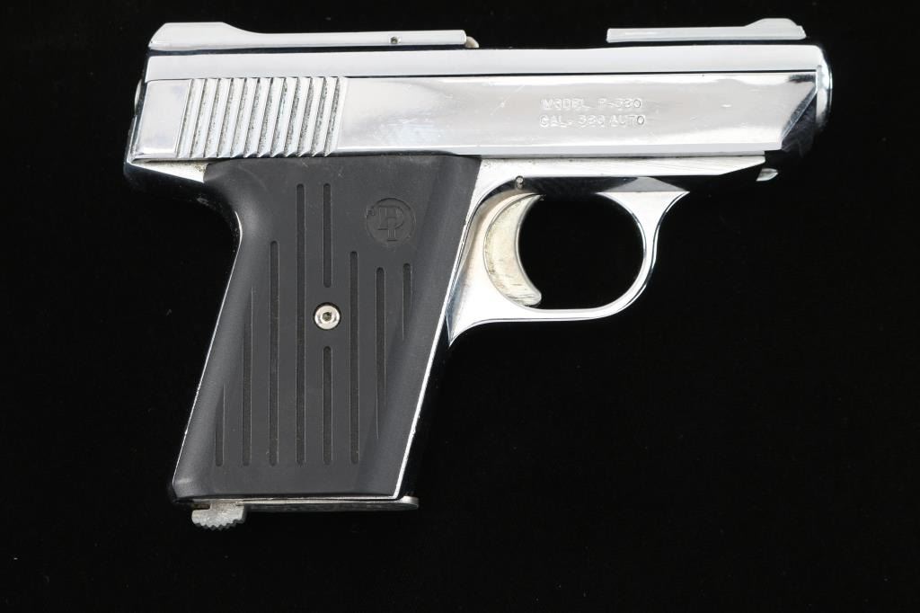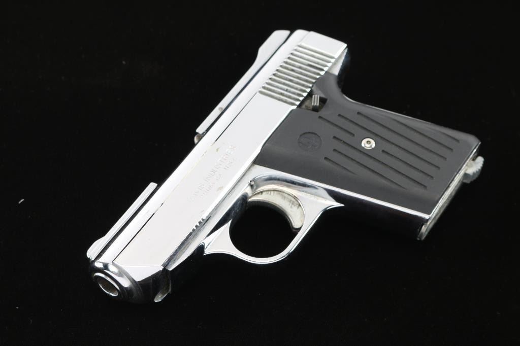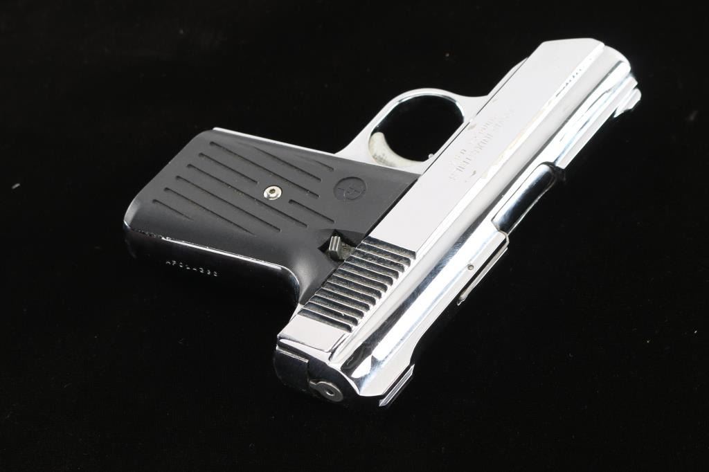 American made striker fired semi-automatic pocket pistol chambered in .380 Auto. Features a chrome finish, 3" fixed barrel, fixed sights, smooth trigger, manual safety on the left side of the frame, heel magazine release, 6 round magazine and factory two-piece black plastic grips. Pistol exhibits the majority of its chrome finish showing edge wear, scratches and scuffs. Action is sound, the bore is very good, needs cleaning. The plastic grips are very good. Condition is NRA Very Good. Modern Firearm.