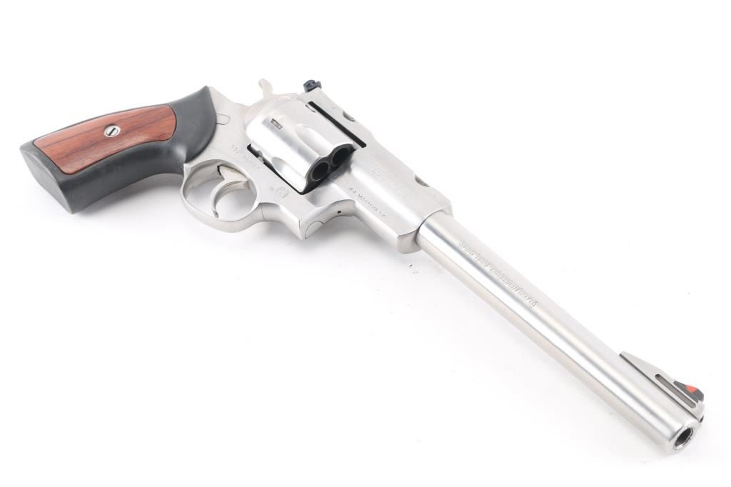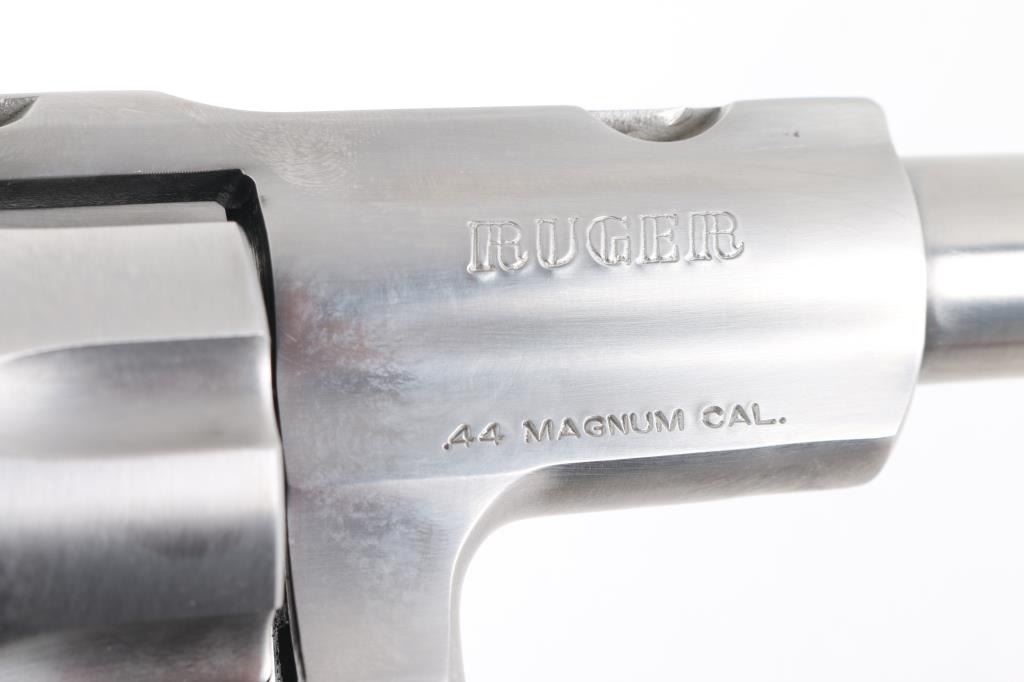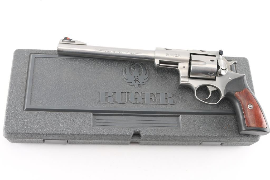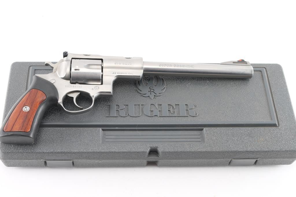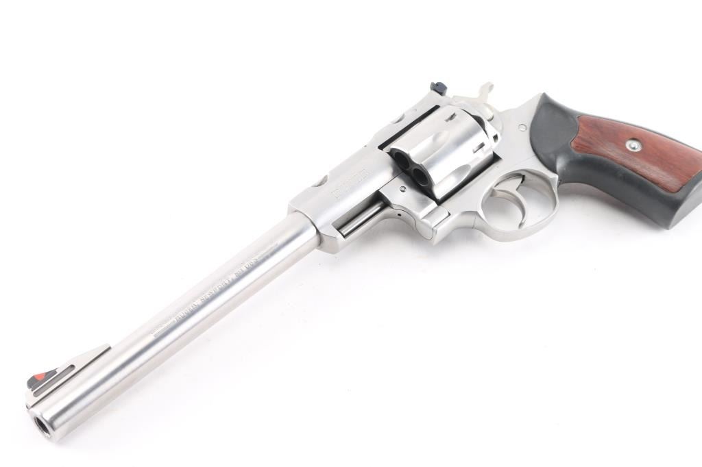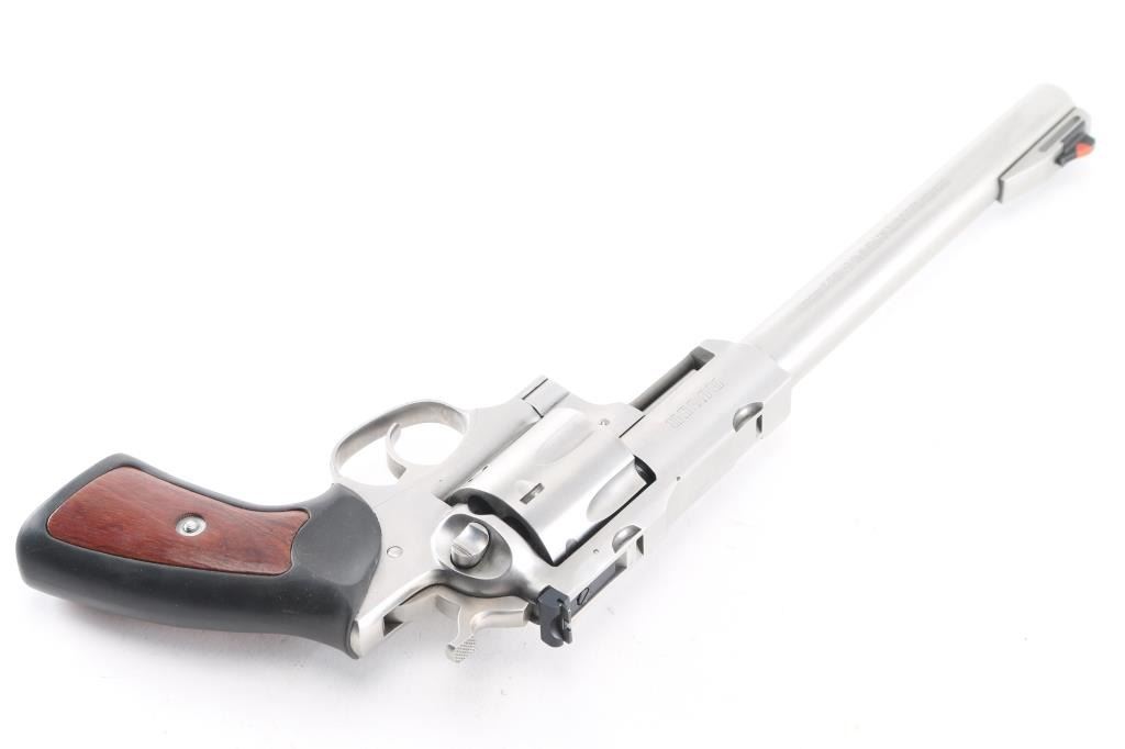 Large frame stainless steel double-action six shot revolver chambered in .44 Magnum, circa 2008. Features a stainless finish, 9.5" barrel with a raised serrated ramp front sight and orange insert, pinned adjustable white square notch rear sight, shrouded ejector rod, fluted six shot cylinder, smooth trigger, checkered hammer spur, transfer bar safety, extended frame with integral scope base cuts in the top strap, and Ruger one piece black rubber target grips with wood inserts. Bore is bright with strong rifling. Retains approx. 98% finish with little to no scratches and or handling marks. Grip is slightly worn. Action is smooth with tight lockup. Comes with a original Ruger gray plastic factory case and manual.Condition is NRA Excellent. ***Modern Firearm***