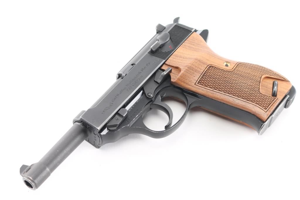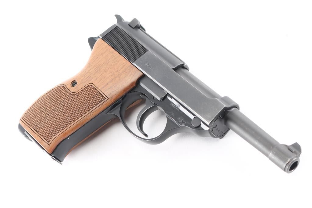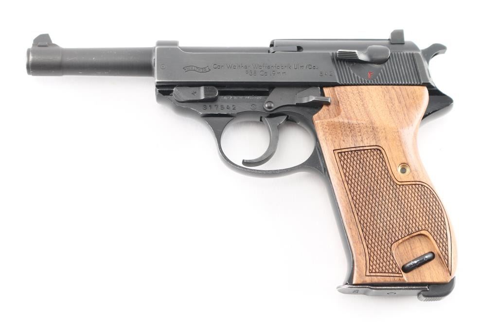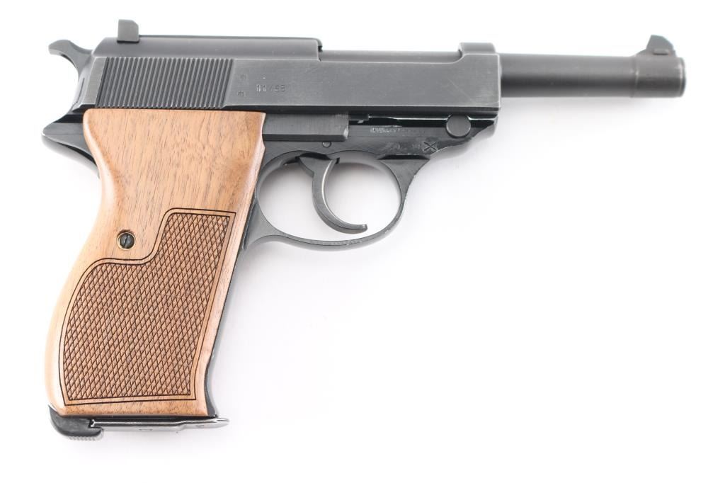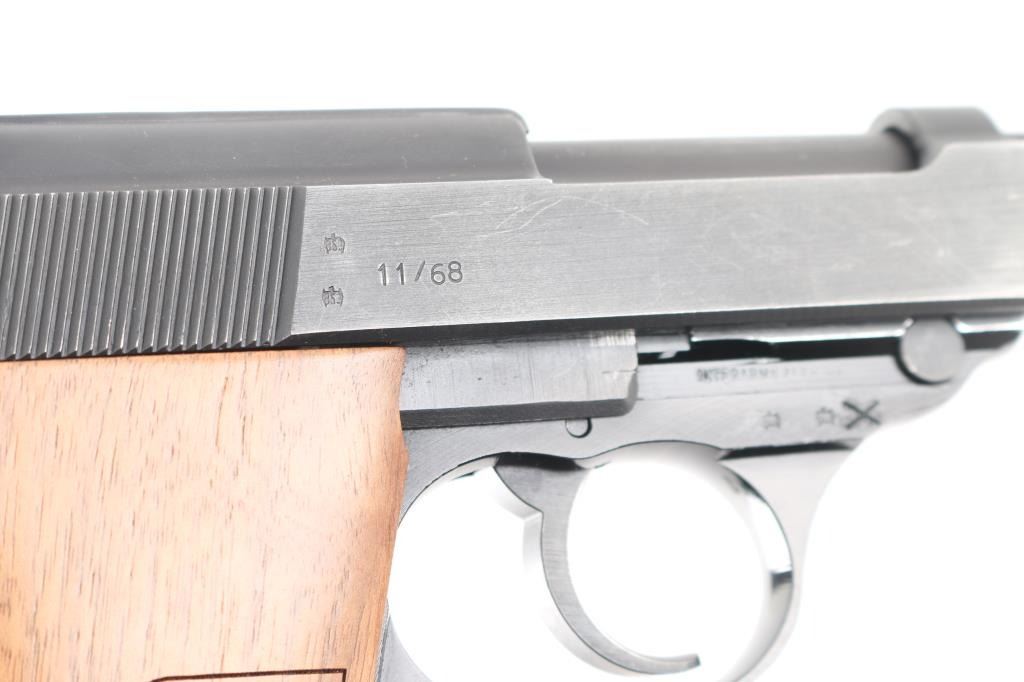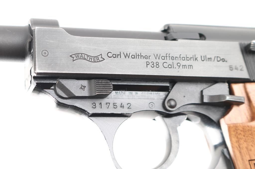 German police surplus semi-automatic pistol, manufactured circa 1968. Features approx 4.75" barrel, dovetailed blade front & notch rear sights, single/double action, decocker safety, heel magazine release, aluminum alloy frame and aftermarked checkered wood grips. Two factory 8 round magazines (Walther banner "P38" marked). Bore is excellent/bright. Finish and grips are excellent, action is smooth/tight. Imported by Interarms. Includes an Interarms box with manual, checkered black plastic grips and a brown leather holster marked "Geco-12/70" .NRA Condition-near Excellent. C&R Firearm.