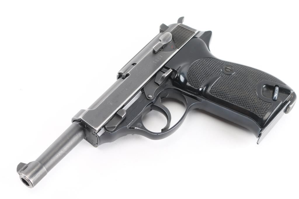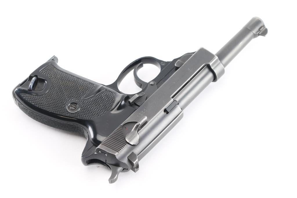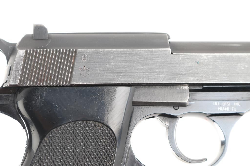 West Berlin Police proofed military semi-automatic pistol chambered for the 9x19mm Luger cartridge. Circa 1964. (The Berlin Police History Collection includes serial 239725 which is stated as entering service in March of 1964.) Made in France and imported by Int. Dist. Inc.. Features fixed sights, slide mounted decocker/safety, heel magazine release, double/single action trigger. Bore is excellent/bright, sharp rifling, slide/barrel are a gray parkerized finish with edge wear scratches. Aluminum alloy frame is finished a gloss black, very good. Black plastic grips are in good shape with minor scratches. All observed numbers match. The French proof mark of crossed cannons with a "3" below the St. Etienne proof, on the right slide, indicates that the firearm was originally intended for a canceled Portuguese contract. West Berlin Police rosette/flower property marking on the trigger guard. Comes with one unmarked blue magazine.Condition is NRA Near Very Good. C&R Firearm.