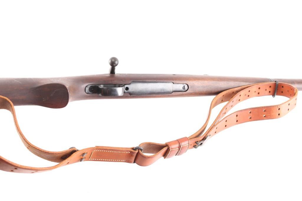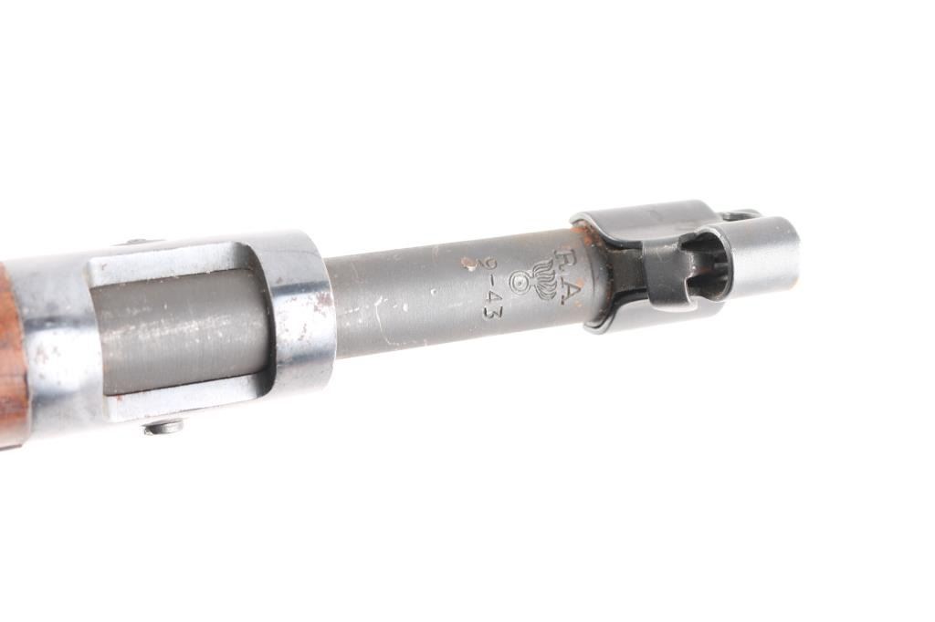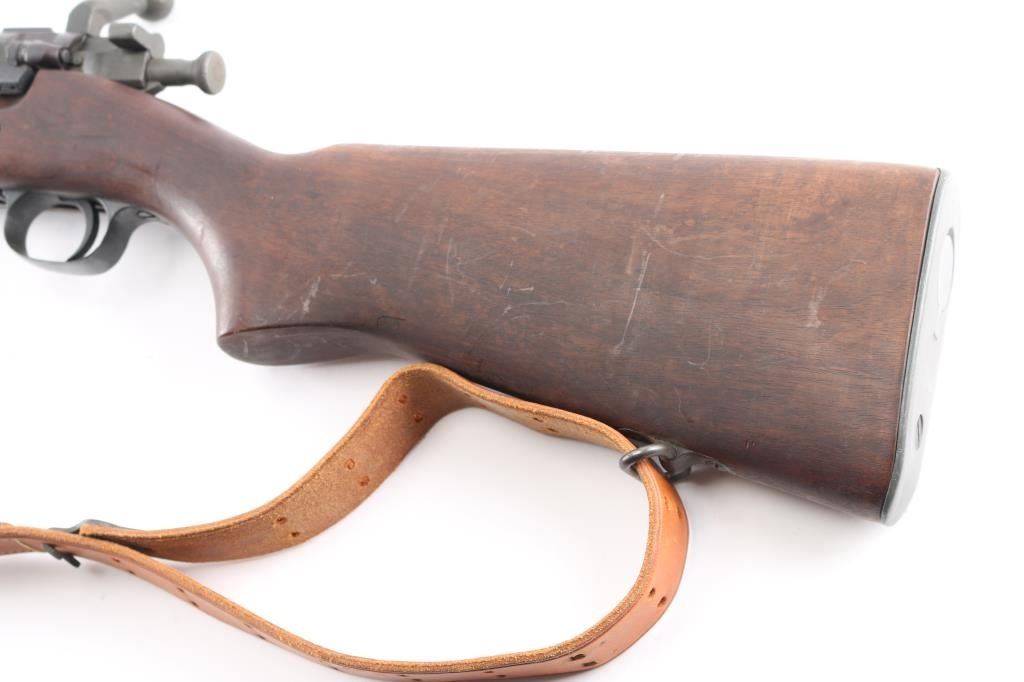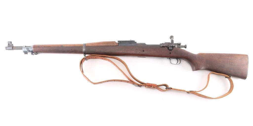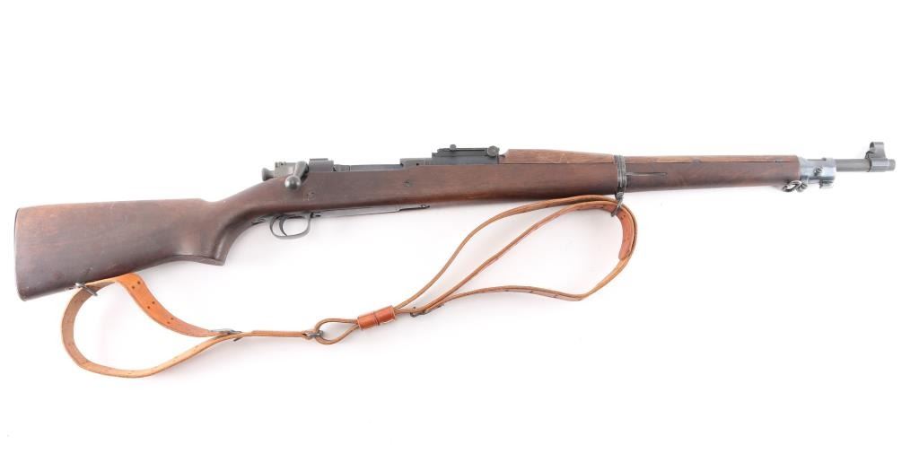 US WWII era military bolt action rifle manufactured circa 1943. Features parkerized finish on most metal, blued barrel bands & bottom metal, walnut shoulder stock with straight wrist, walnut handguard, 24" barrel, blade front sight with detachable hood marked "R" with U.S./flaming bomb, ladder type rear sight mounted at rear of barrel, bent bolt handle, manual safety, magazine cut-off switch, sling swivels, stacking swivel, trap door in butt with smooth butt plate. Rear barrel band is stamped, bottom metal is machined. Bore is good bright, needs cleaning. Retains 90% finish, with sight edge wear, minor scuffs, a little friction wear on the bolt/extractor. Stock is good/sound condition, many minor scratches, no cartouches observed. Color of stock and wood mismatched. Barrel marked "RA / (flaming bomb) / 9-43". Turner Saddlery M19076 type sling attached.Condition is NRA Very Good. C&R Firearm.