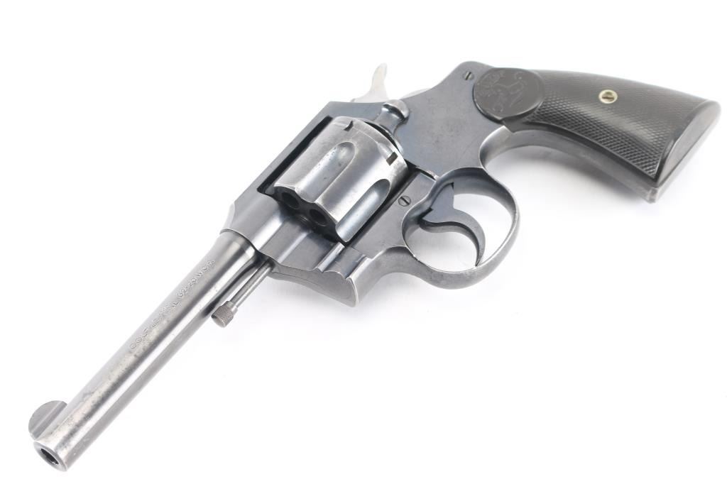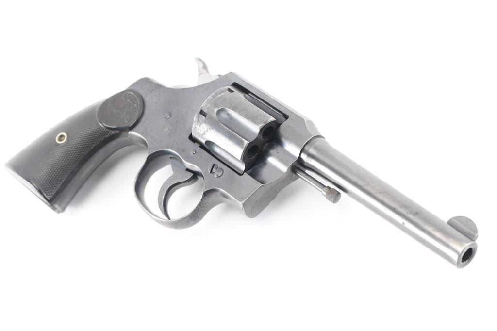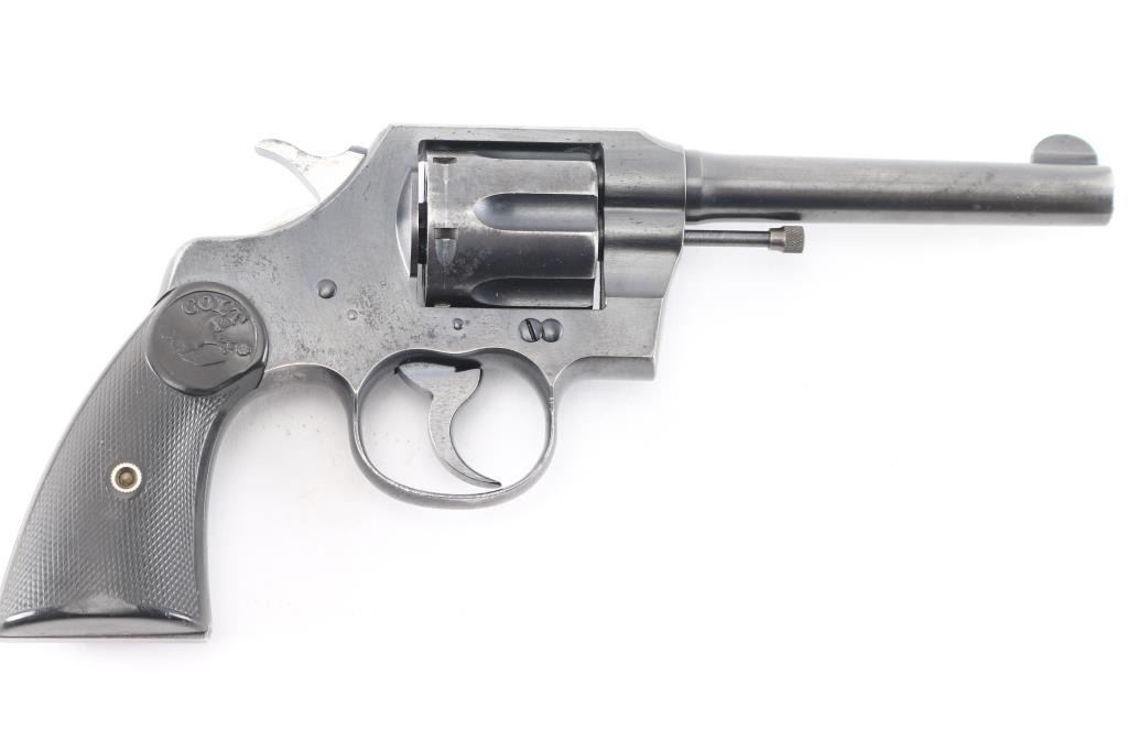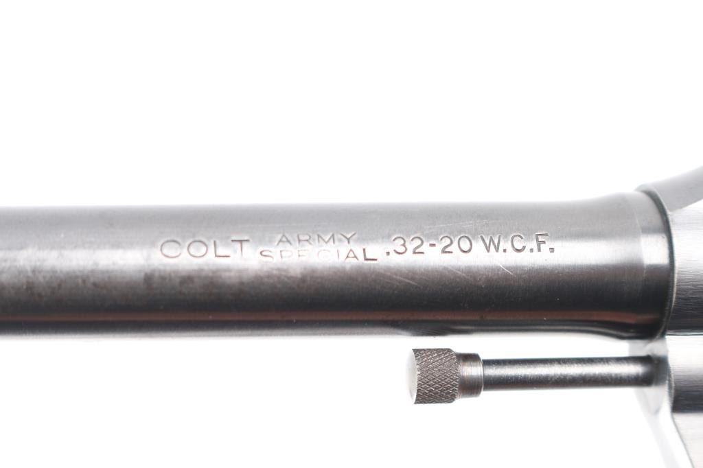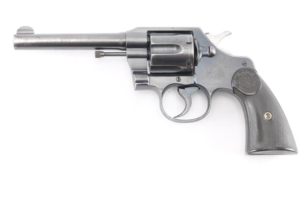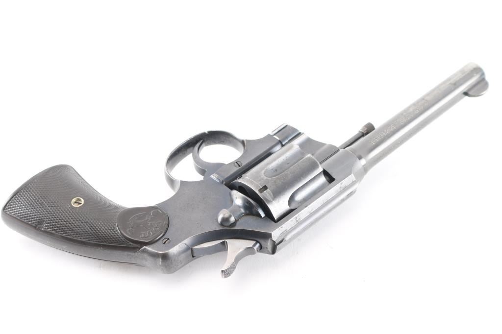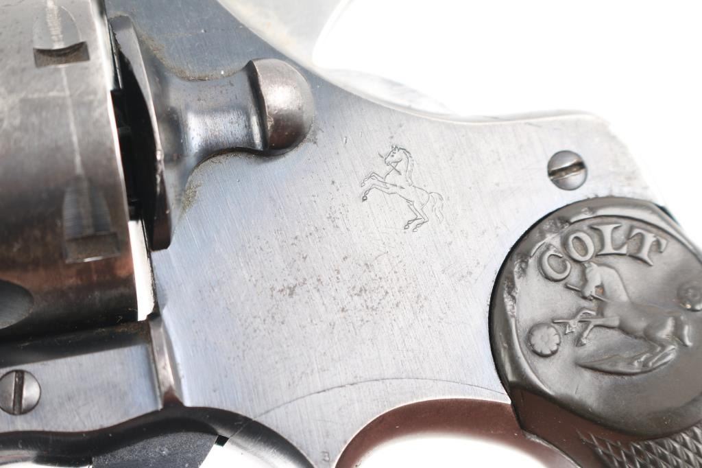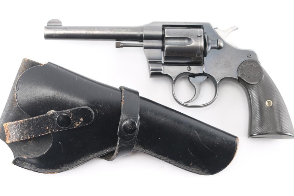 Double-action revolver. 6-rd capacity. Built on the E frame. 4 3/4" round barrel. Round front sight blade, with notch cut rear sight. Exposed extractor rod, blued metal finish. 2-line Colt address, and patent dates on top of the Barrel. "Colt Army Special" on left side of barrel. Checkered hard rubber grips with rampant Colt motifs at the top. This revolver was manufactured in 1927. Original blue finish is about 70% with edge, handling wear, mostly on the barrel/cylinder, some scattered very light pitting, mostly on the right frame, action is crisp/smooth,bore is excellent/bright. Grips are good/sound, a little worn with some minor chips on the edges. Comes with a vintage Brauer Bros black leather snap holster. Condition is NRA Good C&R Firearm.