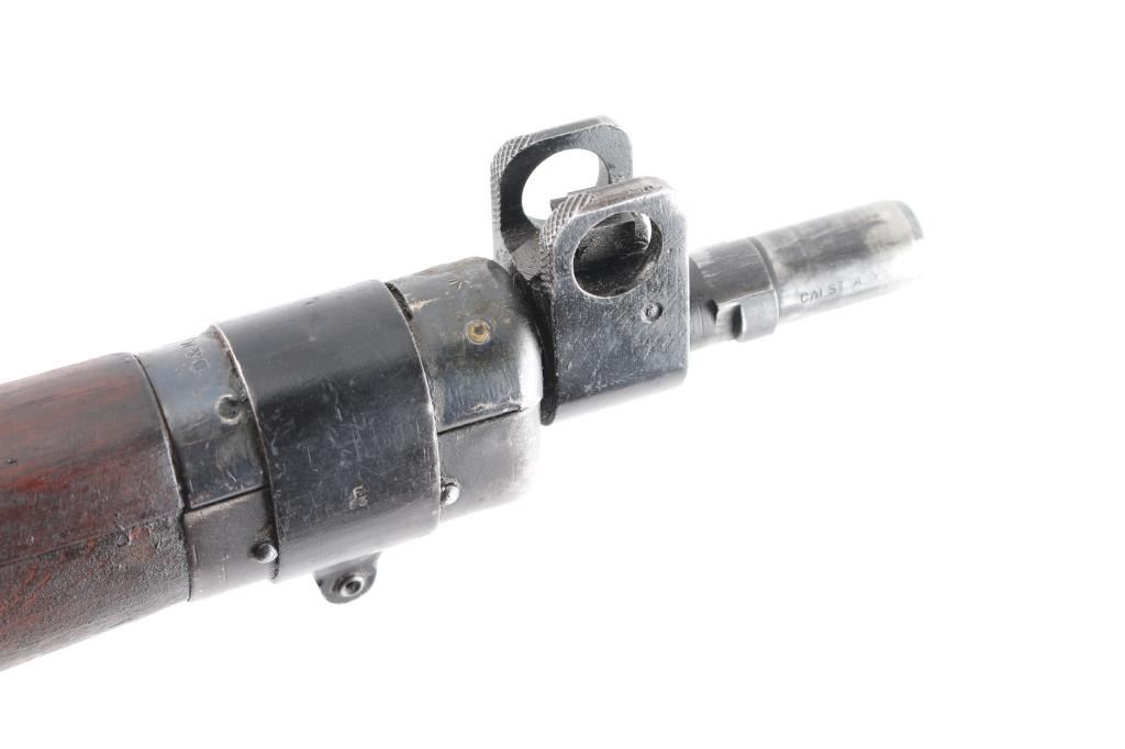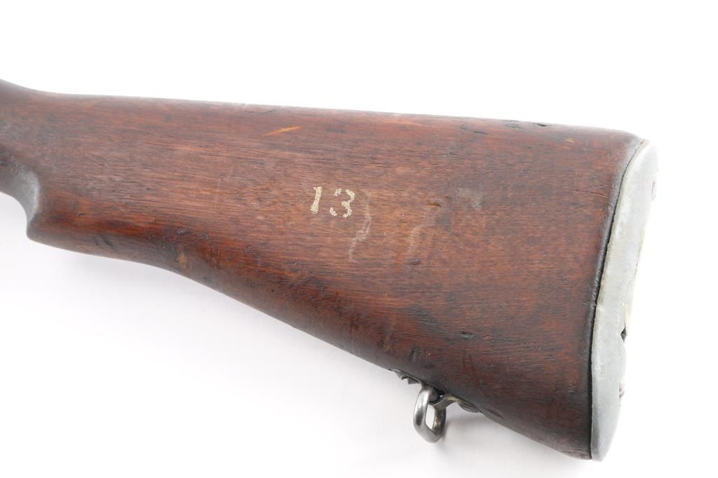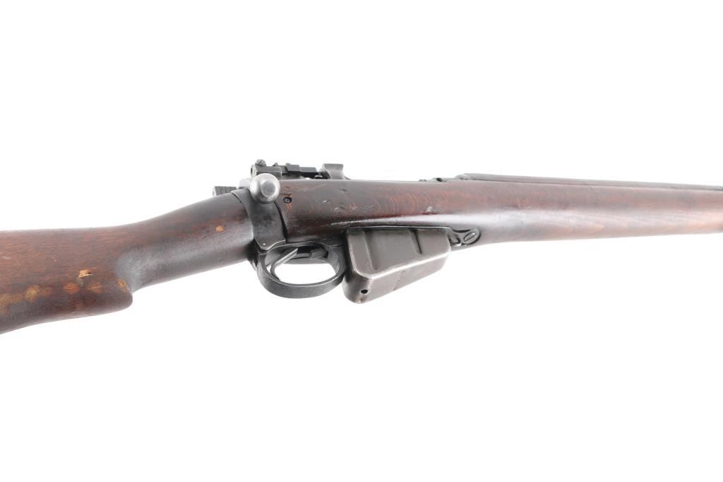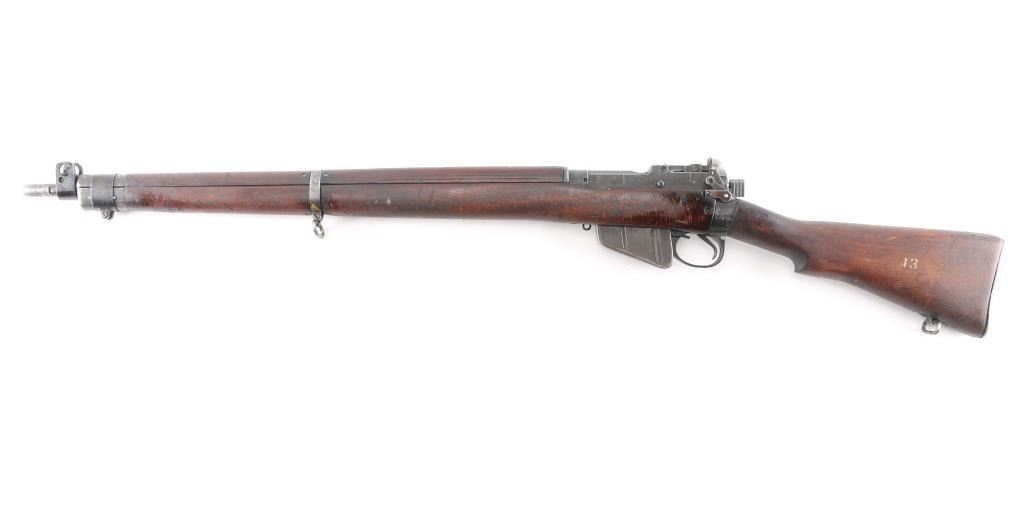 British military magazine fed bolt action service rifle chambered in .303 British, manufactured circa 1943. Features a blued finish, 25.2" barrel with integral bayonet lugs, shrouded patridge front sight, receiver mounted flip-up aperture rear sight graduated to 1,300 yards, two barrel bands, smooth trigger, detachable 10 round magazine, manual safety on the left side of the receiver, solid bolt handle, integral charge loading guide cuts in the receiver, smooth full-length wood handguard, forend, and straight grip shoulder stock with aluminum trapdoor buttplate. The left side of the receiver is marked "No4.Mk1." The barrel shows nitro proof marks and the left butt socket shows broad arrow & serial number markings with a small "43" on the right. Rifles finish showing light scattered edge/handling wear. Action is sound, the bore is good/bright, strong rifling and the wood stocks are good/sound with some minor dents/scuffs.NRA Condition-Good+. C&R Firearm.