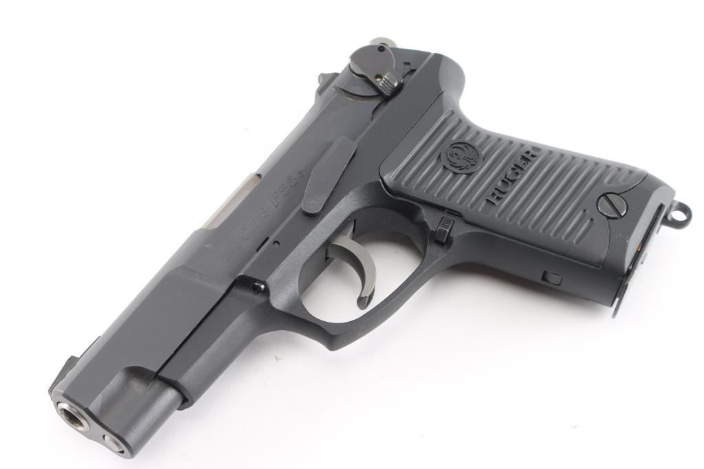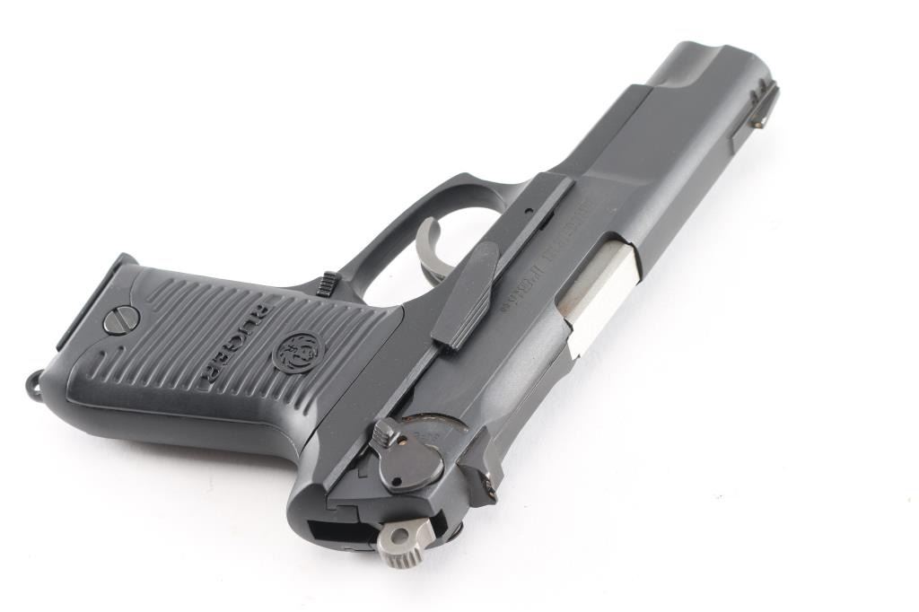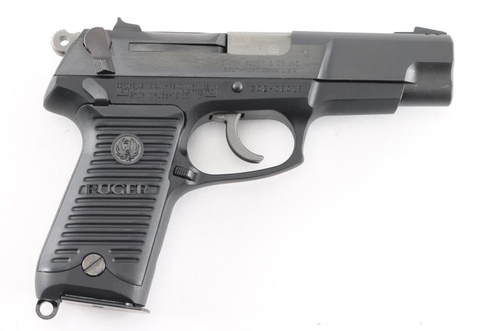 American made, double-action semi automatic pistol chambered in 9x19mm, circa 1990. Features a matte black finished steel slide with polished sides, 4.25" barrel, three-dot sights, ambidextrous safety/decocker, wide smooth trigger, serrated round hammer spur, grey finished alloy frame, ambidextrous push button magazine release, lanyard loop and Ruger two-piece grooved black synthetic grips. The metal finish looks good with very minor signs of handling. Grips look like new. Bore looks great, bright. Comes with original black plastic factory case, owners manual, lock, magazine loader and one spare magazine. (2) total Condition is NRA Very Good+. Modern Firearm.