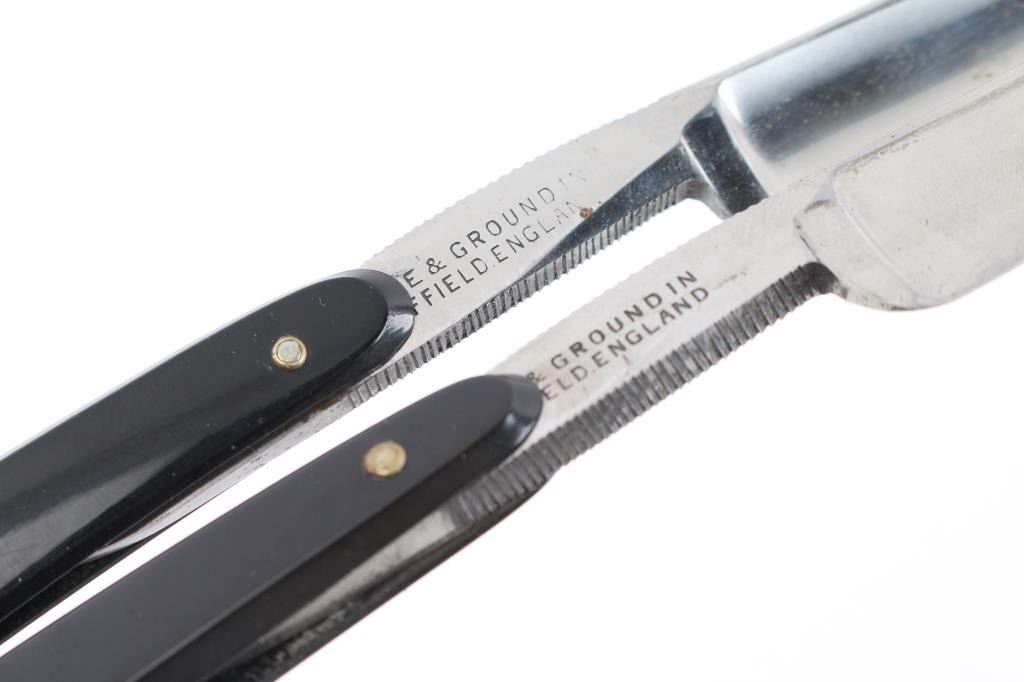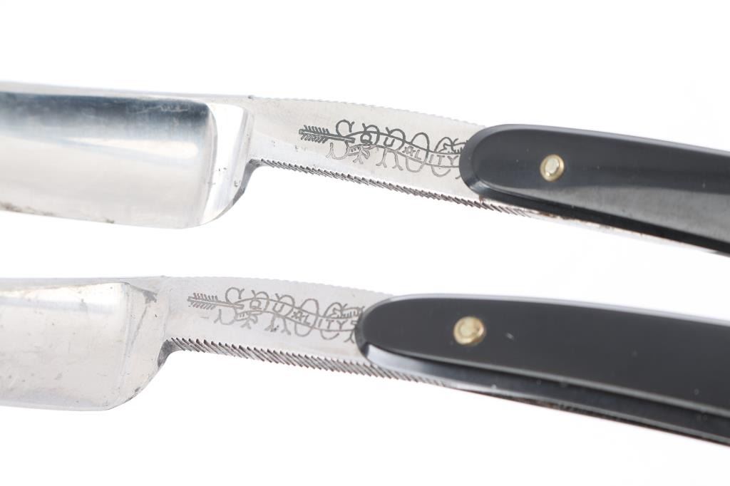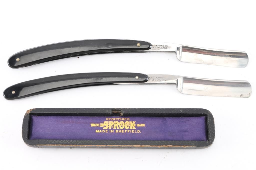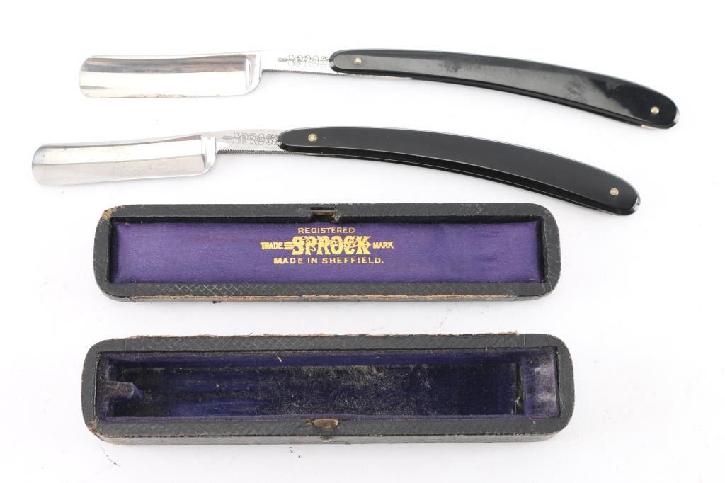 Lot of 2 high quality razors by Sprock of Sheffield, England in their original case. Turn of century era. Black horn scales, original polish in very good plus condition.