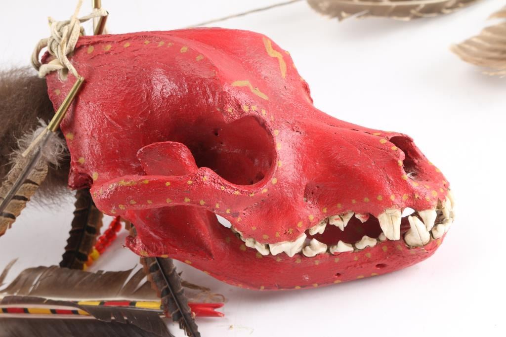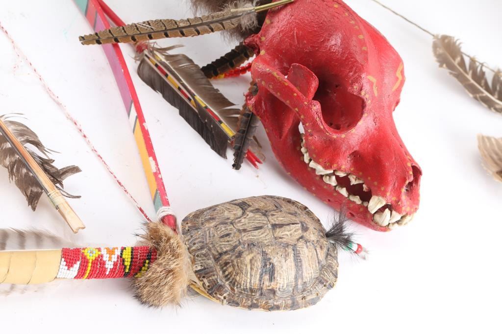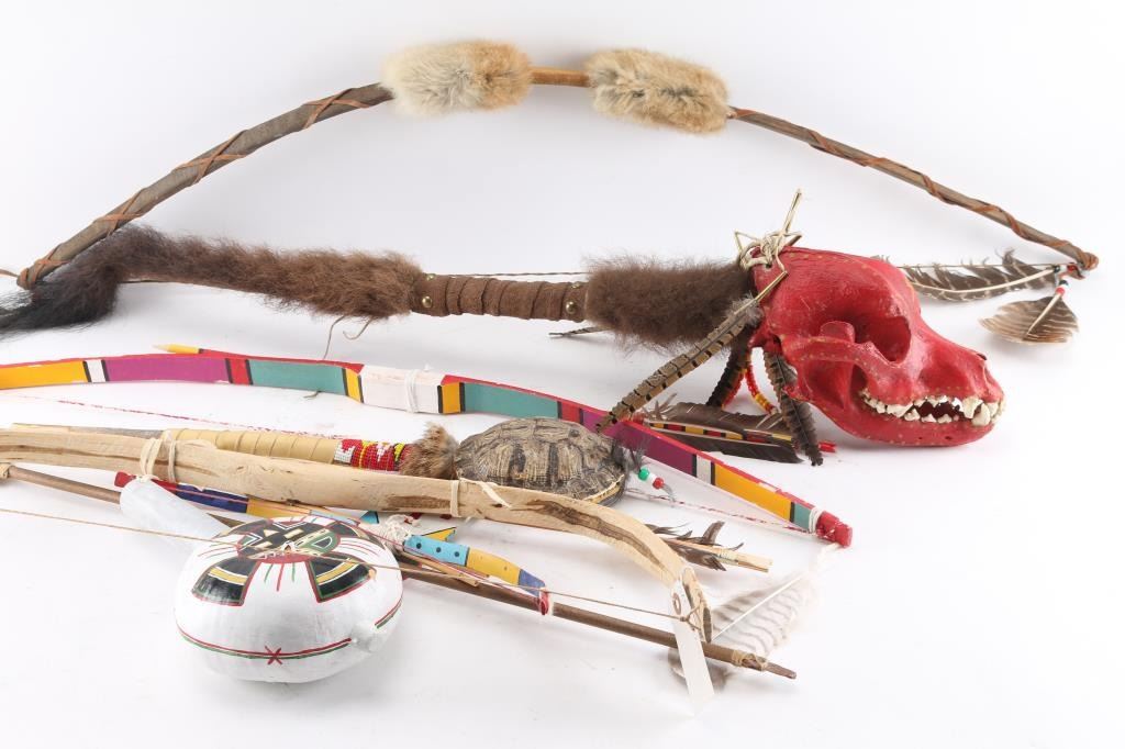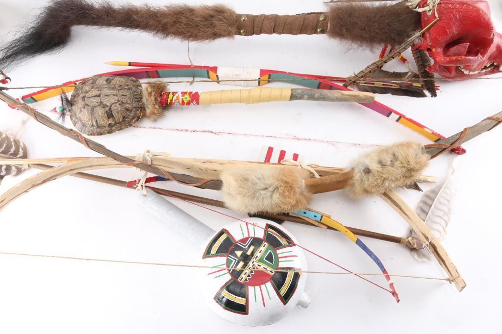 Turtle rattle, Gourd rattle, Skull dance wand, and 5 Bows and arrows.