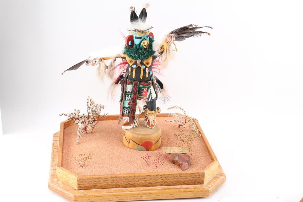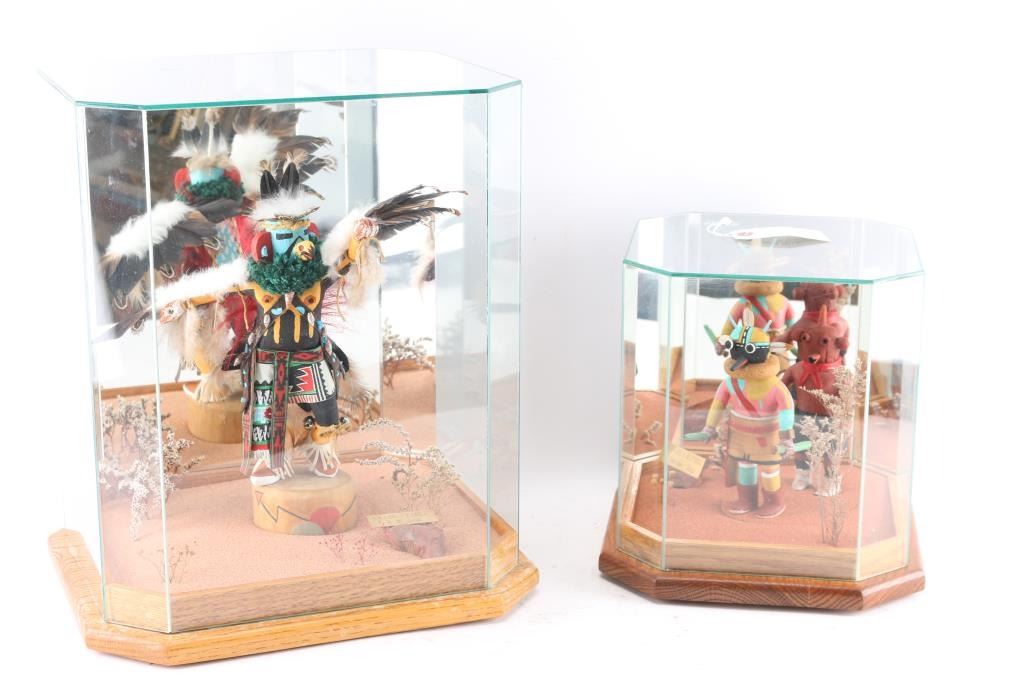 (1) Eagle or Kwahu kachina by R. W. Jean with desert setting. In glass case measuring 17" tall by 13 1/2" wide and 11 1/2" deep, with mirror background. (1) Mudhead and Wupamo kachinas in glass case measuring 11" tall and 9 1/2" wide and 9 1/2" deep with mirror background and desert setting. Both in good condition. LOCAL PICKUP ONLY. CANNOT BE SHIPPED.