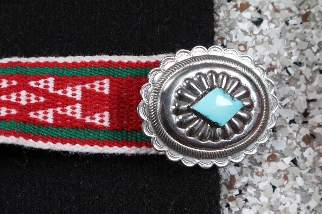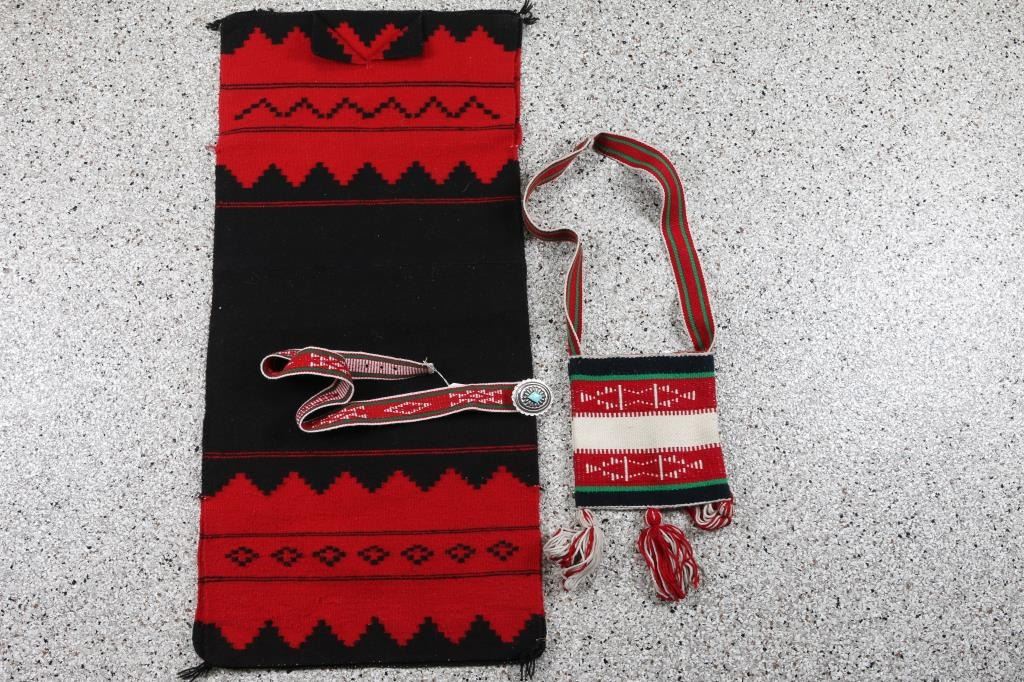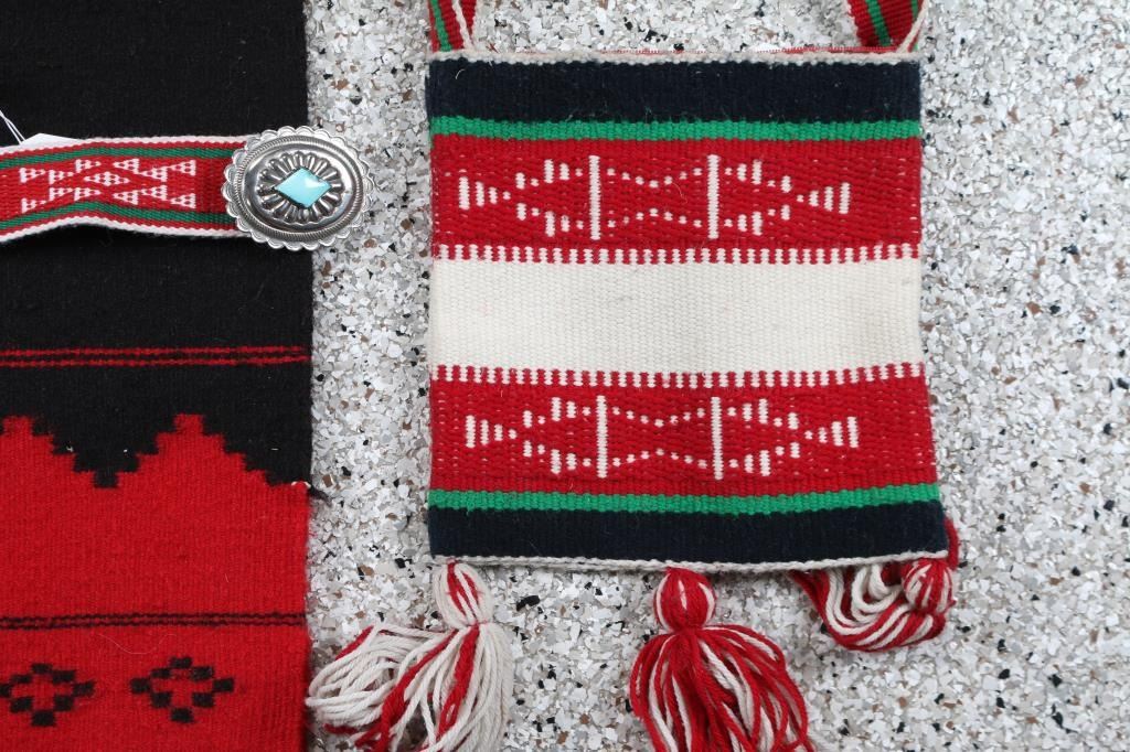 Red & black textile poncho, Textile purse in red white and black, textile belt with sterling and turquoise buckle maker marked Winnie Jamon.