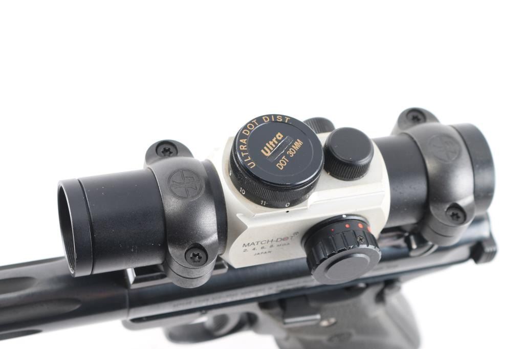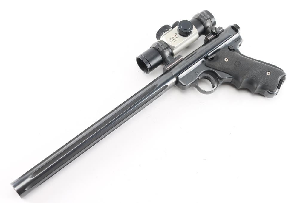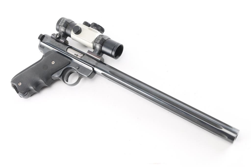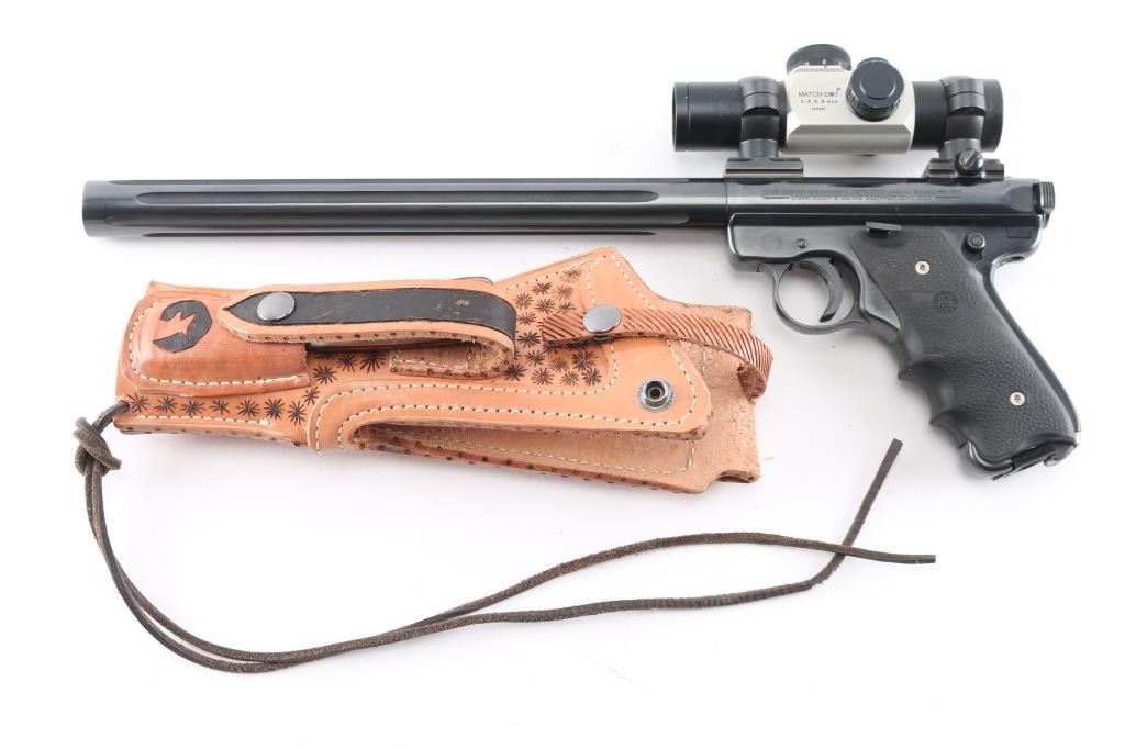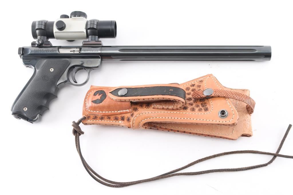 Semi-automatic rimfire pistol, features a blued finish, 12" fluted heavy bull barrel with no provisions for sights, mounted Ultradot red-dot scope, serrated trigger with adjustable stop, manual safety, heel magazine release and bolt release lever. Hogue textured black rubber finger groove wrap-around grip, checkered black rubber backstrap. Bore is bright with strong rifling. Retains approx. 98% finish with slight edge wear at muzzle. Grip is excellent and scope is clear. Includes one magazine, holster with small Damascus knife. NRA condition is excellent. ***Modern Firearm***